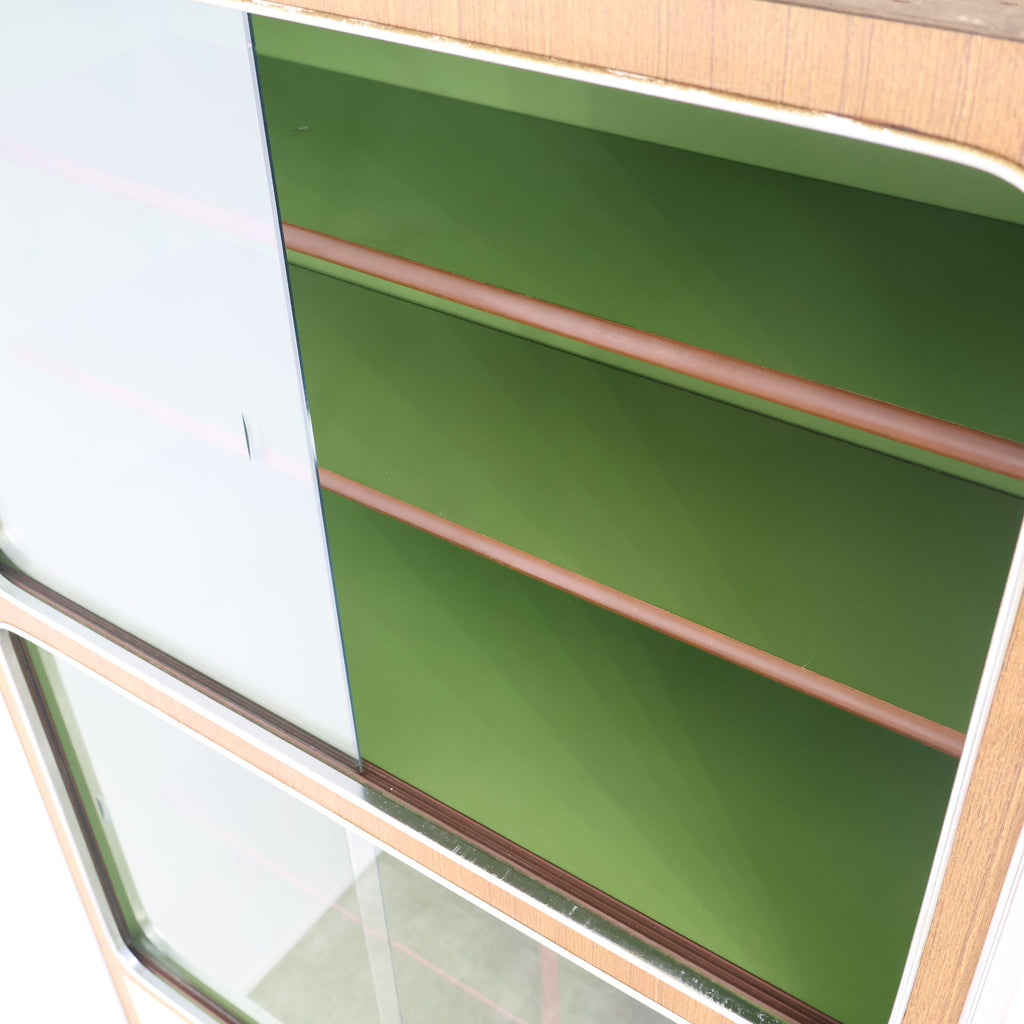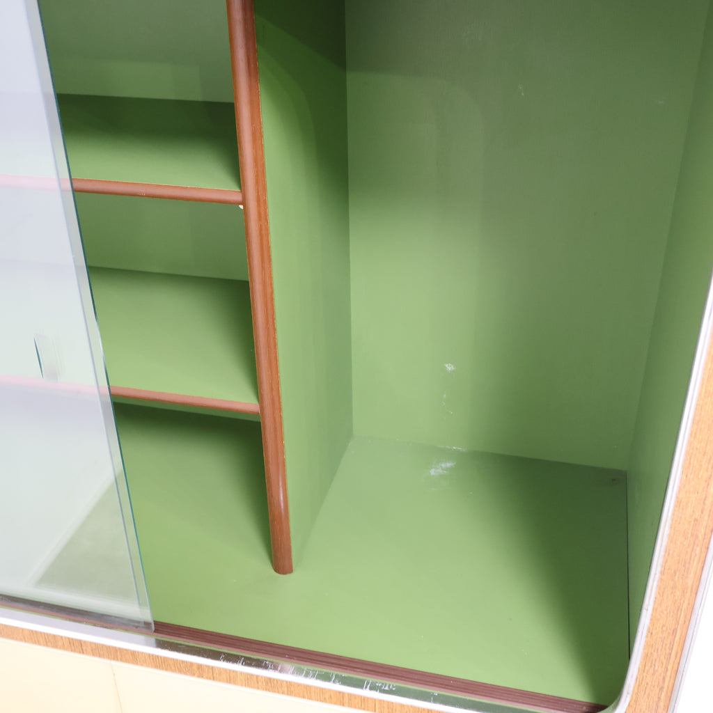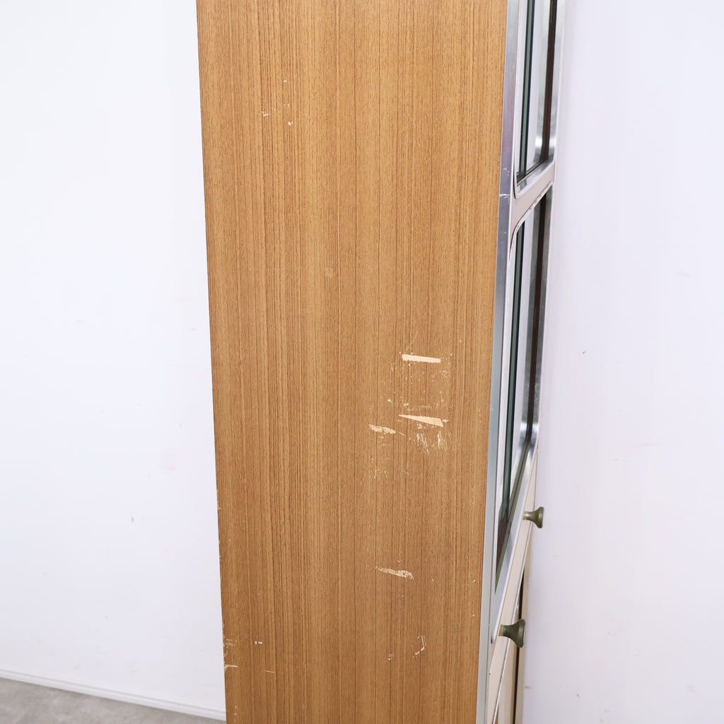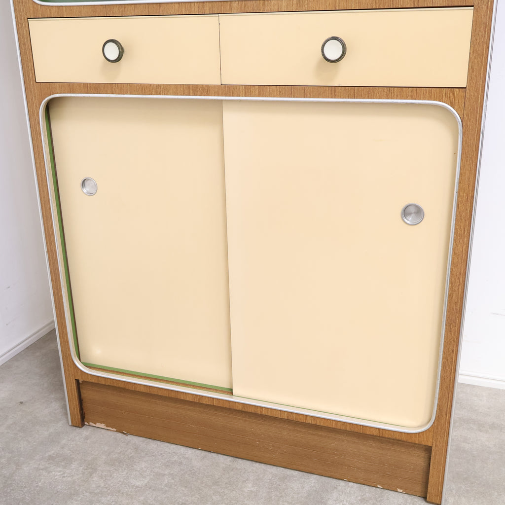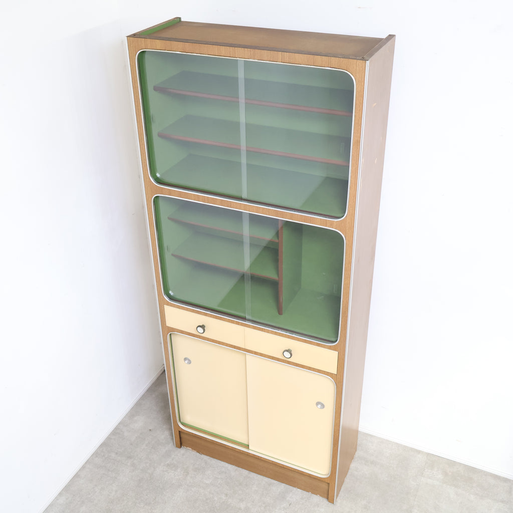 木目のフレームに、丸みのあるガラス窓とやさしいクリームカラーの引き戸を組み合わせた、昭和レトロらしい佇まいのキャビネット。