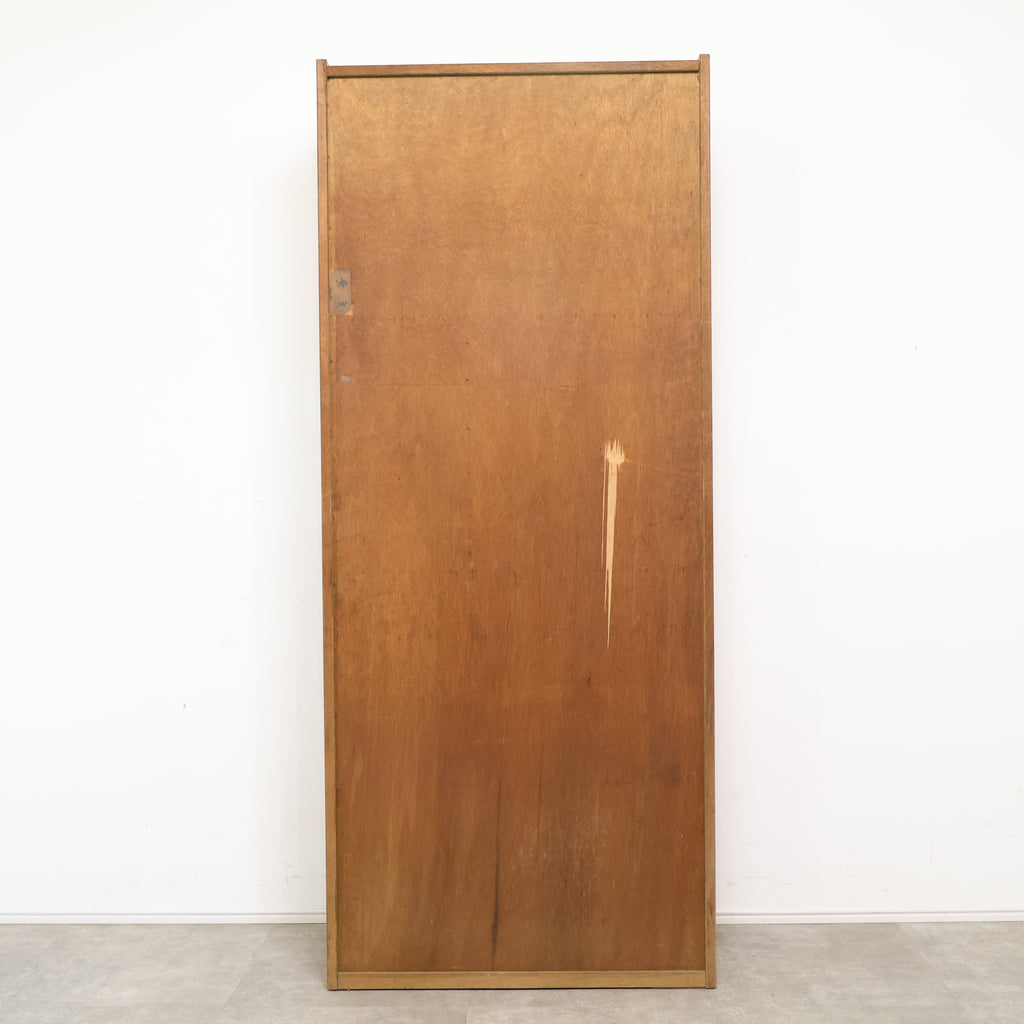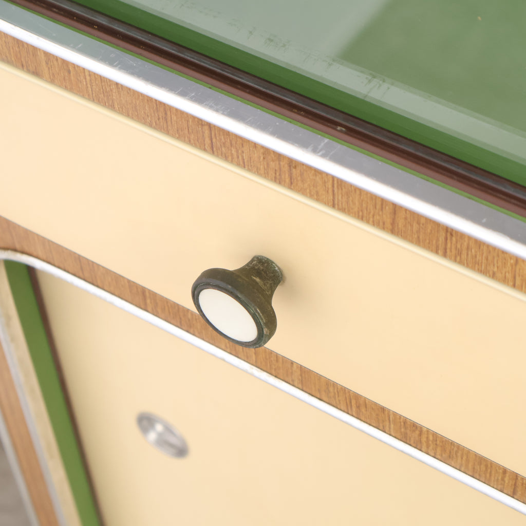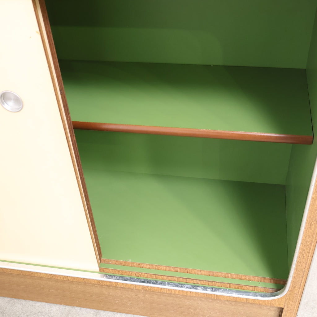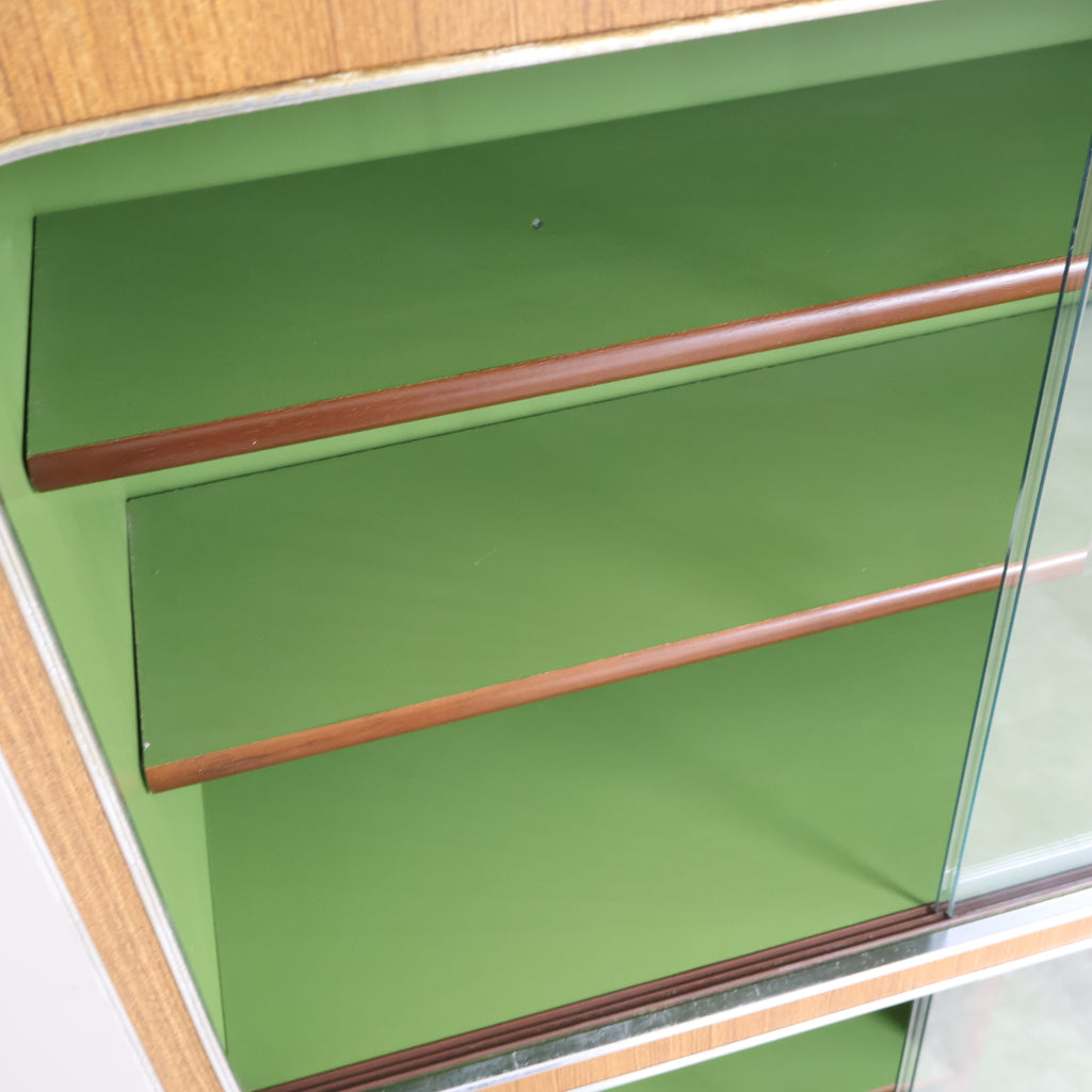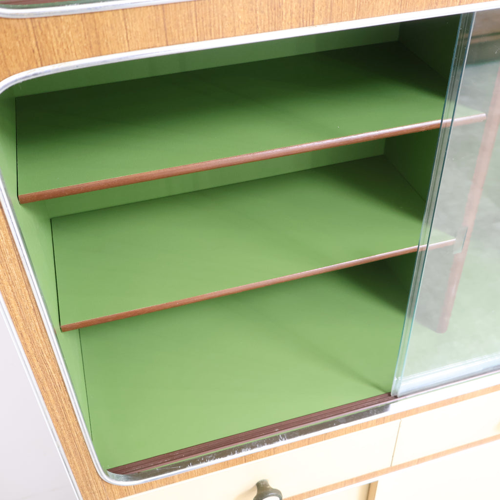 木目のフレームに、丸みのあるガラス窓とやさしいクリームカラーの引き戸を組み合わせた、昭和レトロらしい佇まいのキャビネット。