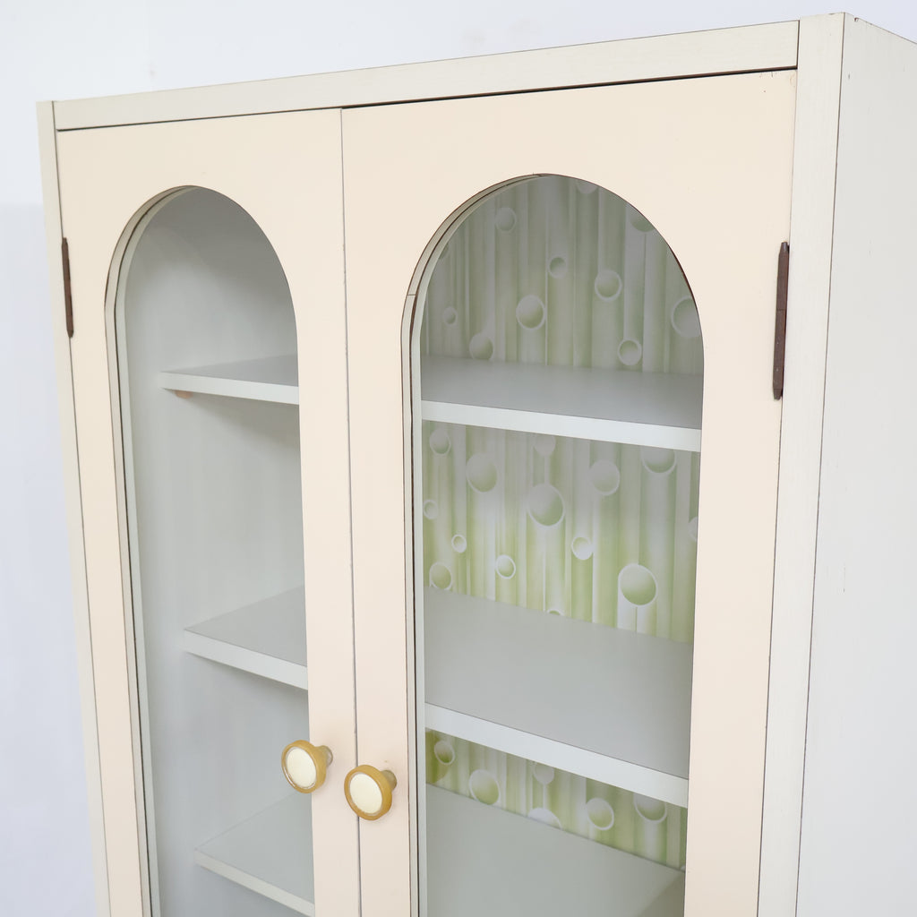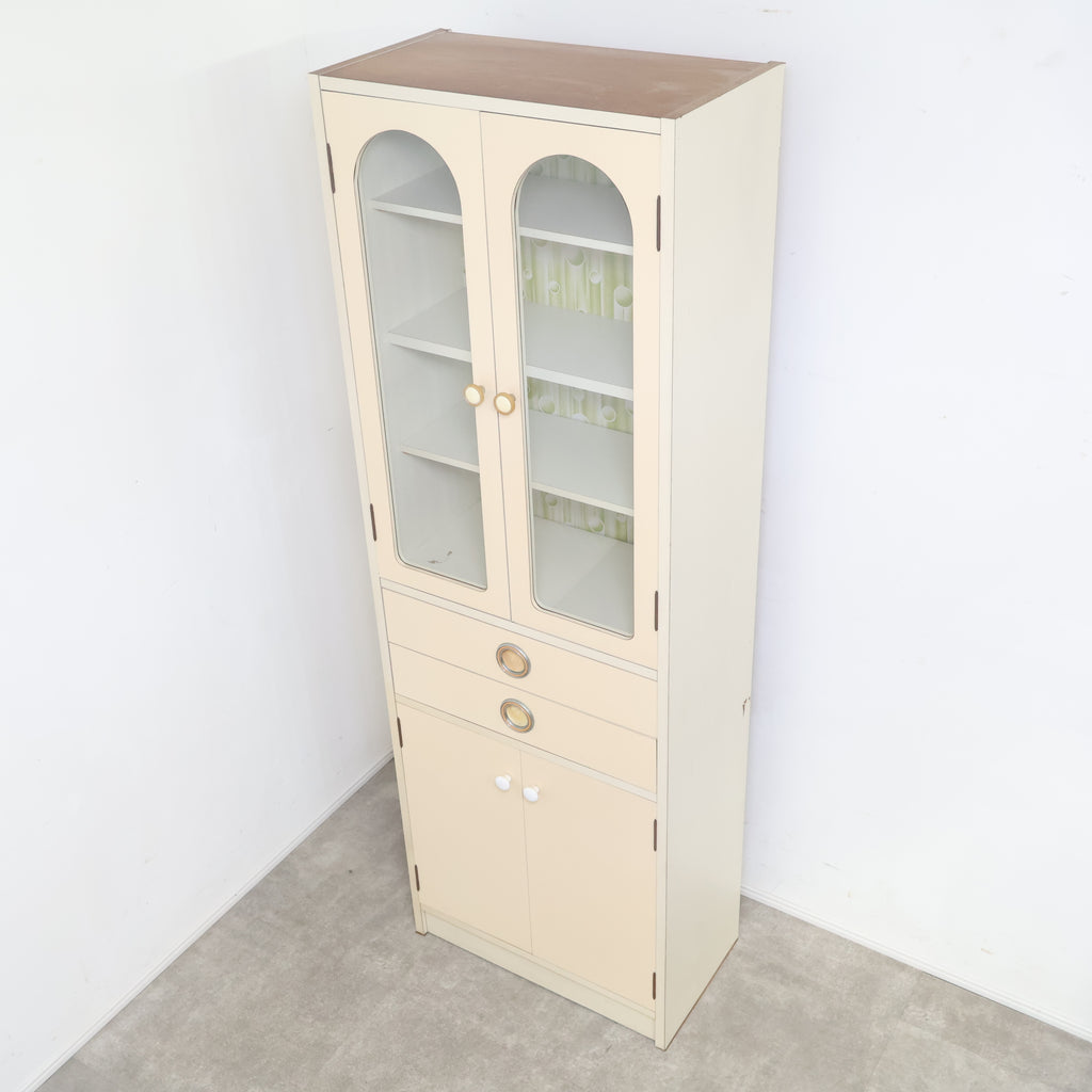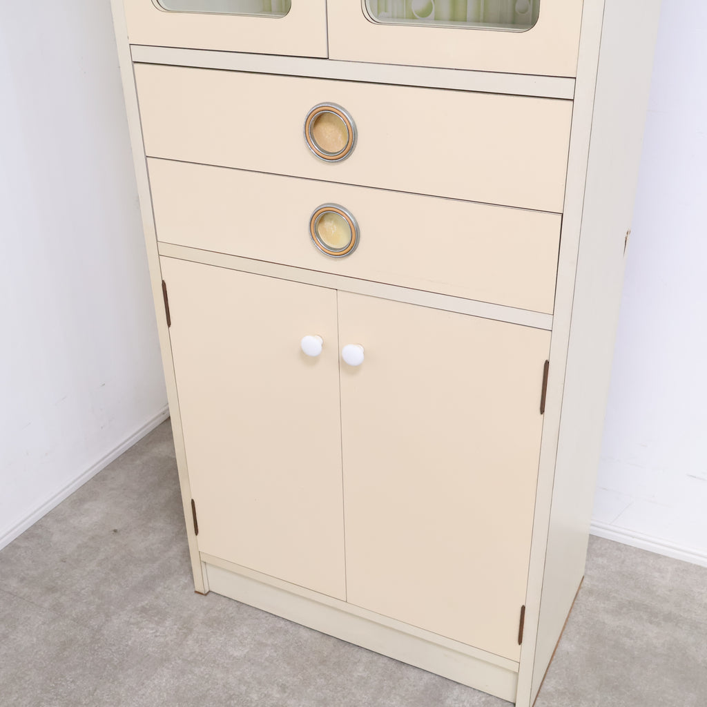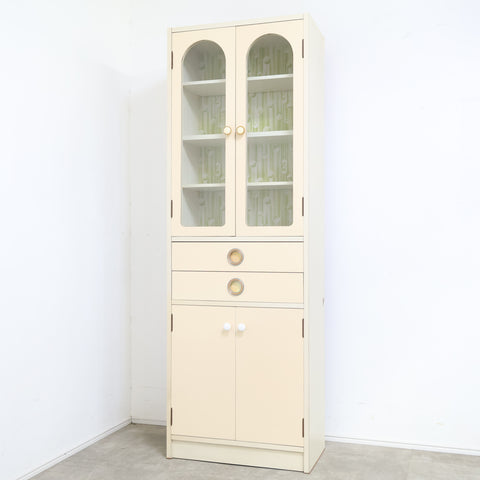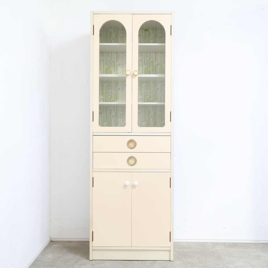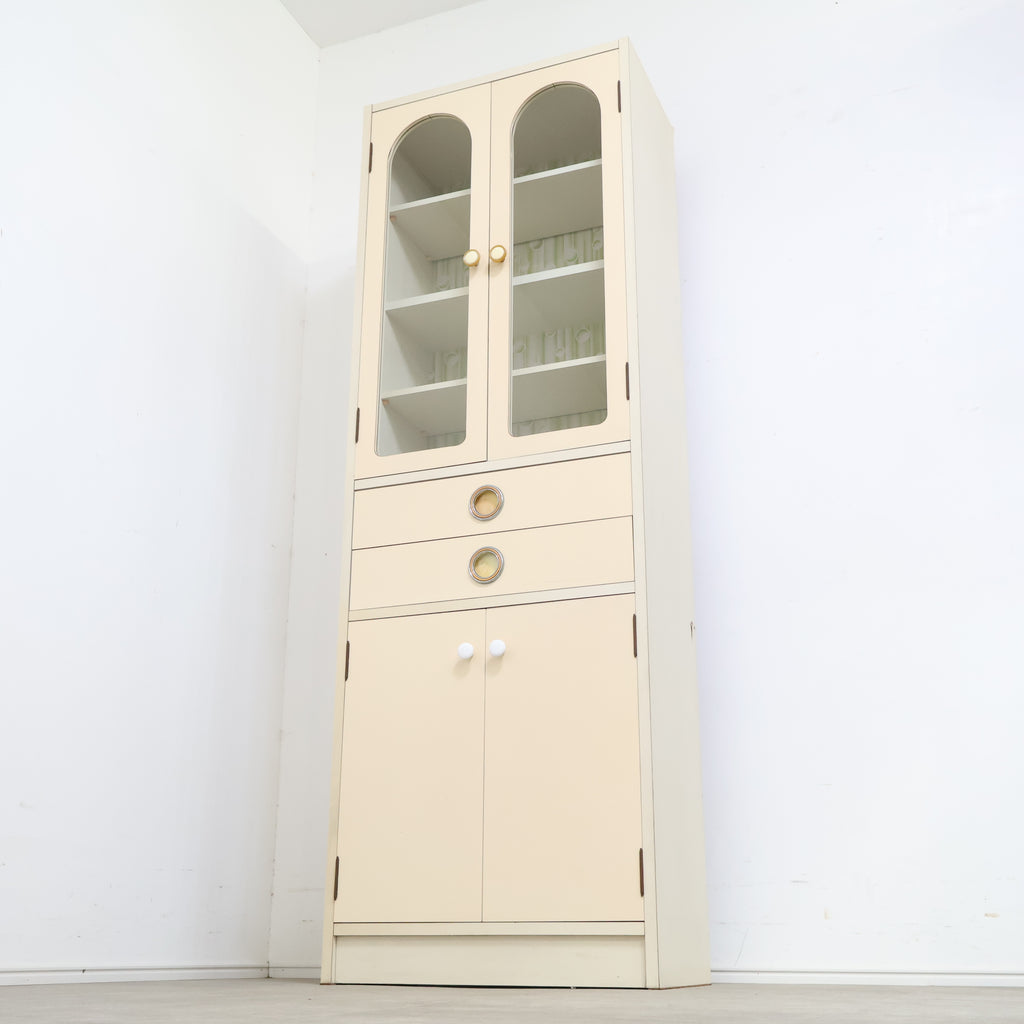 やさしいクリームカラーと丸みのあるガラス扉が、どこか懐かしく温かい空気をまとった一台。上段は見せる収納として、食器やグラス、雑貨を並べるだけで絵になる存在感があります。