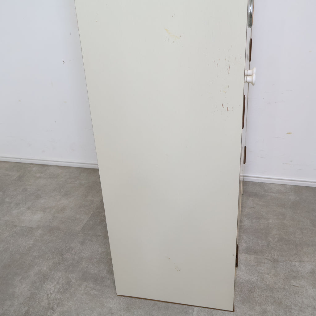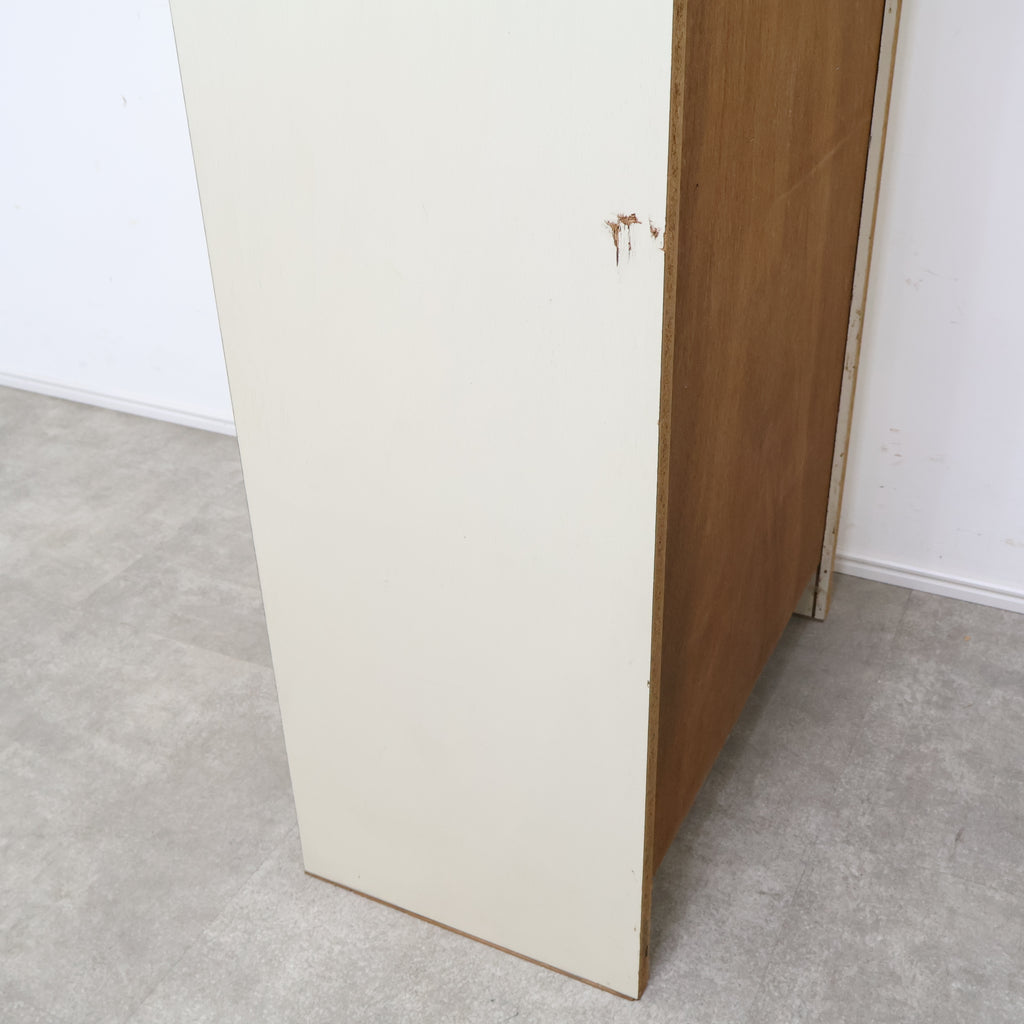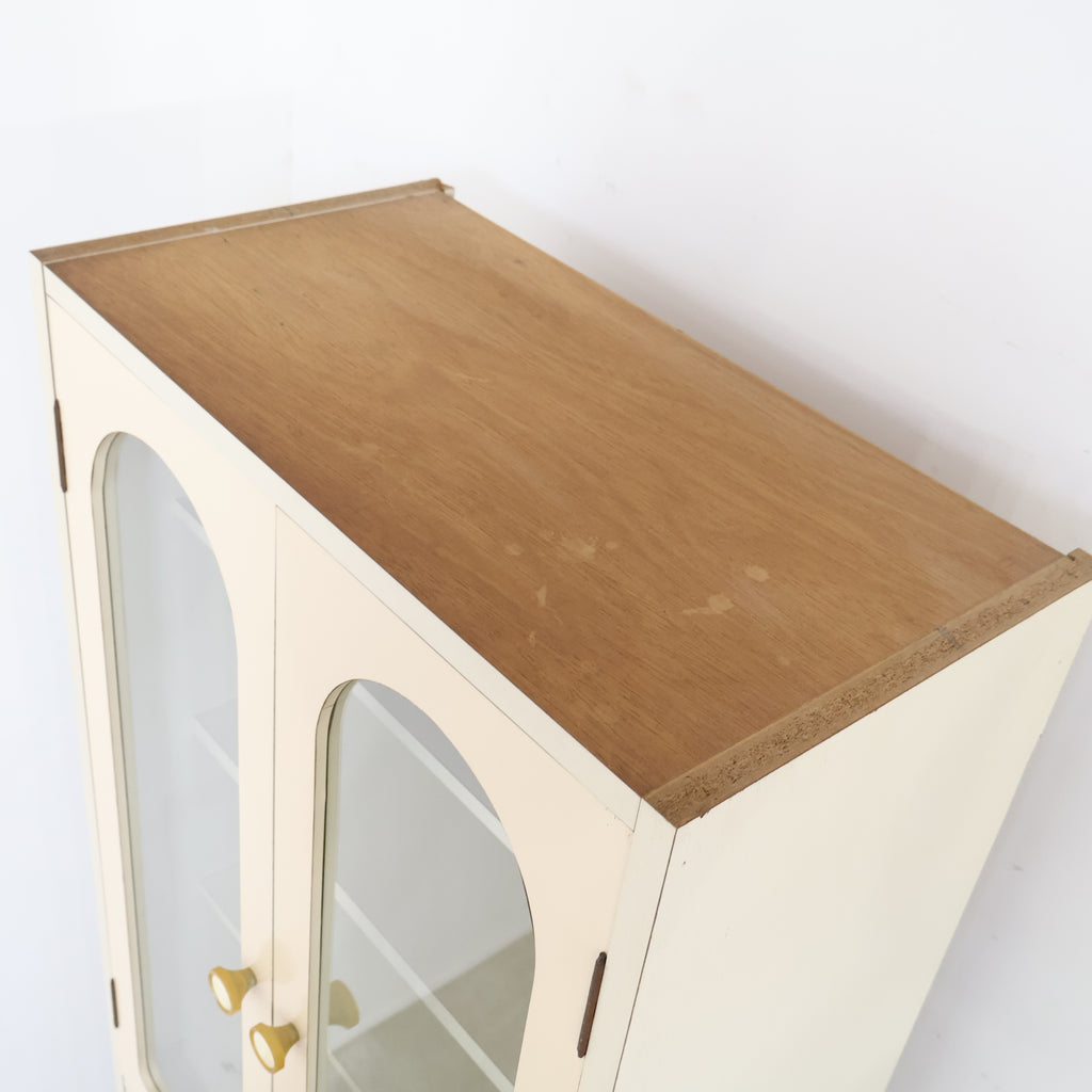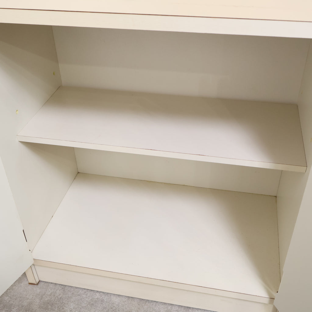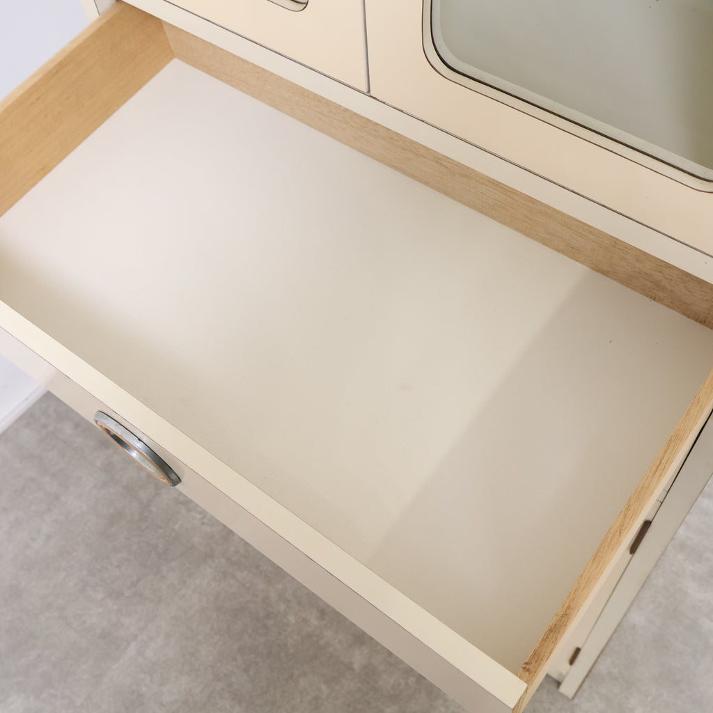 やさしいクリームカラーと丸みのあるガラス扉が、どこか懐かしく温かい空気をまとった一台。上段は見せる収納として、食器やグラス、雑貨を並べるだけで絵になる存在感があります。