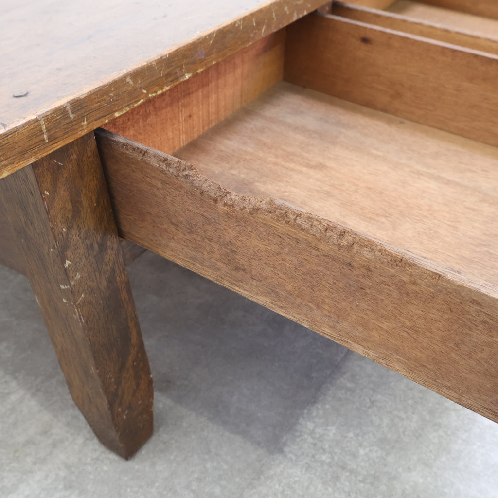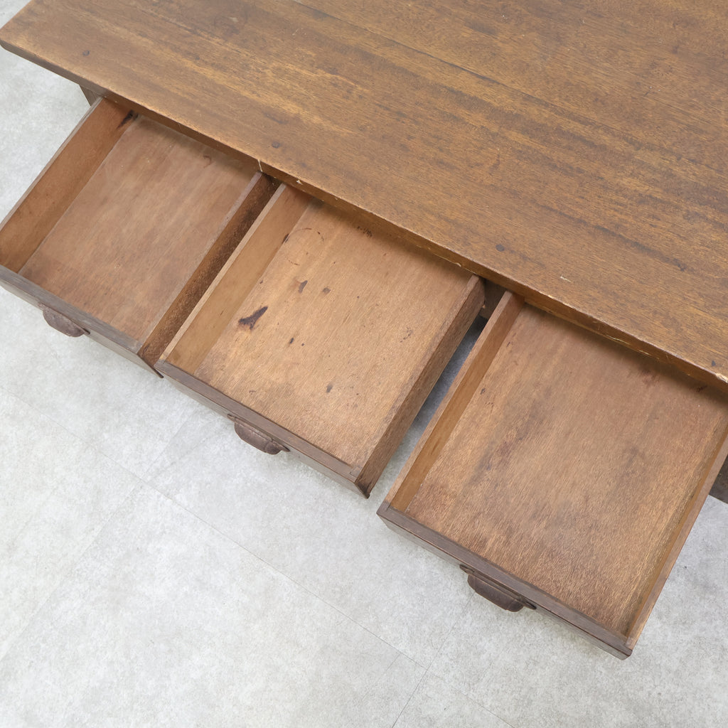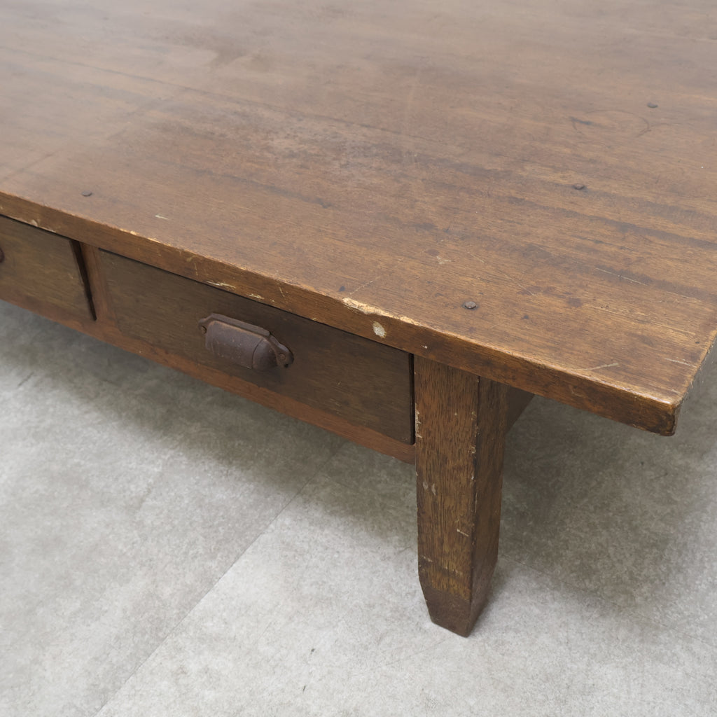 天板いっぱいに広がる使い込まれた木肌と、どっしりとしたサイズ感が空間に安心感を与えてくれます。両面に引き出しが付いた珍しいつくりで、座る位置を選ばず使えるのも嬉しいポイントです。