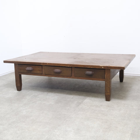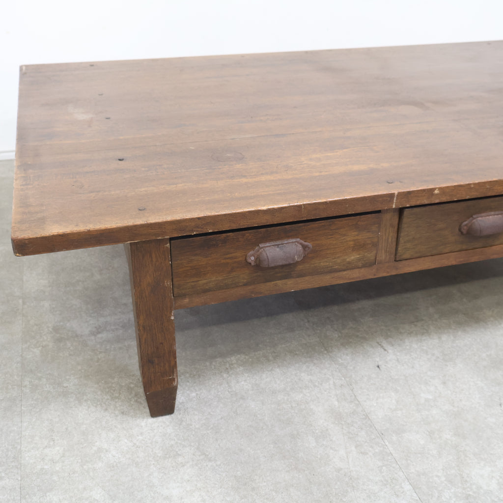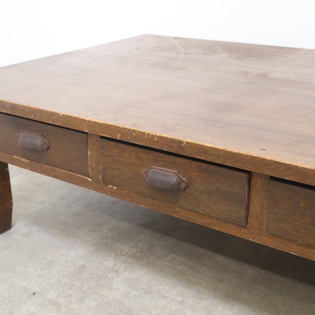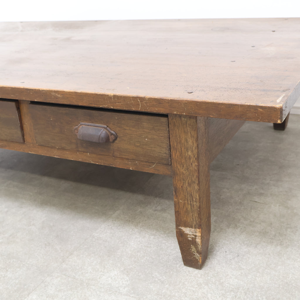 天板いっぱいに広がる使い込まれた木肌と、どっしりとしたサイズ感が空間に安心感を与えてくれます。両面に引き出しが付いた珍しいつくりで、座る位置を選ばず使えるのも嬉しいポイントです。