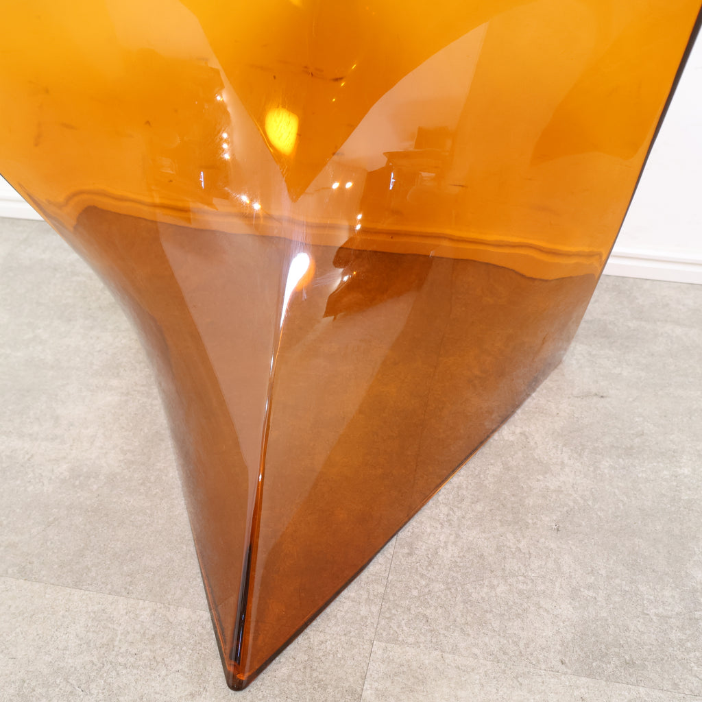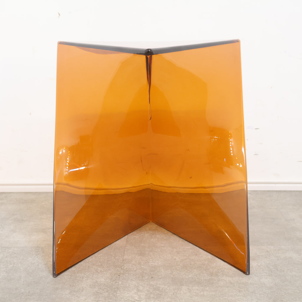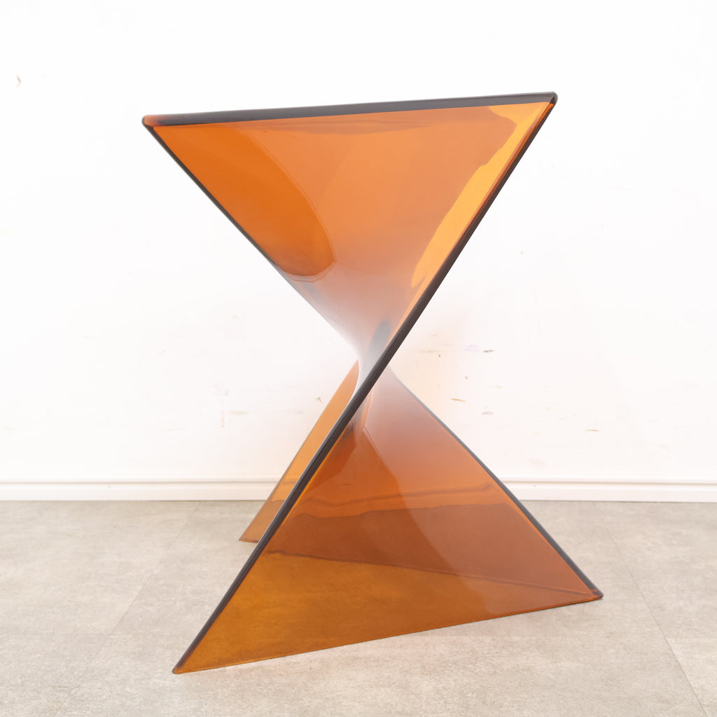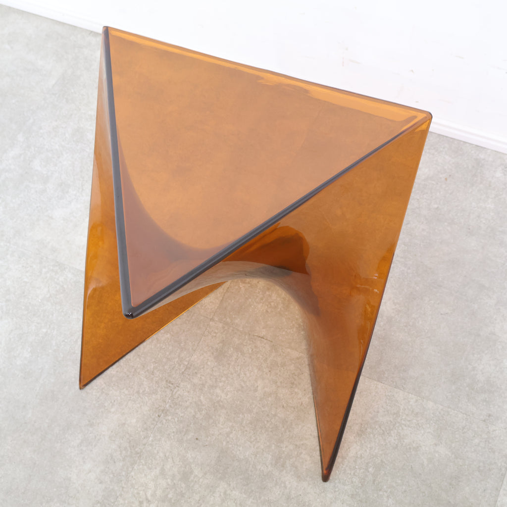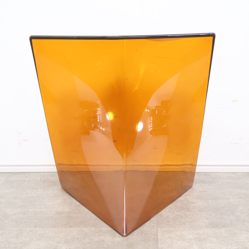 透明感のあるアンバーカラーのアクリル素材が印象的で、置くだけでお部屋の雰囲気をぐっとモダンに引き上げてくれます。 シャープな折り紙のようなフォルムは、アートピースのような存在感があり、サイドテーブルとしてはもちろん、ディスプレイ台や花台として使うのもおすすめ。光を受けて表情を変えるため、昼と夜で異なる印象を楽しめます。