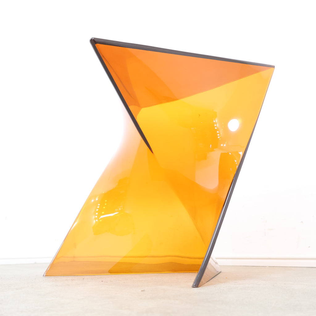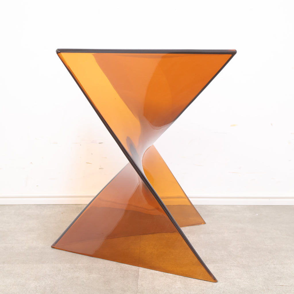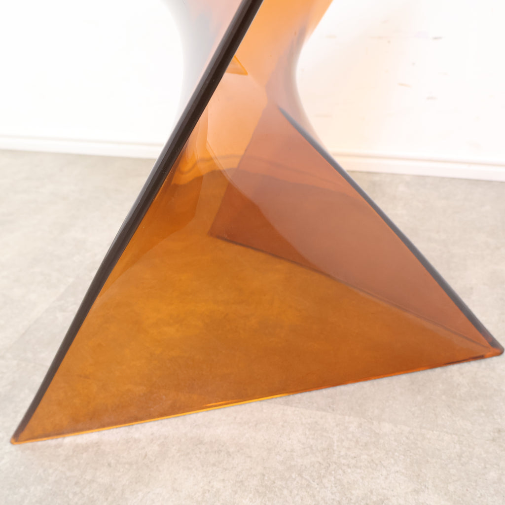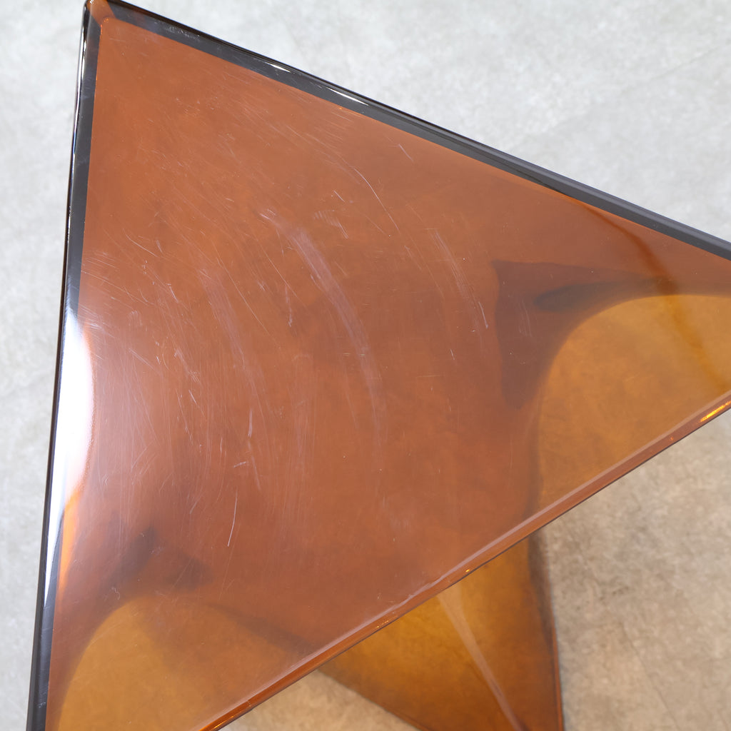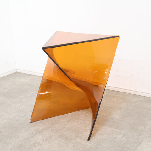 透明感のあるアンバーカラーのアクリル素材が印象的で、置くだけでお部屋の雰囲気をぐっとモダンに引き上げてくれます。 シャープな折り紙のようなフォルムは、アートピースのような存在感があり、サイドテーブルとしてはもちろん、ディスプレイ台や花台として使うのもおすすめ。光を受けて表情を変えるため、昼と夜で異なる印象を楽しめます。