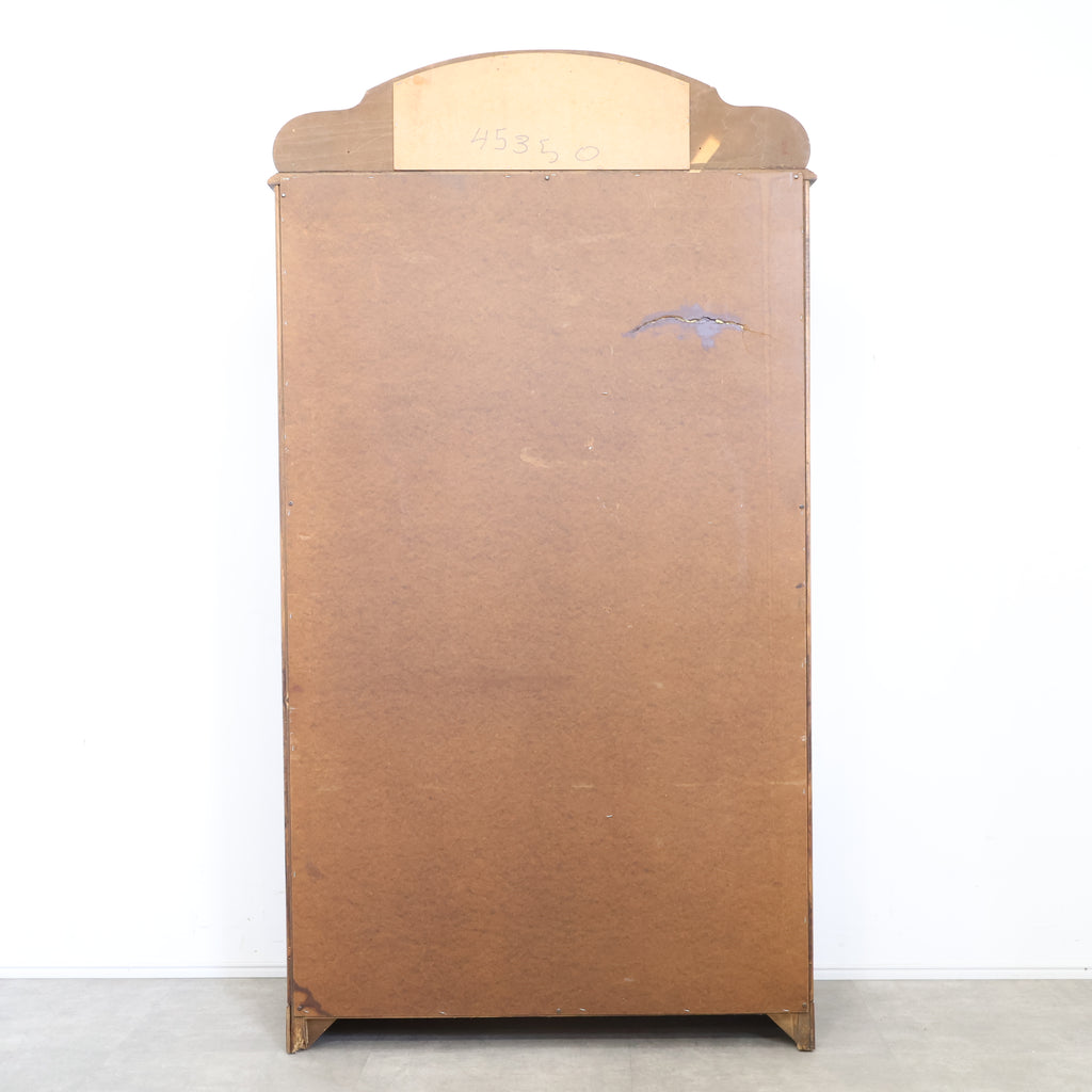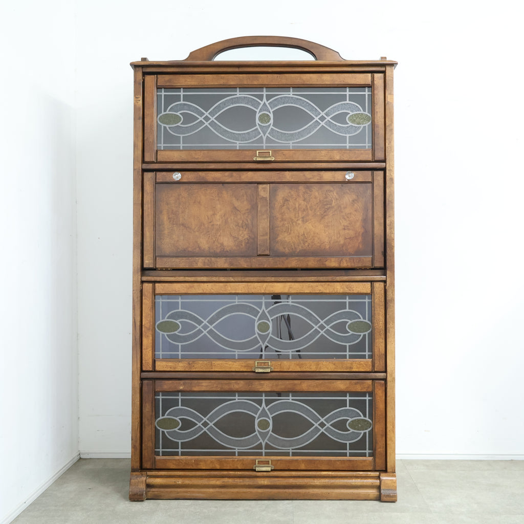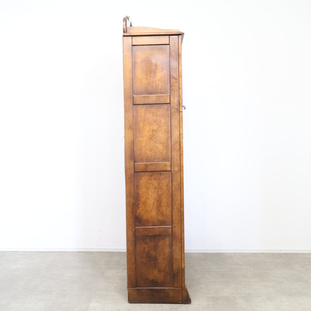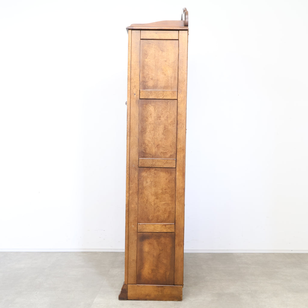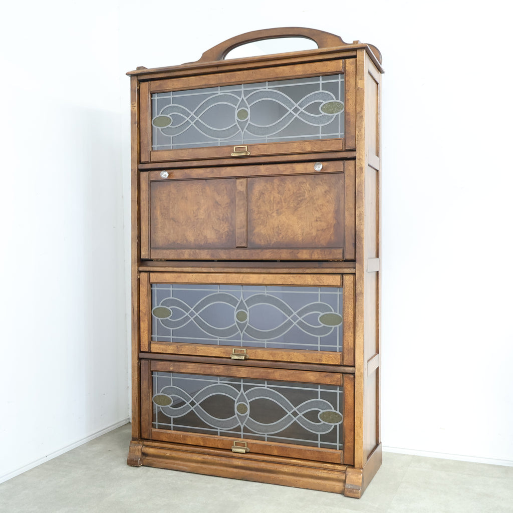 縦にすっと伸びたフォルムと、ガラス扉に施された装飾が印象的で、置くだけで空間にクラシックな雰囲気をもたらしてくれます。上部は本や雑貨を飾る収納として、下部は扉を開くことでデスクとして使える構造になっており、書き物やパソコン作業など日常のさまざまなシーンに寄り添ってくれます。