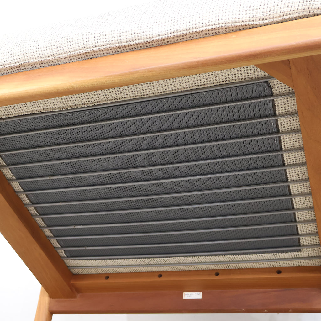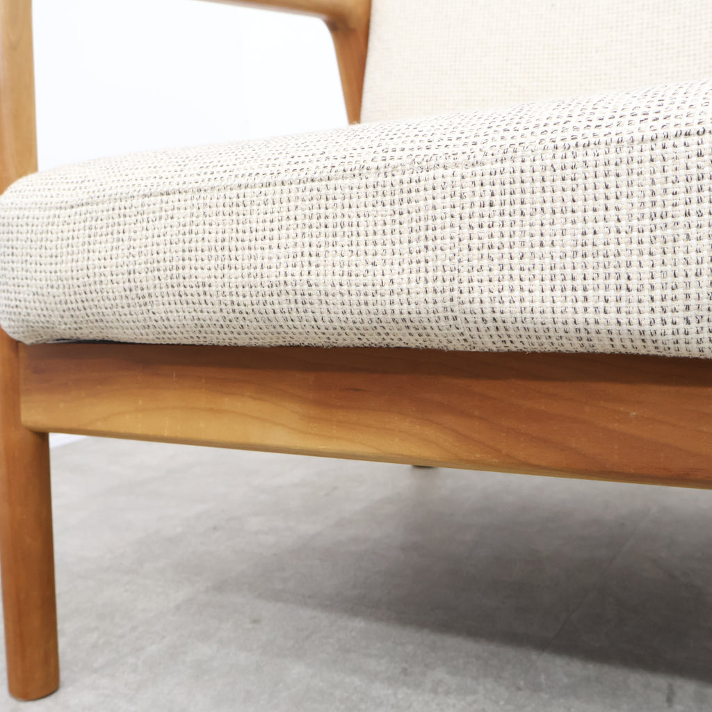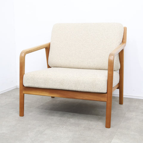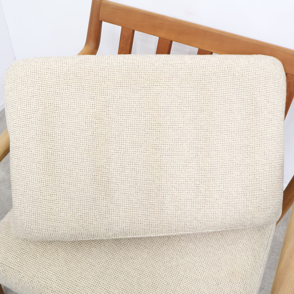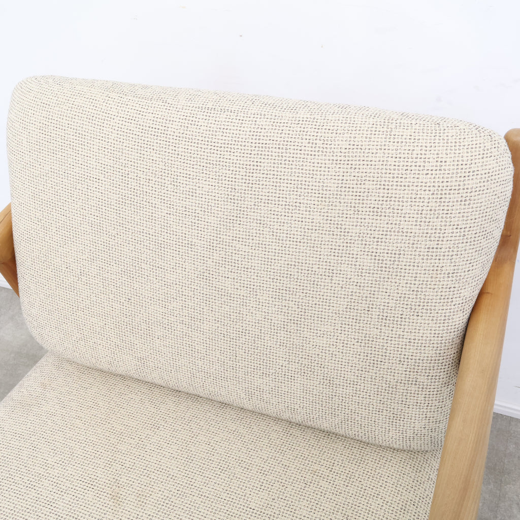広めの座面と厚みのあるクッションで、ゆったりとした座り心地。背と座のバランスもよく、長時間くつろぐ時間にも最適です。ナチュラルな木色と落ち着いたファブリックは、北欧テイストや和モダンの空間にも自然に馴染みます。