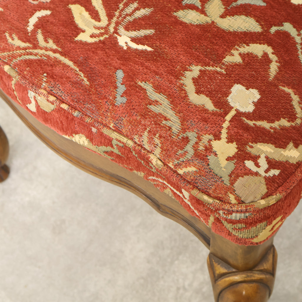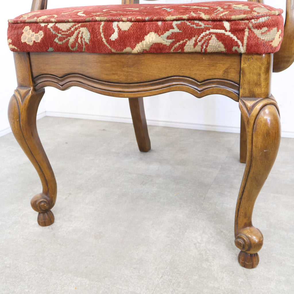 優雅な曲線を描く猫脚と、繊細な装飾が施された背もたれが印象的。ラタン(籐)の背面が軽やかさを添え、重厚感の中にも抜け感のあるデザインに仕上がっています。