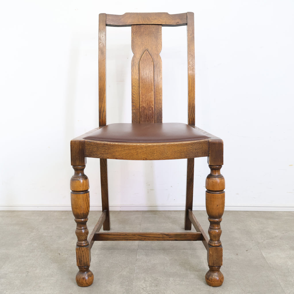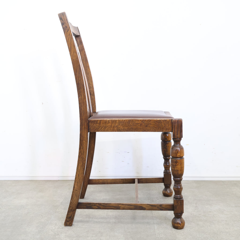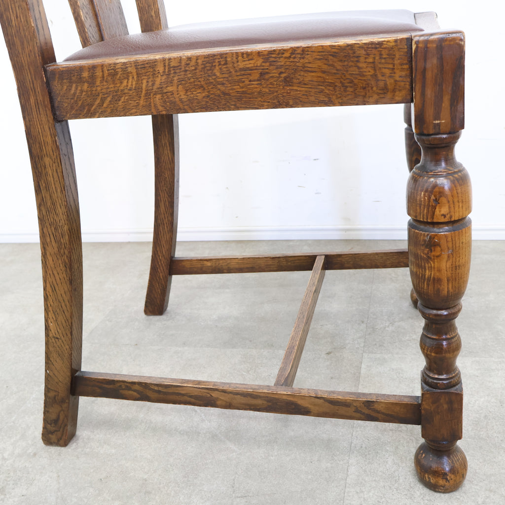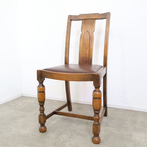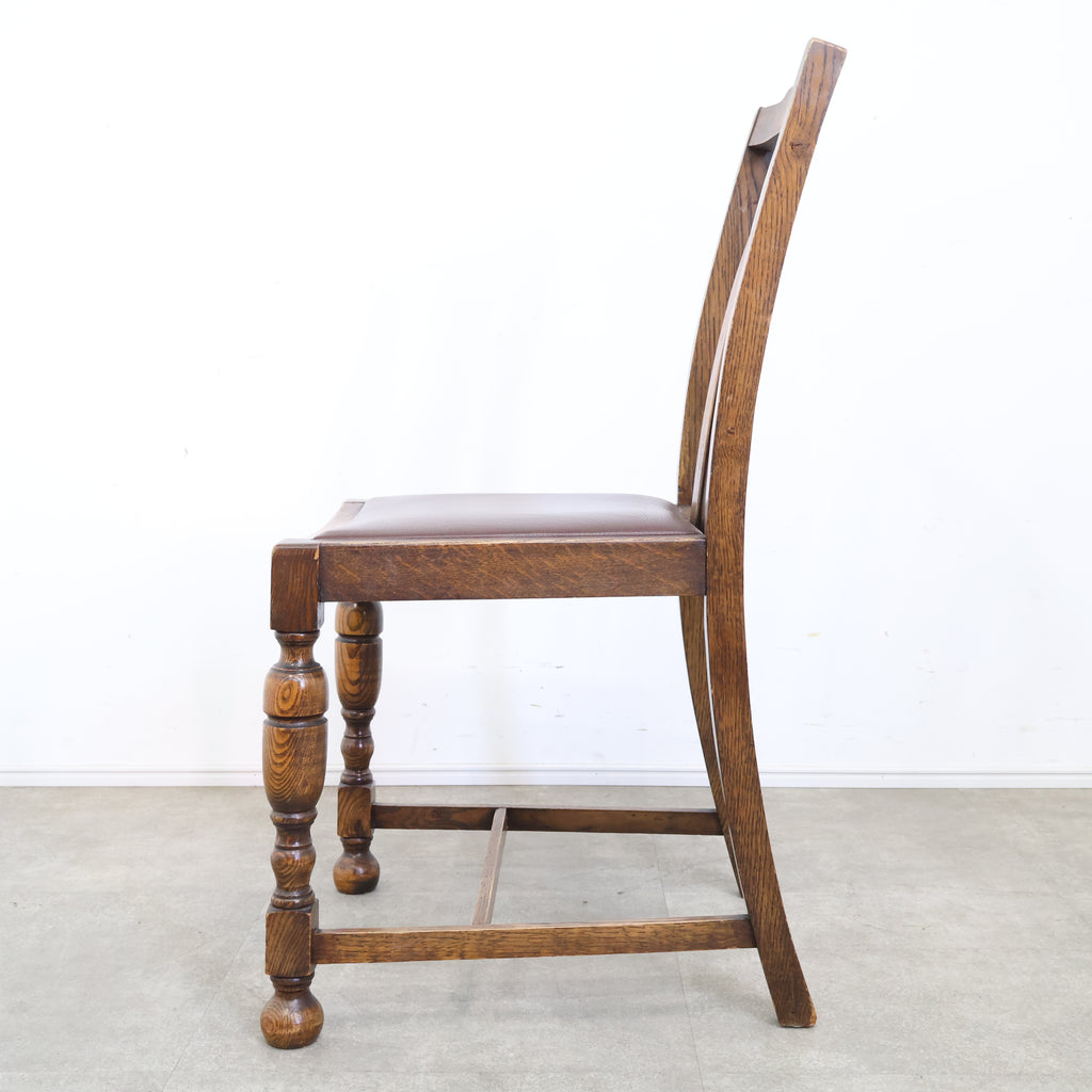英国アンティークのダイニングチェアです。 無垢材の重厚な木の風合いと、美しい木目が印象的な一脚。ろくろ加工が施された脚部や背もたれの装飾が、クラシックで気品ある雰囲気を演出しています。