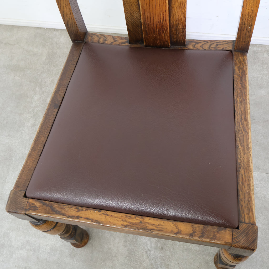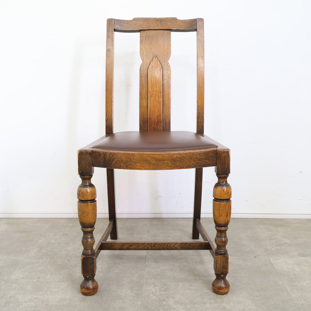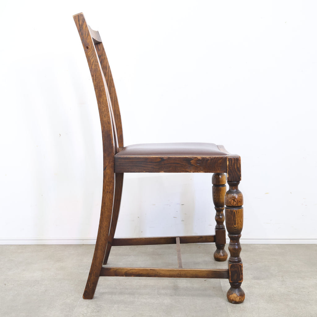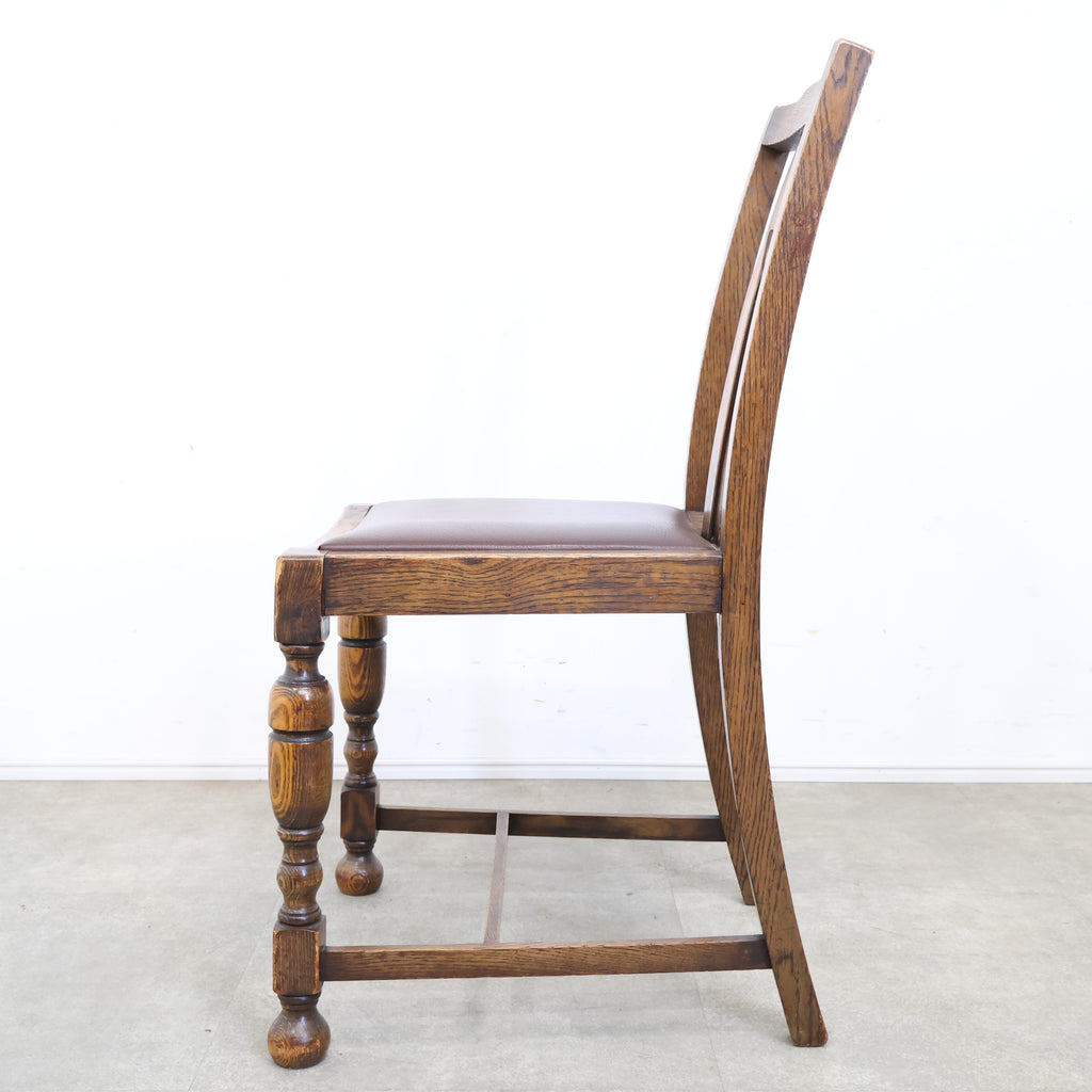 英国アンティークのダイニングチェアです。 無垢材の重厚な木の風合いと、美しい木目が印象的な一脚。ろくろ加工が施された脚部や背もたれの装飾が、クラシックで気品ある雰囲気を演出しています。