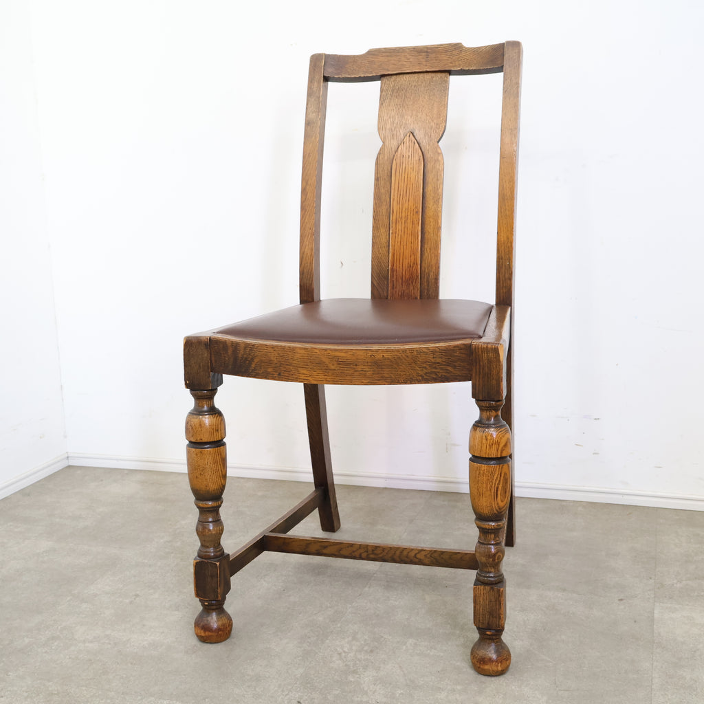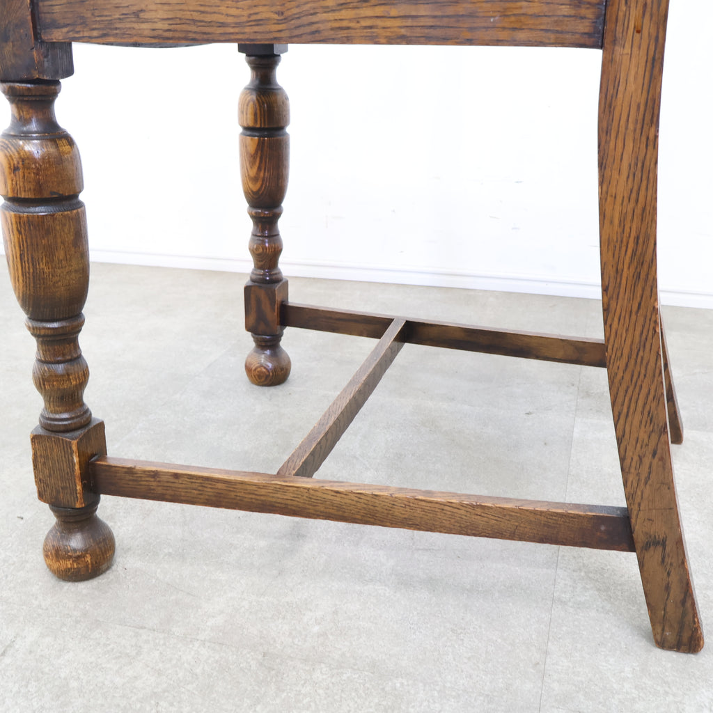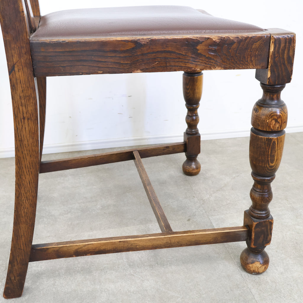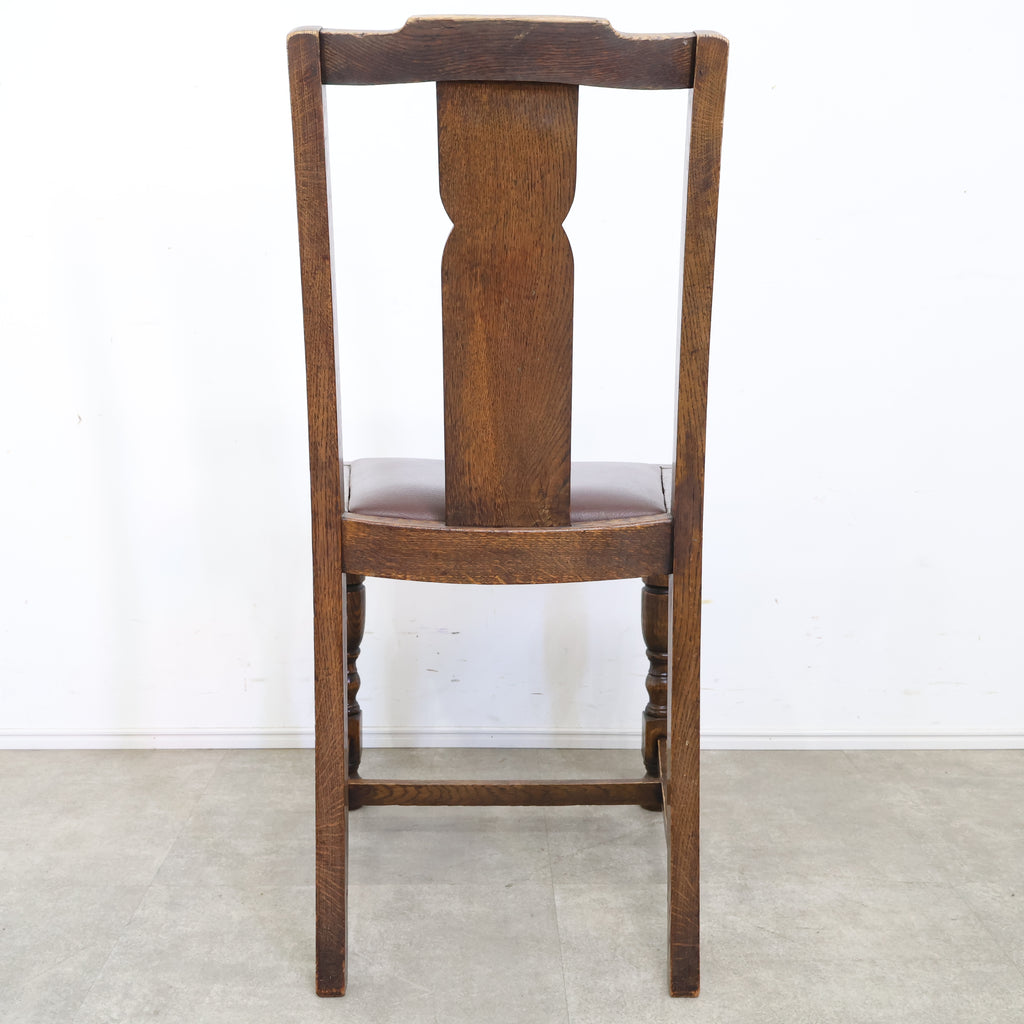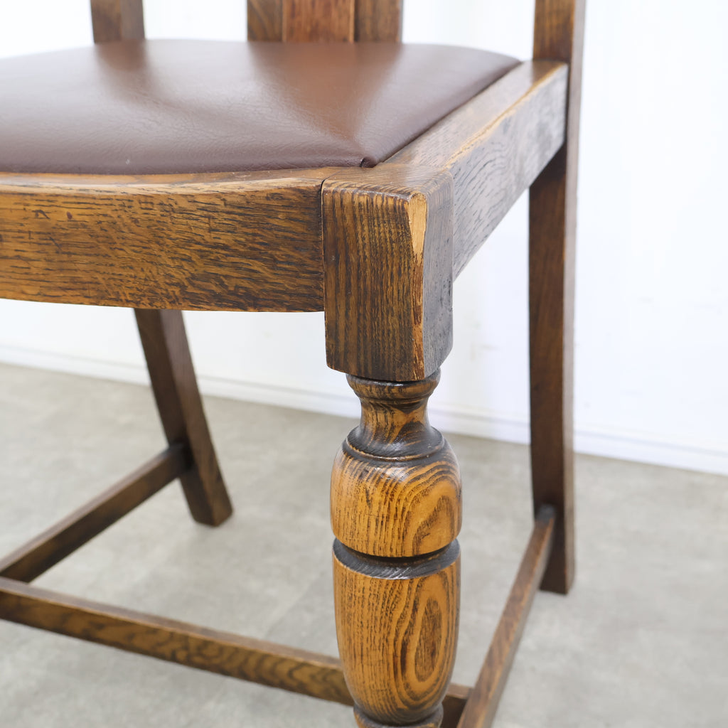英国アンティークのダイニングチェアです。 無垢材の重厚な木の風合いと、美しい木目が印象的な一脚。ろくろ加工が施された脚部や背もたれの装飾が、クラシックで気品ある雰囲気を演出しています。