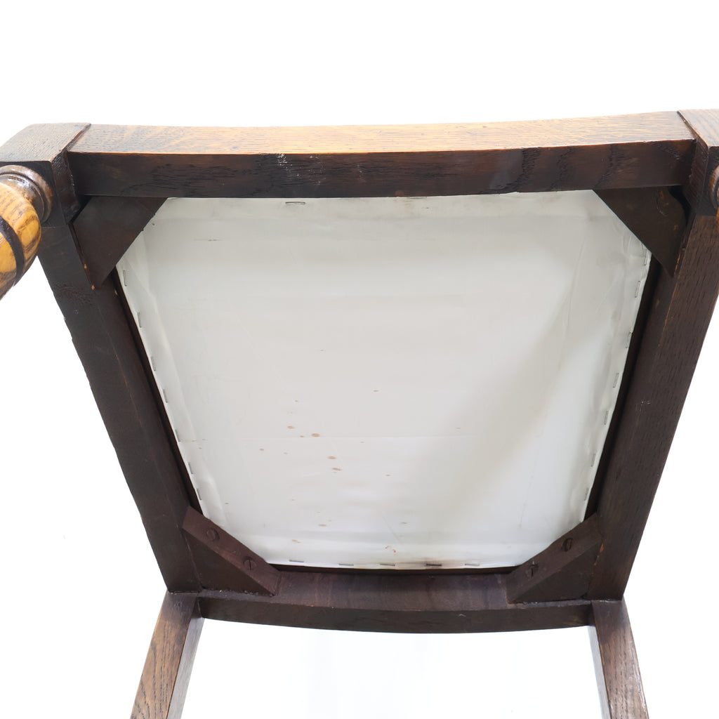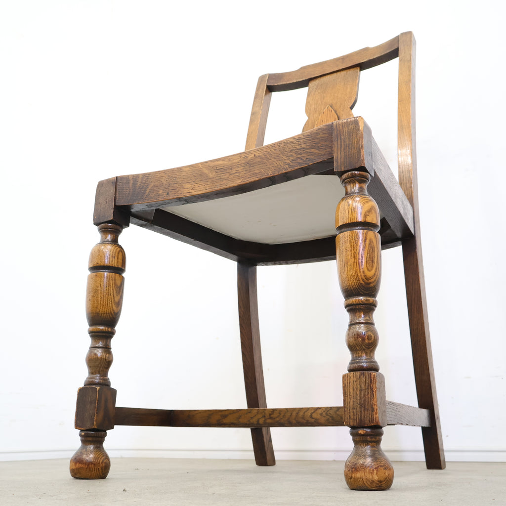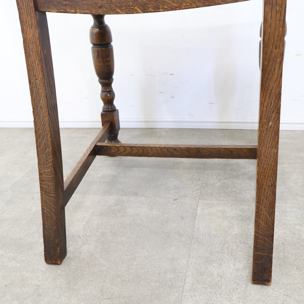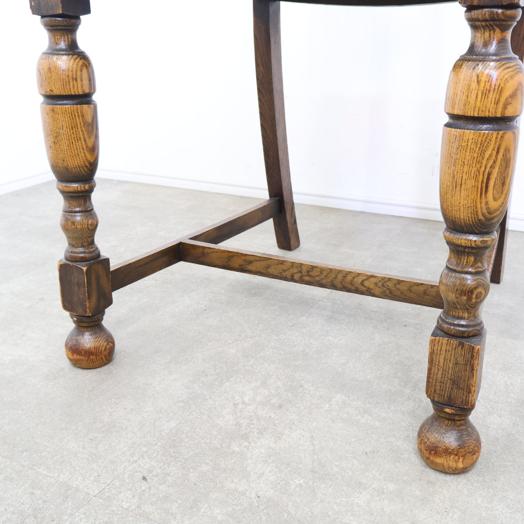 英国アンティークのダイニングチェアです。 無垢材の重厚な木の風合いと、美しい木目が印象的な一脚。ろくろ加工が施された脚部や背もたれの装飾が、クラシックで気品ある雰囲気を演出しています。