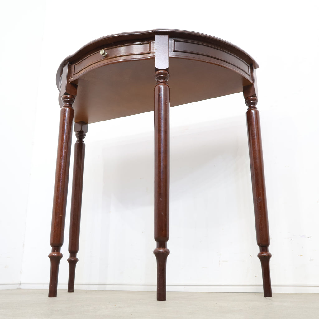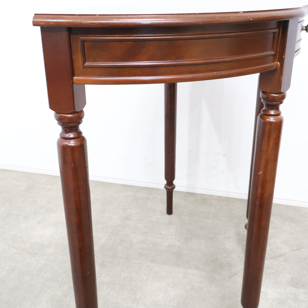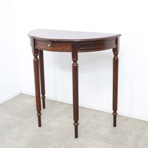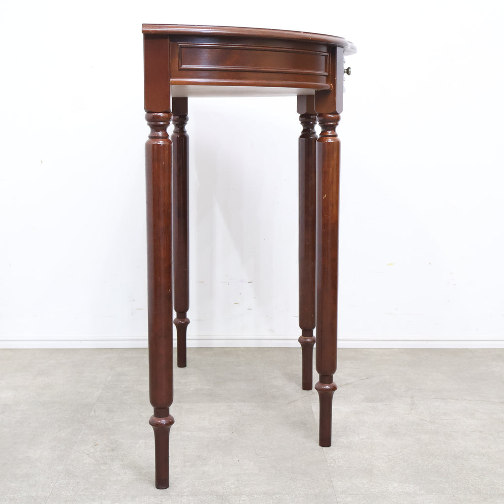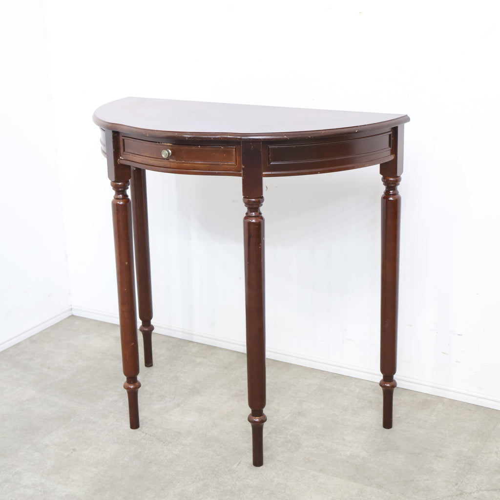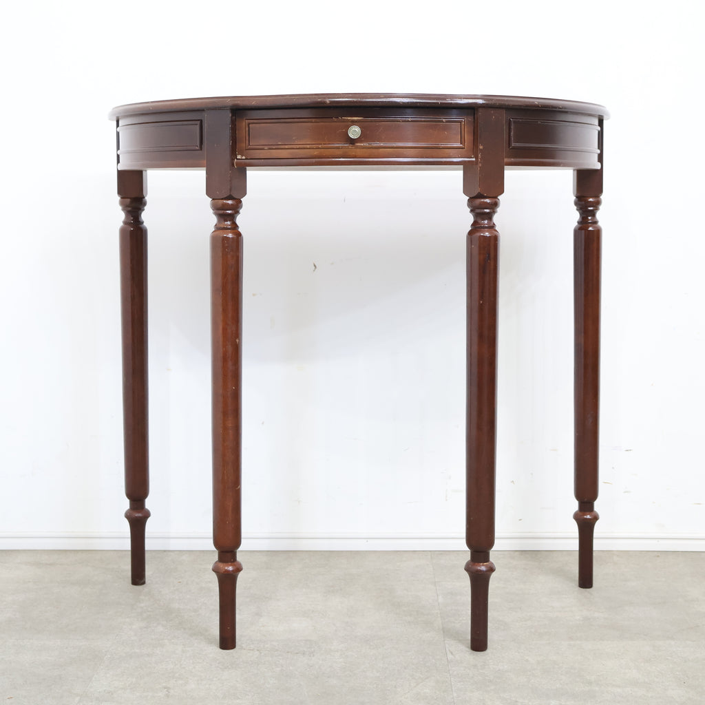 半円型のフォルムは壁付けでの使用にも適しており、空間をすっきりと見せながら上品なアクセントを加えてくれます。細身の脚や控えめな装飾がクラシックな雰囲気を演出し、落ち着いたインテリアに自然と馴染むデザインです。 コンパクトながら引き出し付きで、ちょっとした小物や書類の収納にも便利。