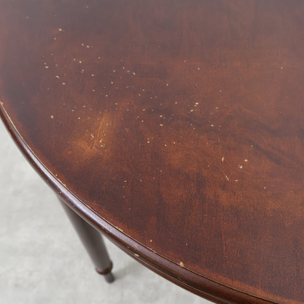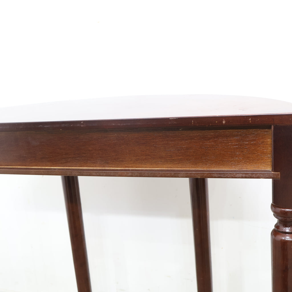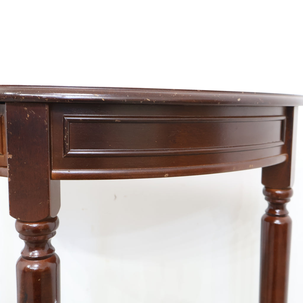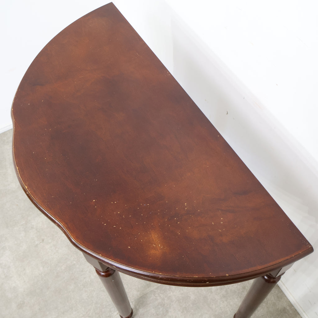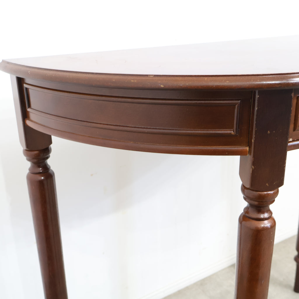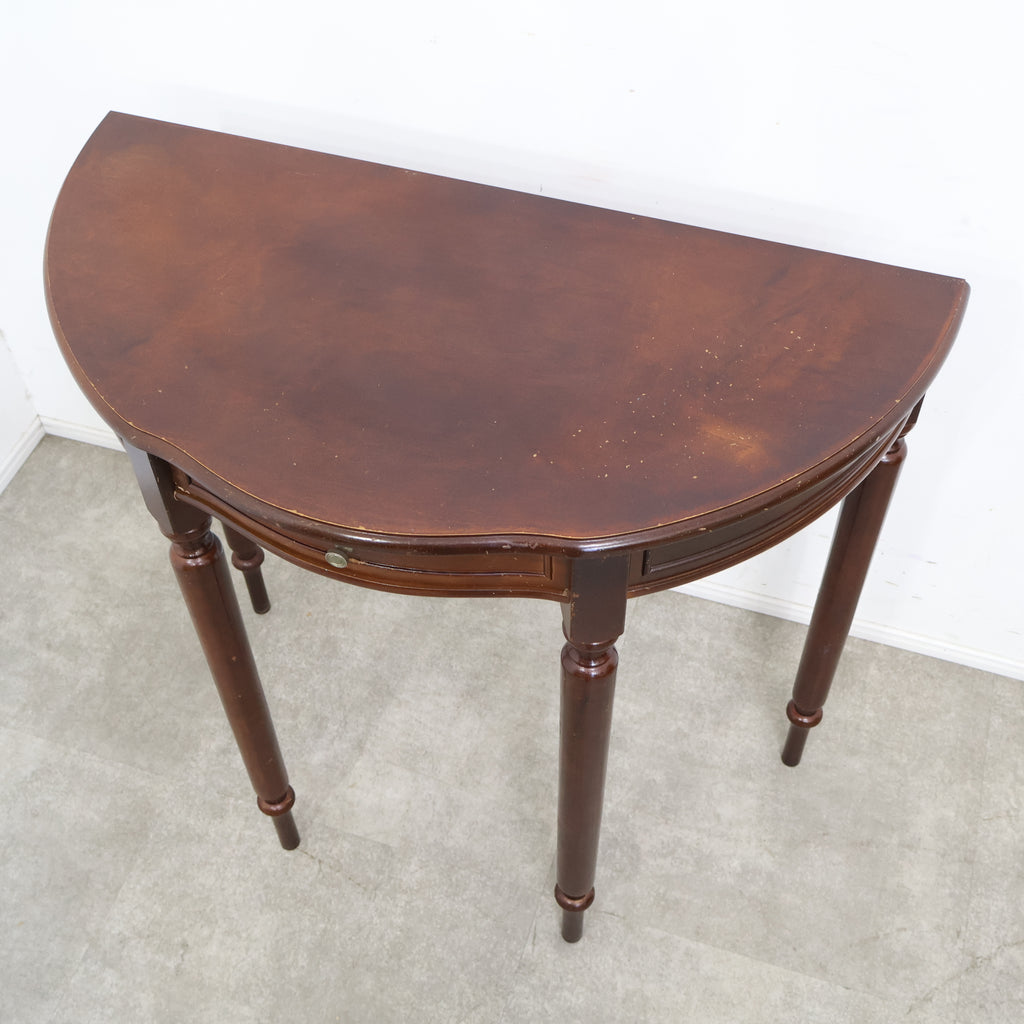 半円型のフォルムは壁付けでの使用にも適しており、空間をすっきりと見せながら上品なアクセントを加えてくれます。細身の脚や控えめな装飾がクラシックな雰囲気を演出し、落ち着いたインテリアに自然と馴染むデザインです。 コンパクトながら引き出し付きで、ちょっとした小物や書類の収納にも便利。