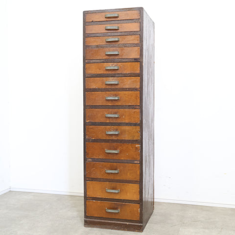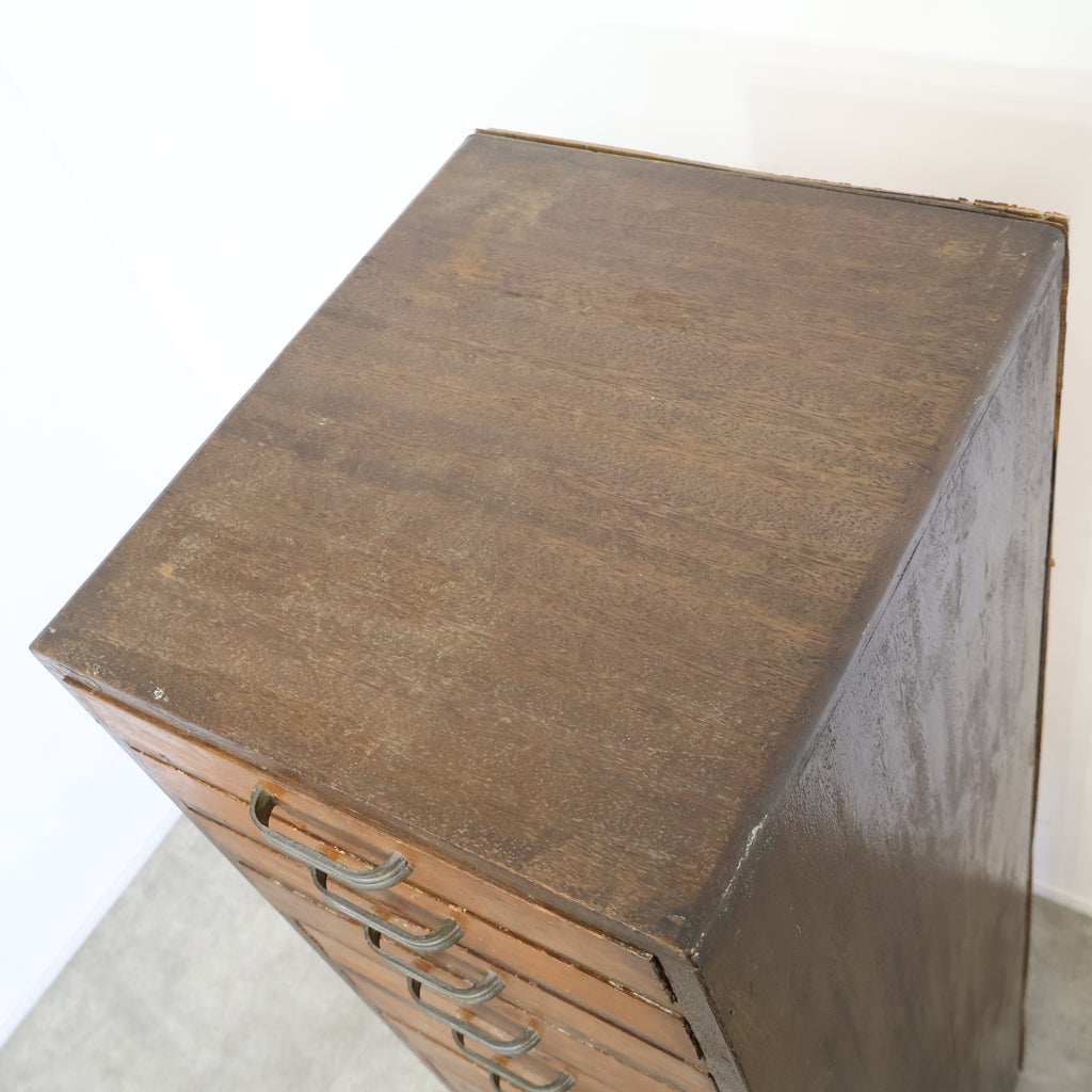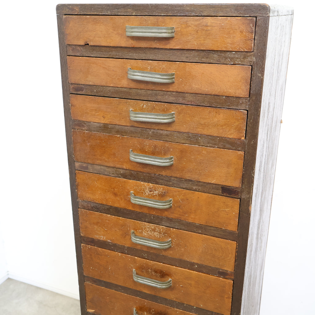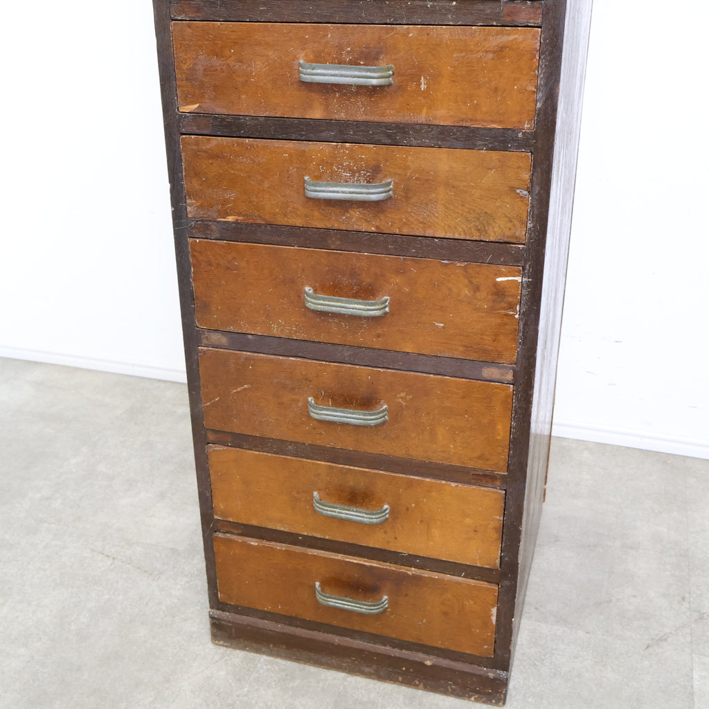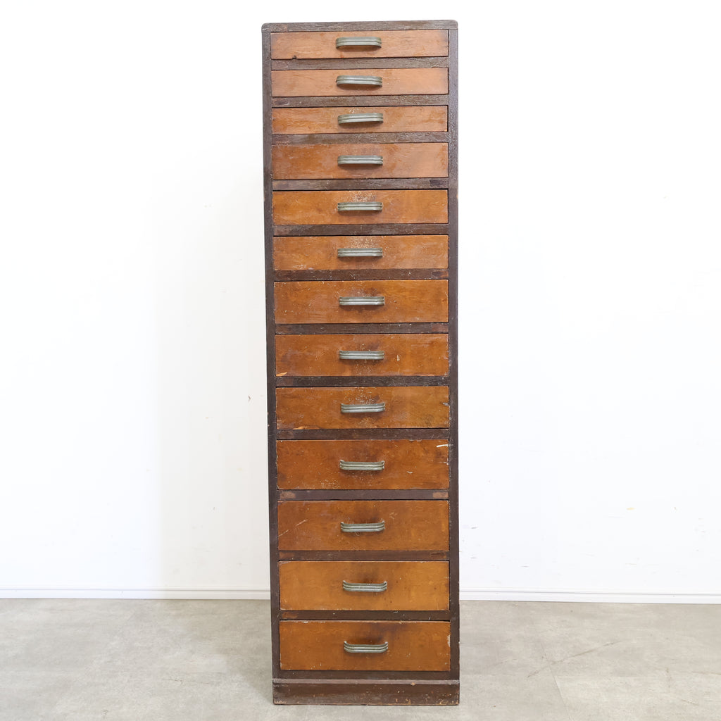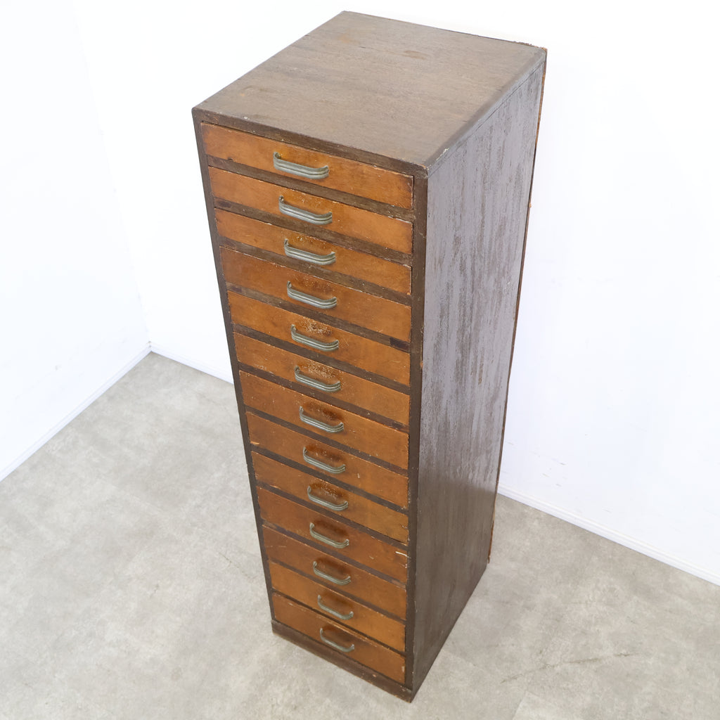 規則的に並ぶ小引き出しと、経年によって深みを増した木の風合いが、空間に味わいを添えてくれます。無駄のないシンプルなデザインながら、どこか無骨で雰囲気のある佇まいが魅力です。 書類や文具、細かなパーツ類の整理に適しており、省スペースでしっかり収納できるのもポイント。デスク横や作業スペース、ショップのバックヤードなど、実用性を求めるシーンでも活躍してくれます。