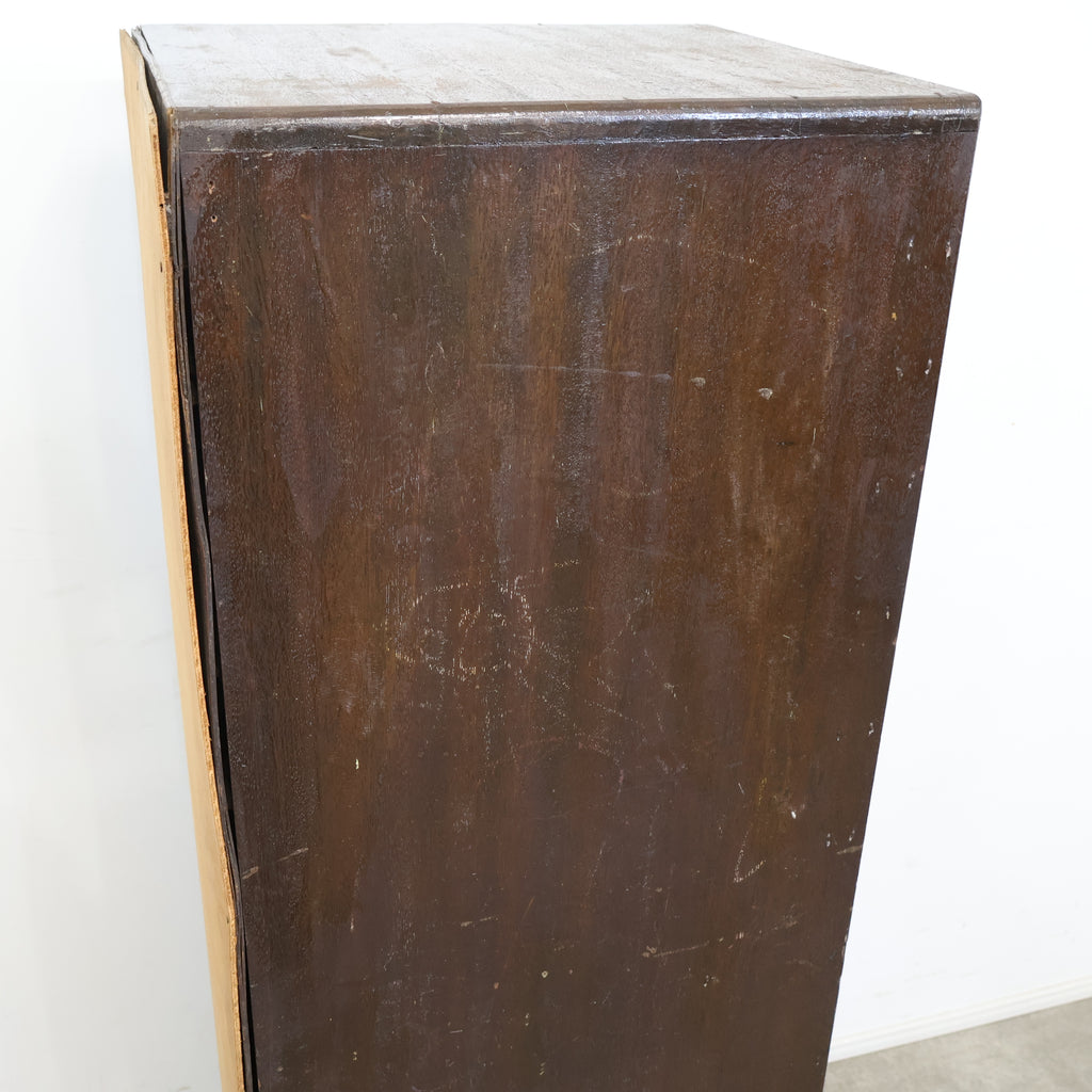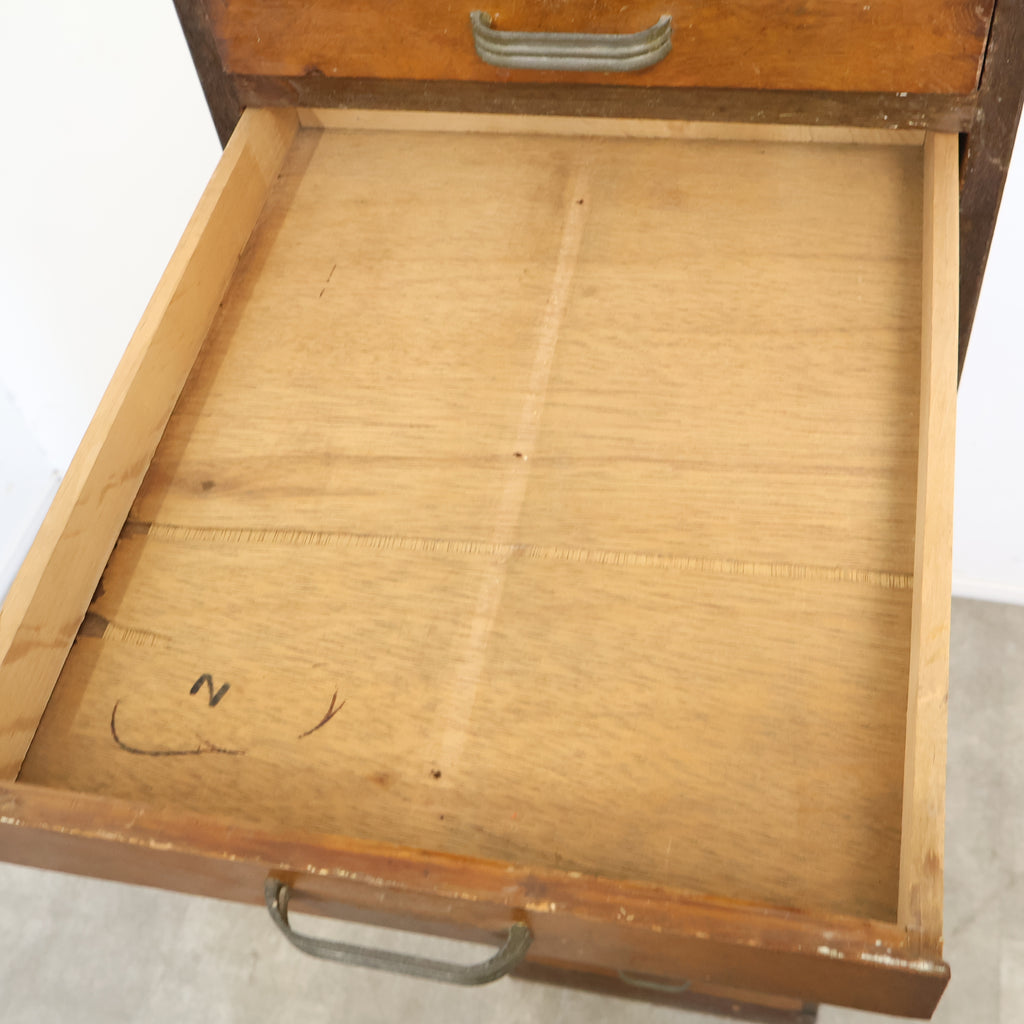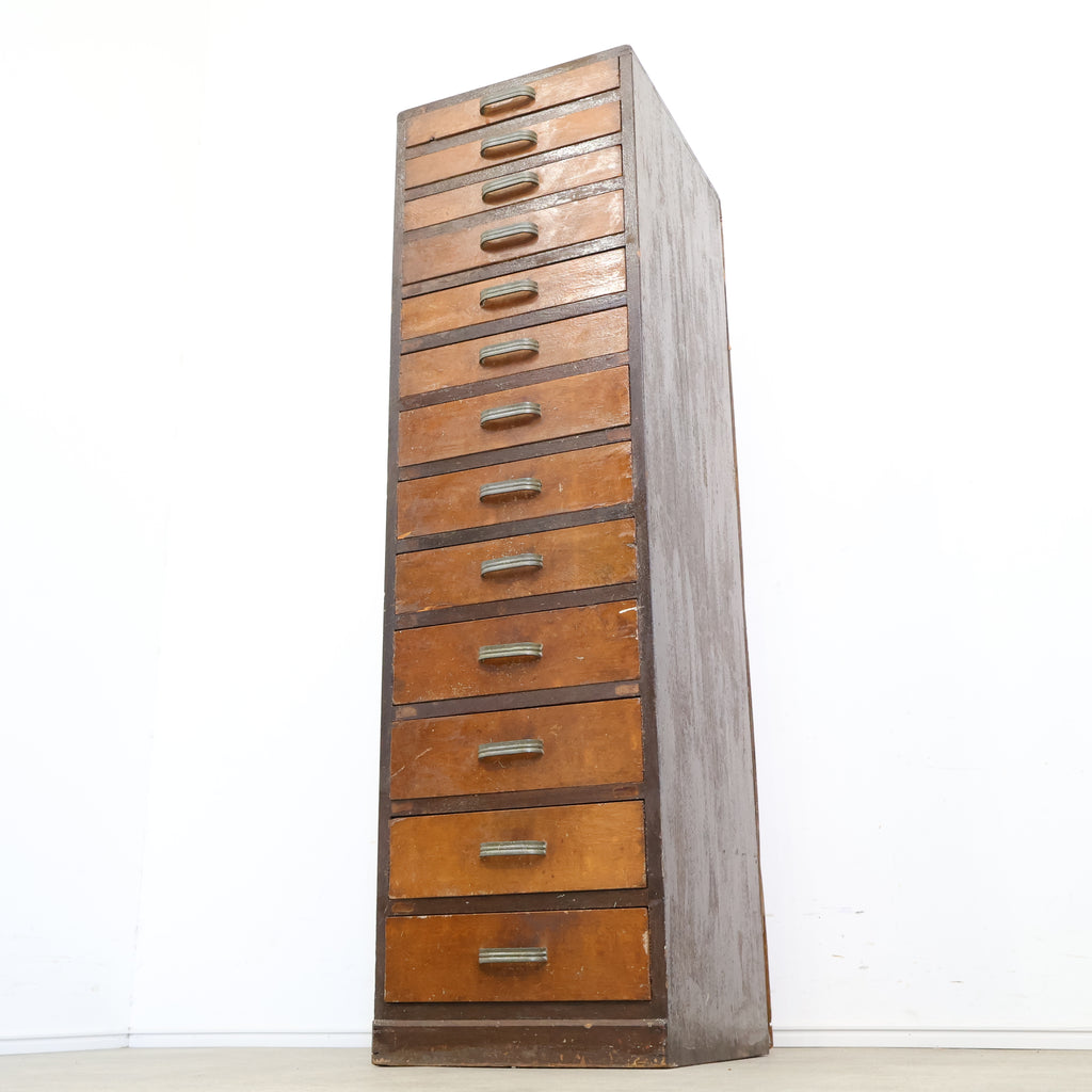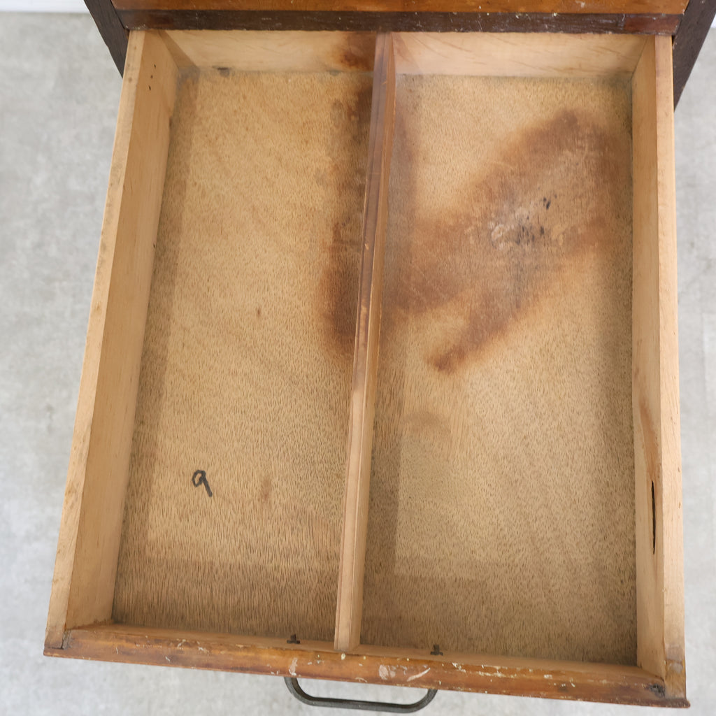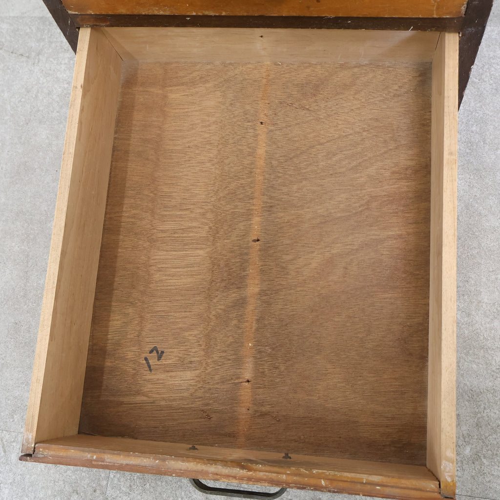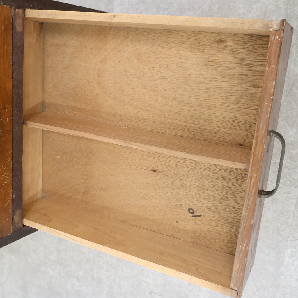 規則的に並ぶ小引き出しと、経年によって深みを増した木の風合いが、空間に味わいを添えてくれます。無駄のないシンプルなデザインながら、どこか無骨で雰囲気のある佇まいが魅力です。 書類や文具、細かなパーツ類の整理に適しており、省スペースでしっかり収納できるのもポイント。デスク横や作業スペース、ショップのバックヤードなど、実用性を求めるシーンでも活躍してくれます。