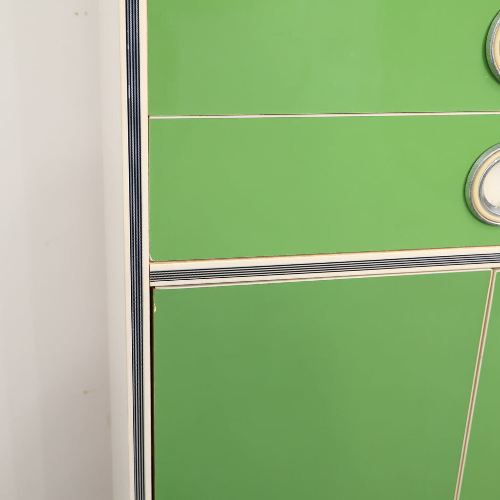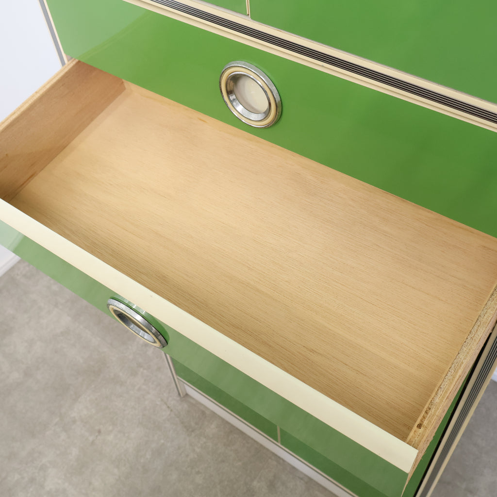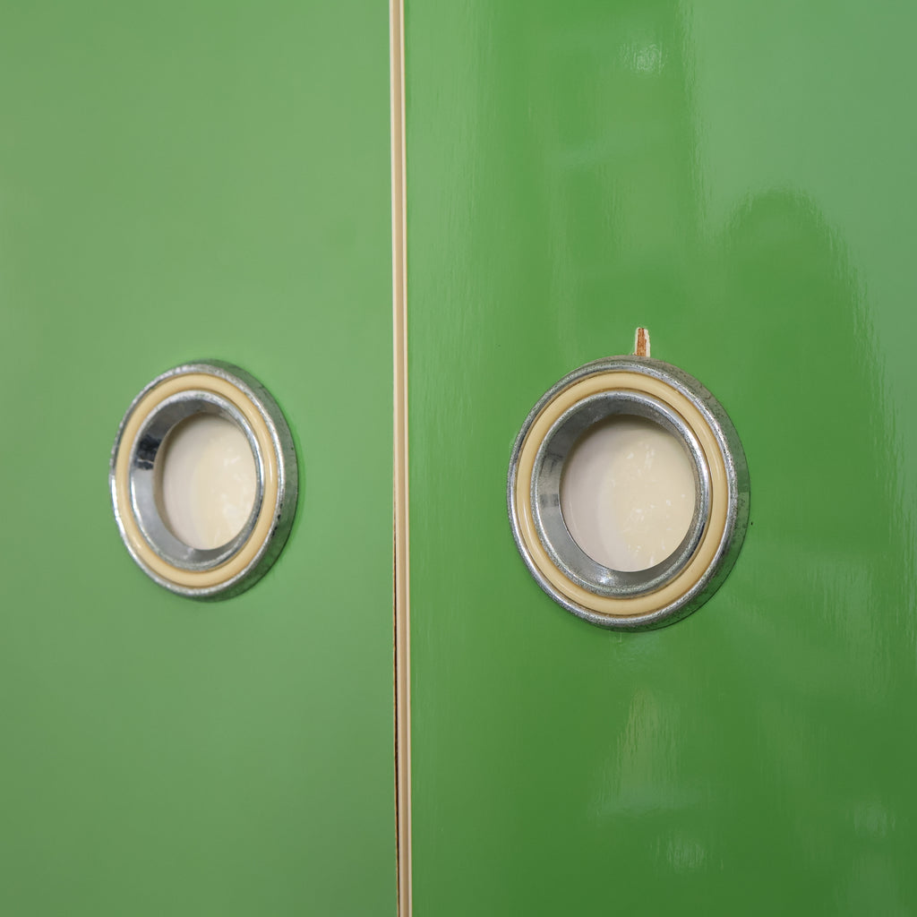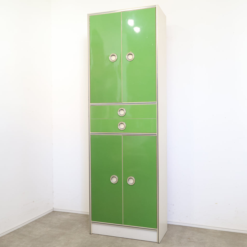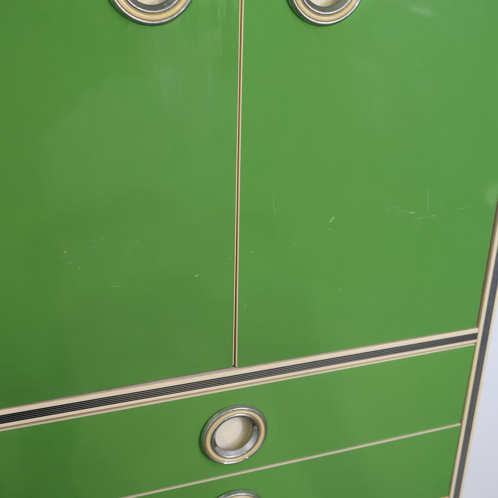 鮮やかなグリーンカラーが目を引く、レトロな収納キャビネットです。