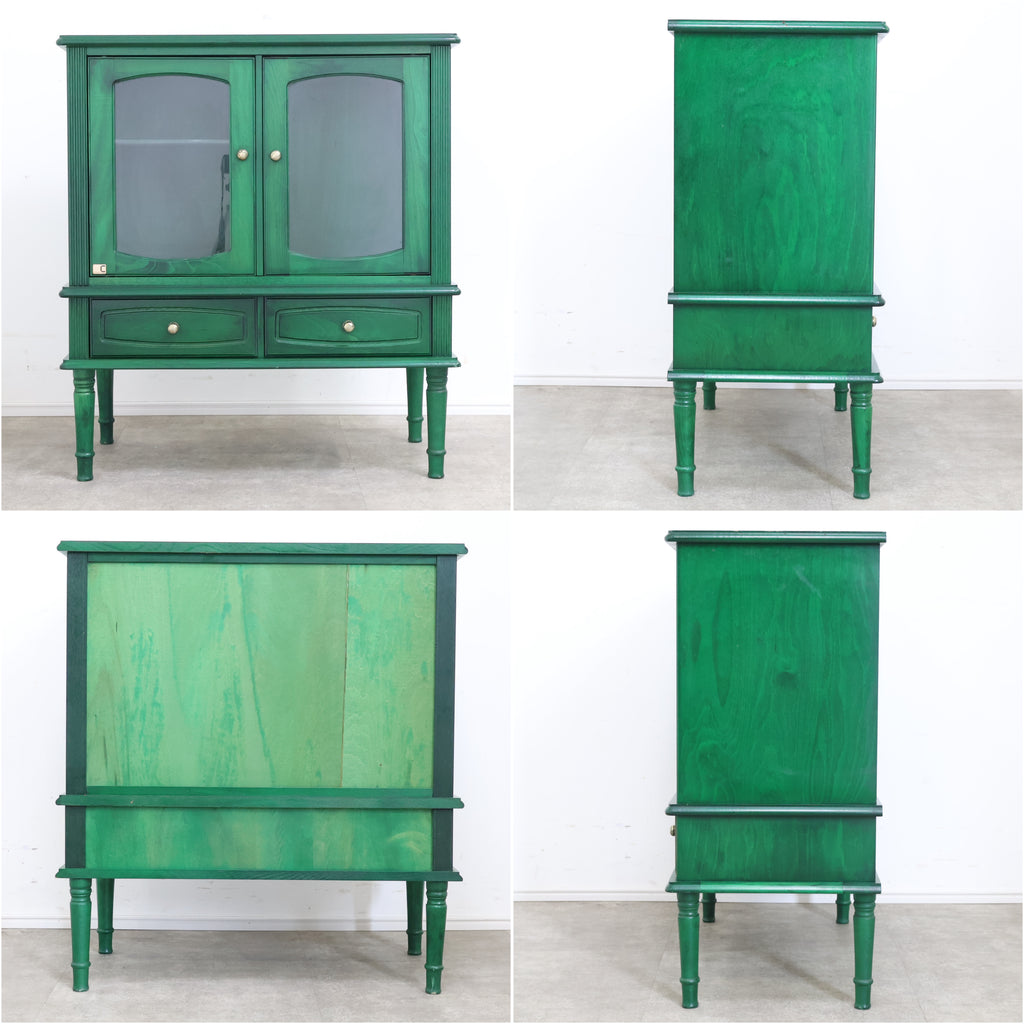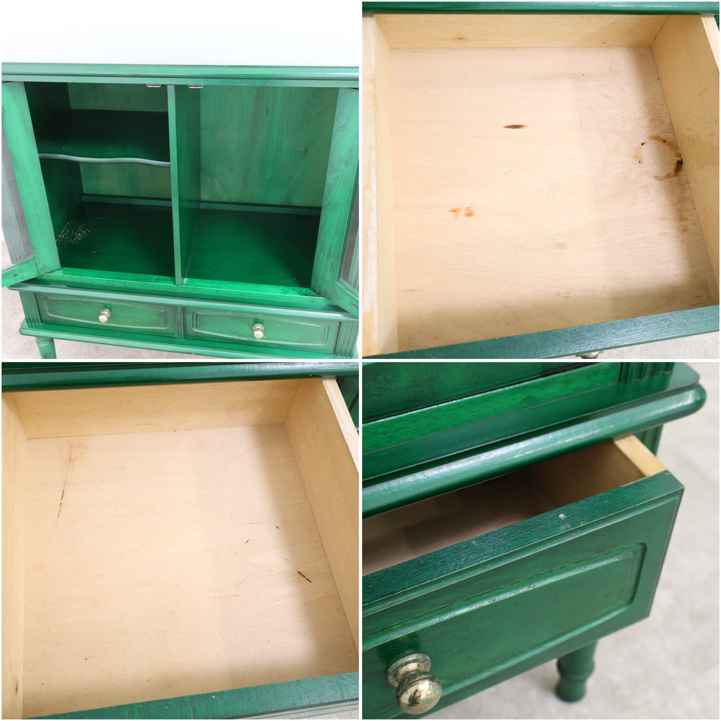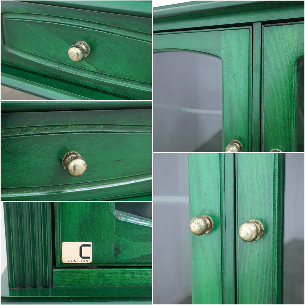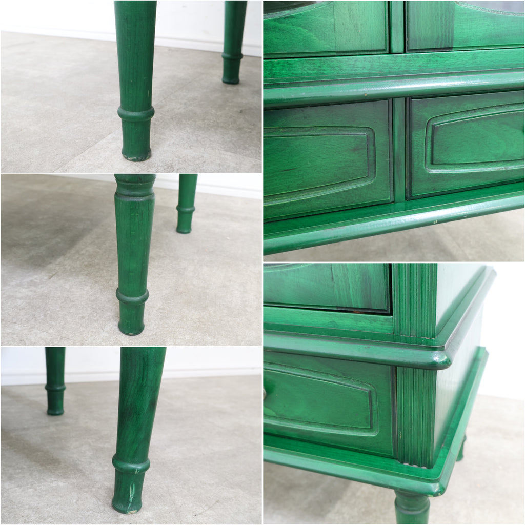 レトロなグリーンがオシャレなガラスキャビネットです。全面と中の棚も全てグリーンで統一されており、クラシカルな雰囲気は存在感が抜群です。