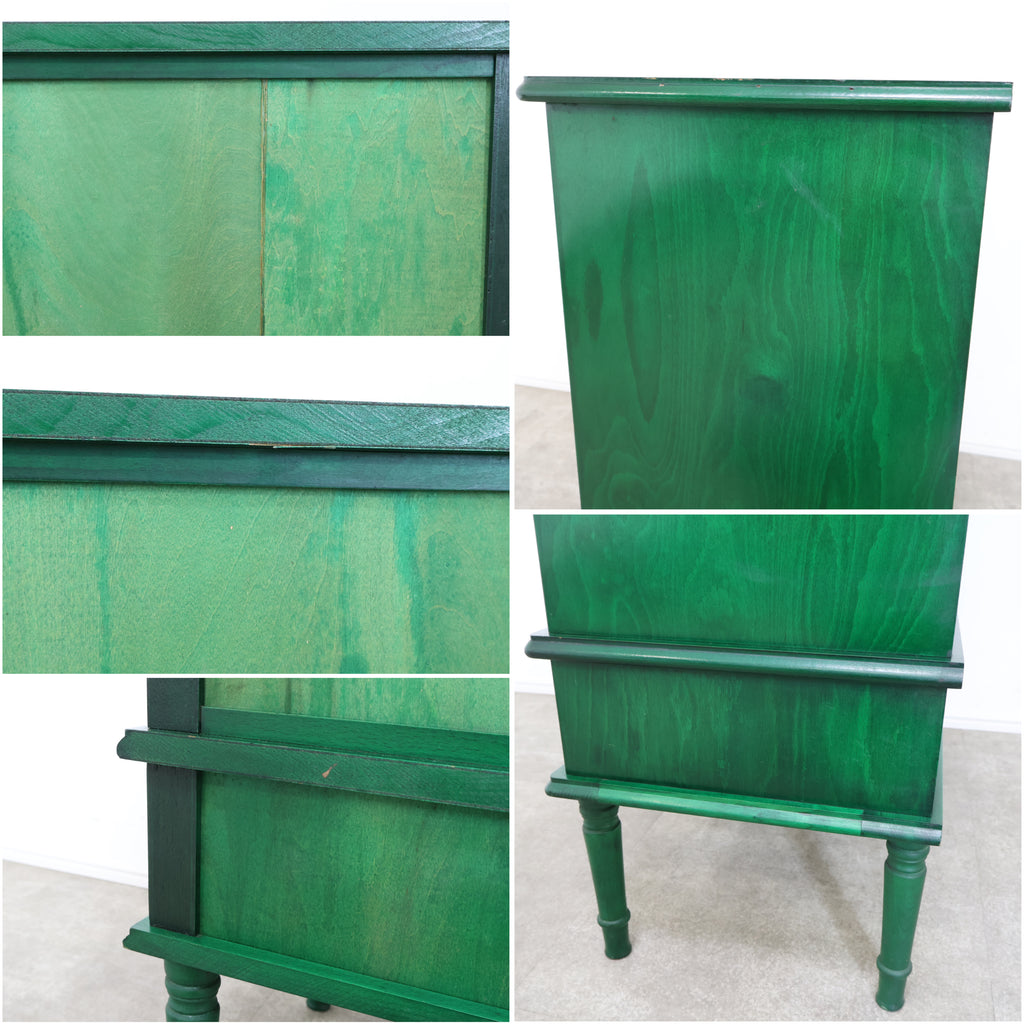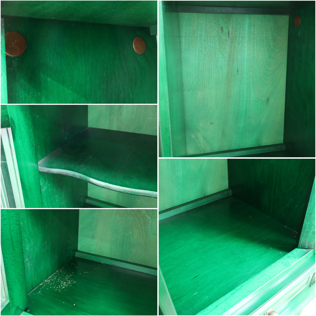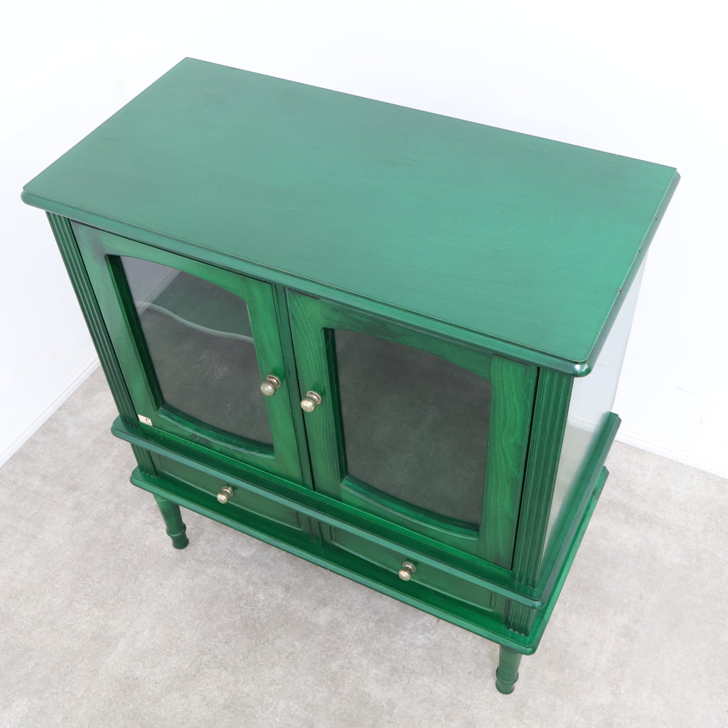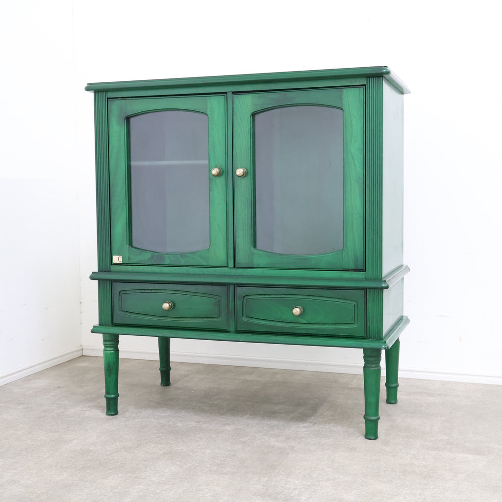レトロなグリーンがオシャレなガラスキャビネットです。全面と中の棚も全てグリーンで統一されており、クラシカルな雰囲気は存在感が抜群です。
