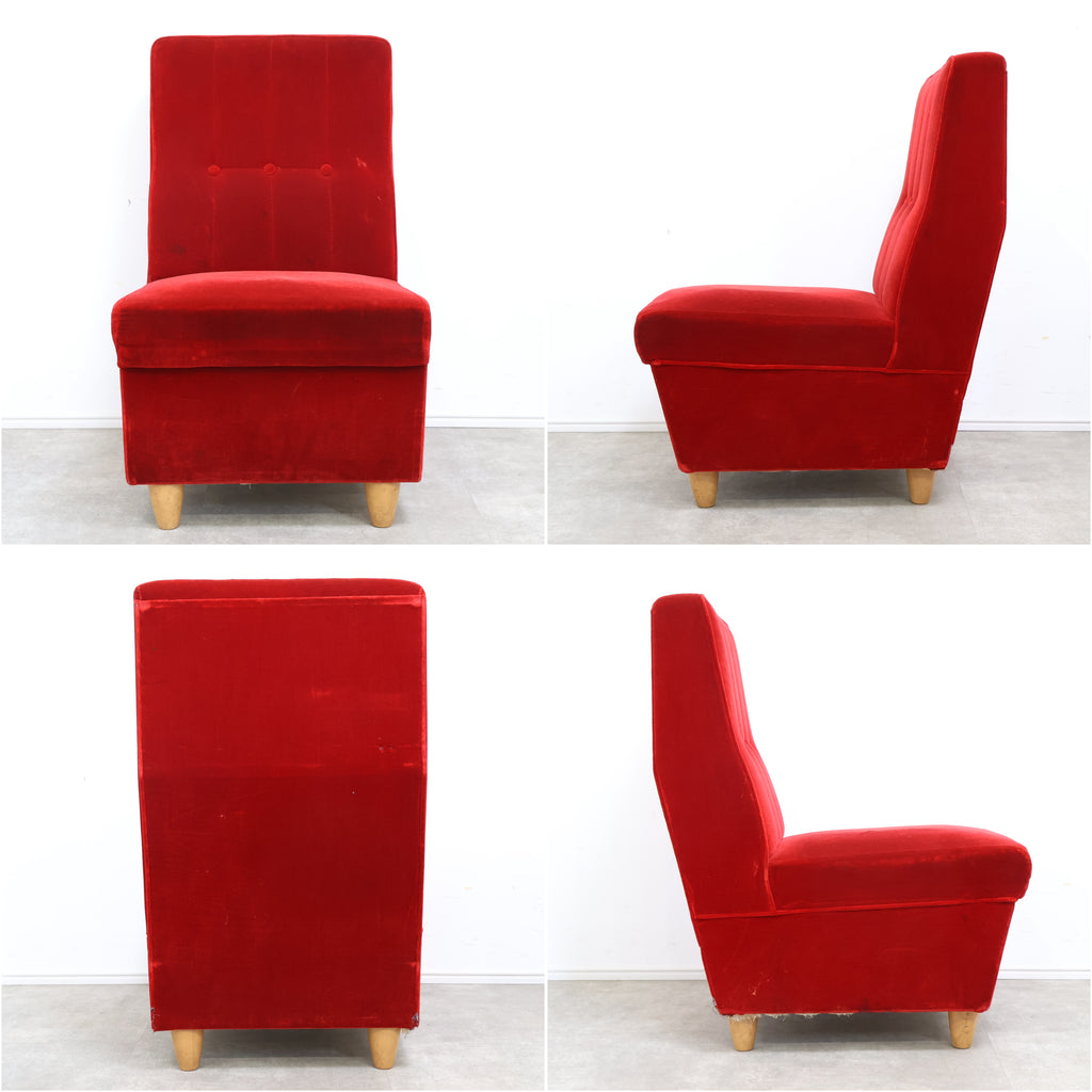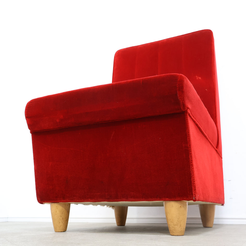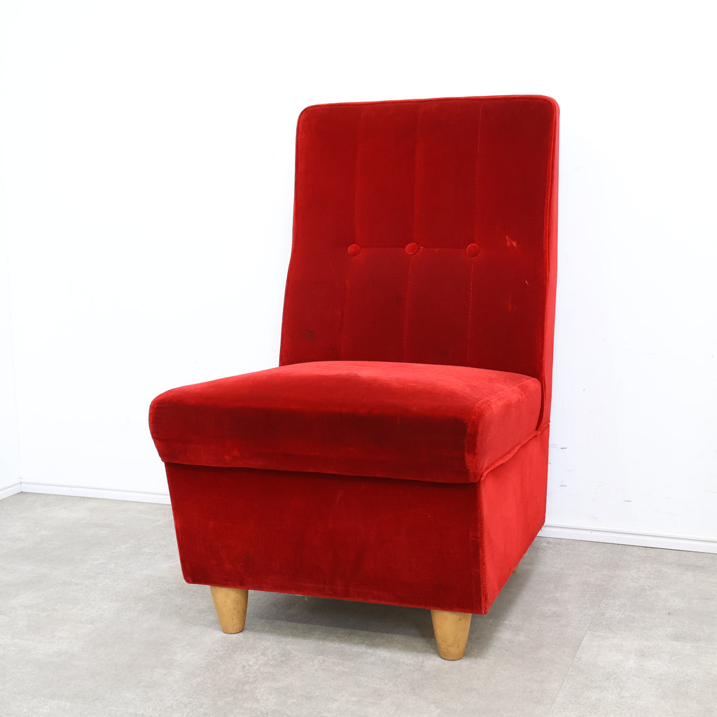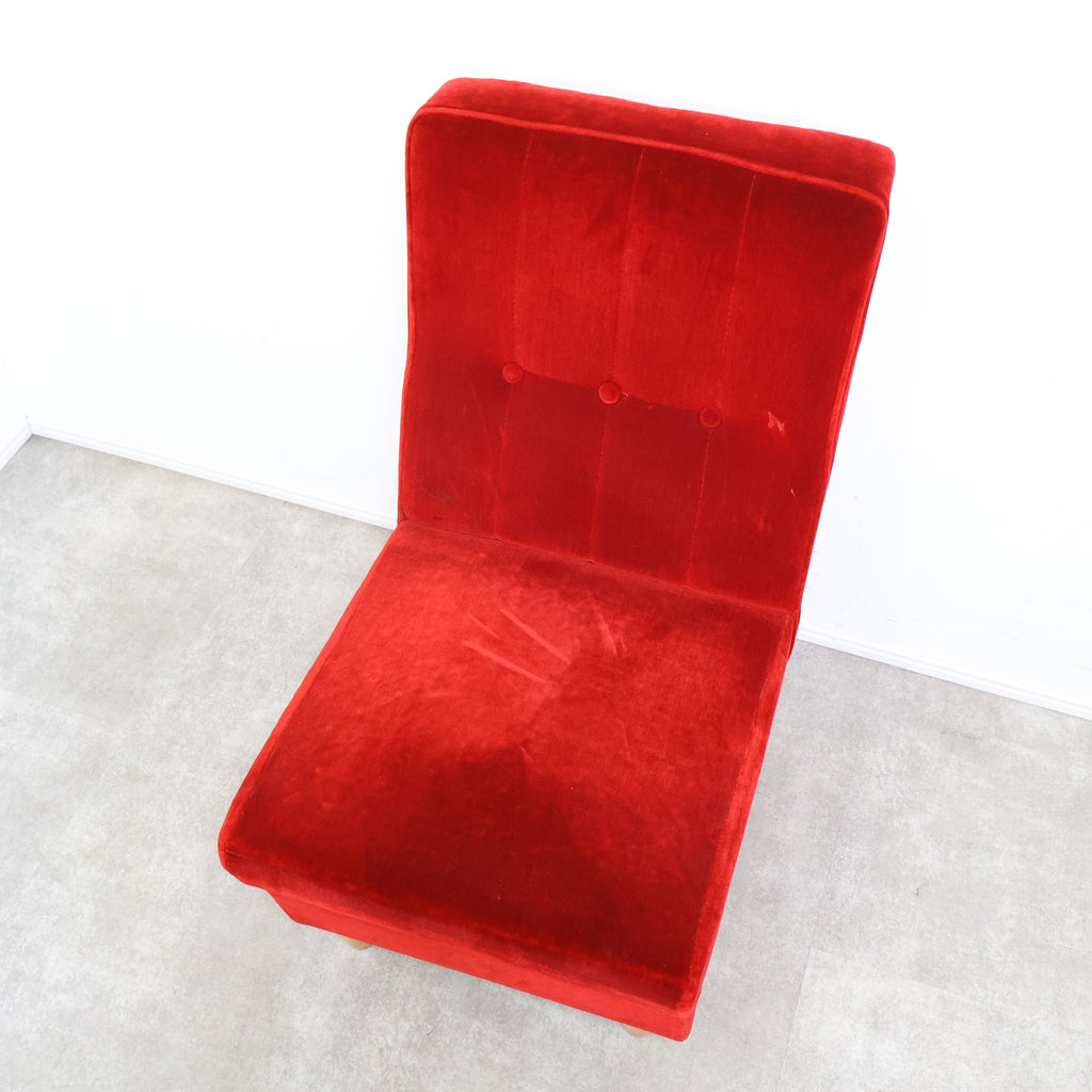 鮮やかな赤いベロアの色が綺麗な昭和レトロなソファです。昔懐かしい純喫茶やラウンジなどでよく見かけますね。フカフカで座面が低いので長時間座っていても楽チンです。