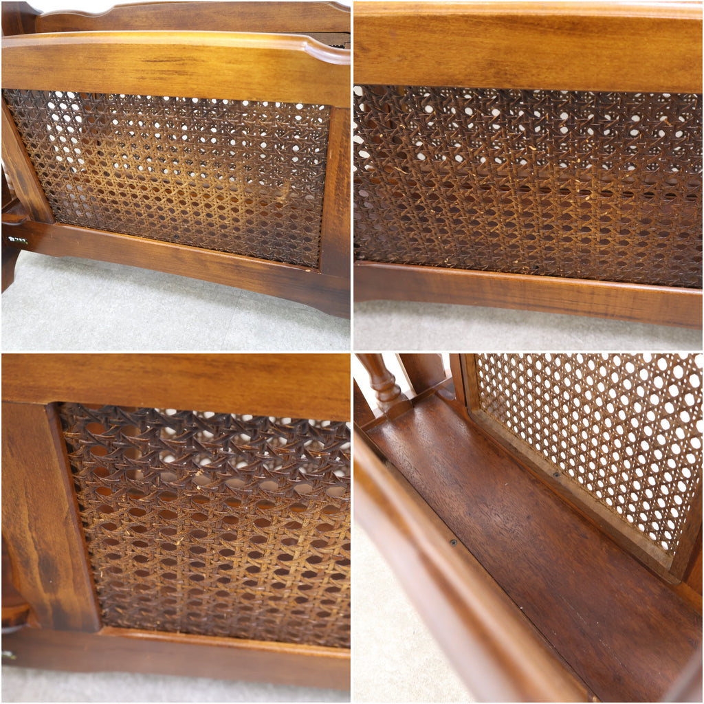 オールドカリモクのマガジンラックです。シックでレトロな雰囲気と木の質感はカリモクらしいですね。正面のラタン編みのメッシュのデザインが圧迫感なく優しい印象です。雑誌や本、新聞などをたくさん収納できますよ。