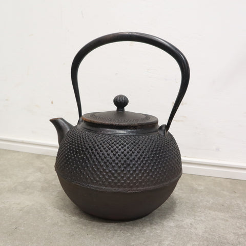 大きめサイズの鉄瓶です。日本茶や紅茶、白湯などを素早く沸かすことができ、丈夫で長持ちする素敵な鉄瓶は不動の人気を誇ります。少しサビつきがありますがまだまだお使いいただけますよ。