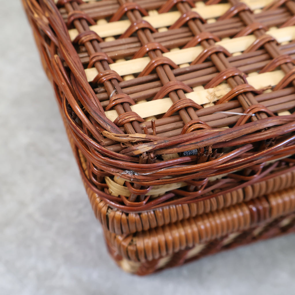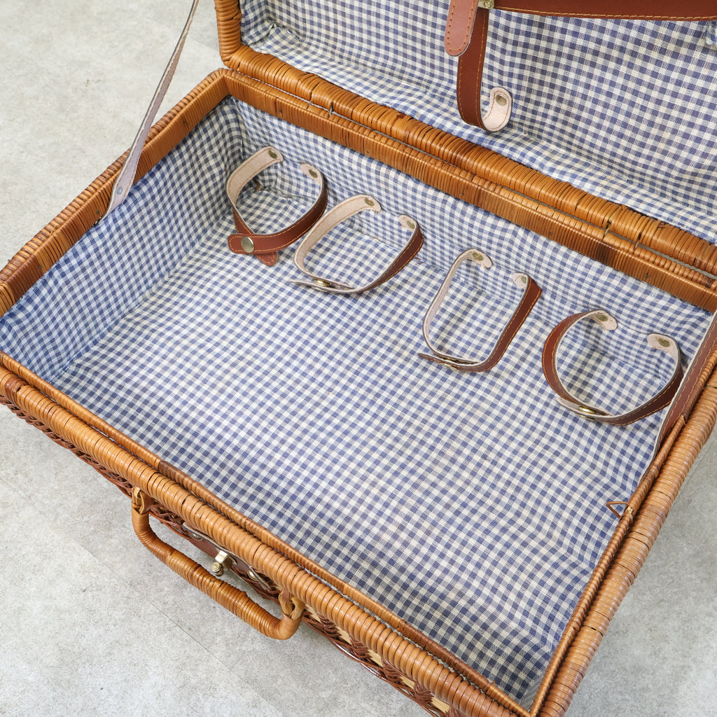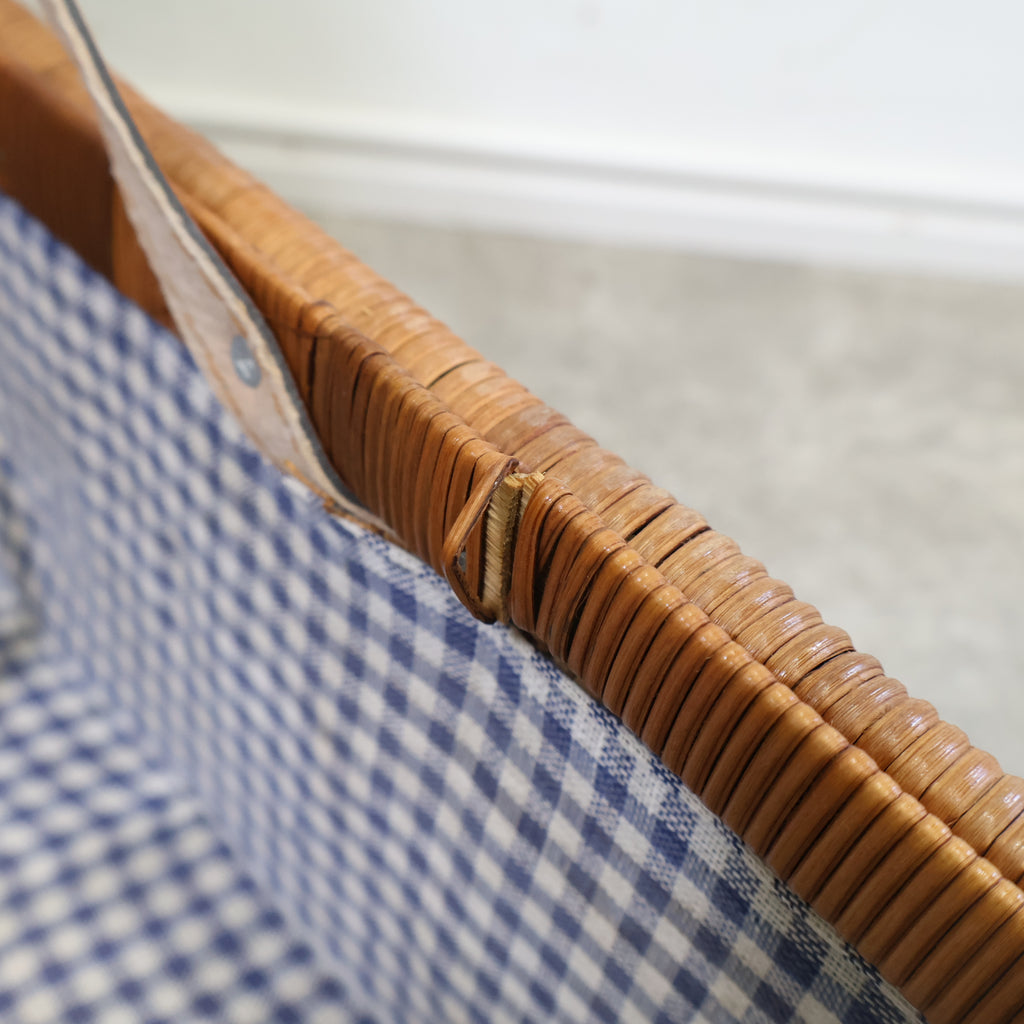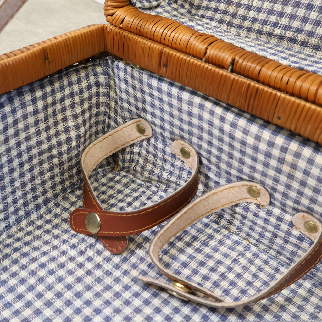 ラタン(籐)でできたピクニック用のバスケットです。くっきりとした格子模様がレトロで、ネイビーのギンガムチェックの内張の布が特徴的でかわいいです。またボトルなどが倒れないように仕舞えるのも嬉しいですね。