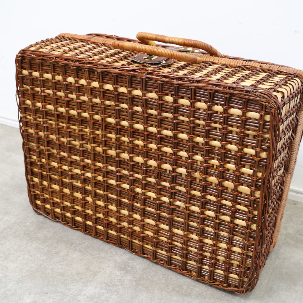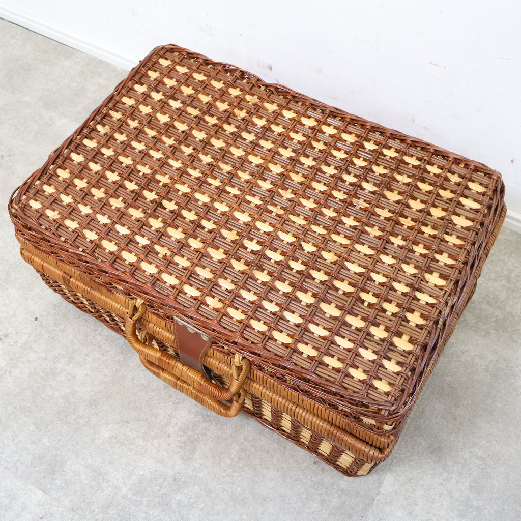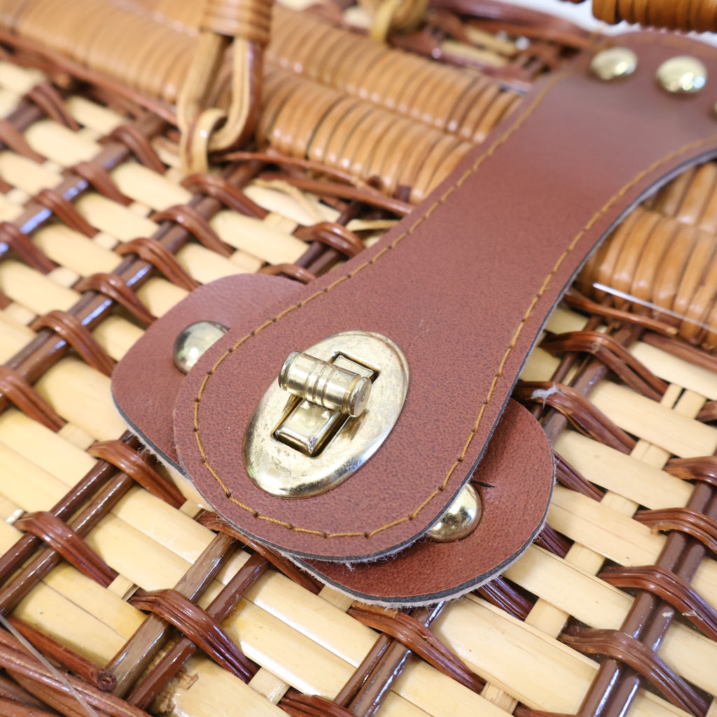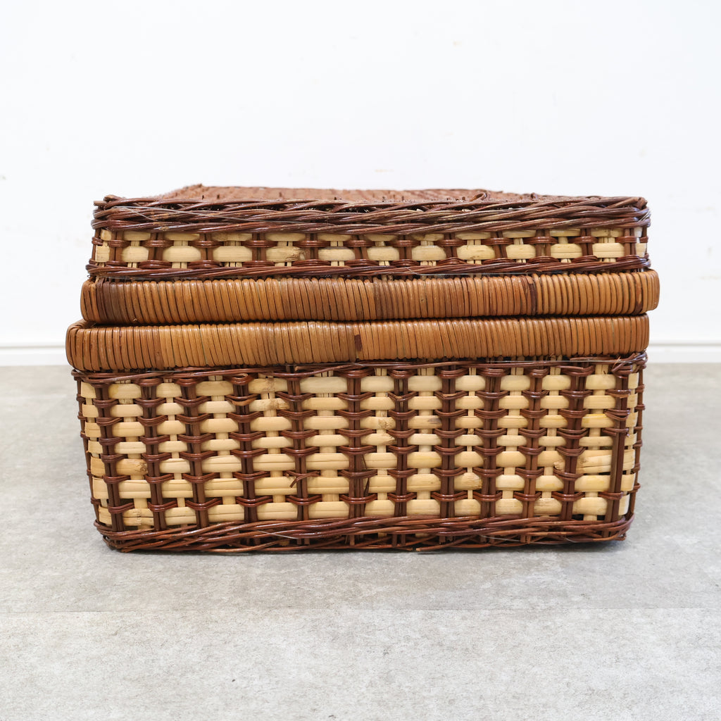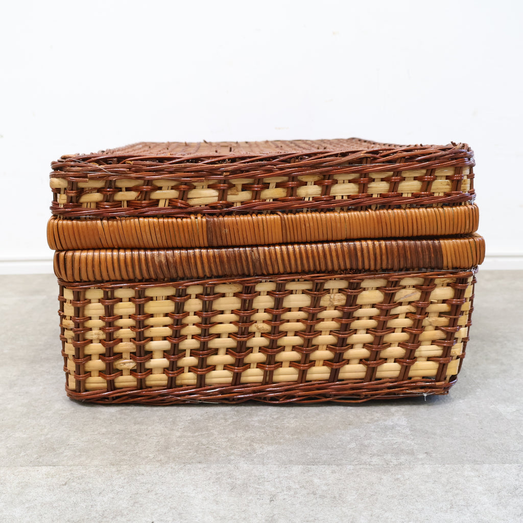 ラタン(籐)でできたピクニック用のバスケットです。くっきりとした格子模様がレトロで、ネイビーのギンガムチェックの内張の布が特徴的でかわいいです。またボトルなどが倒れないように仕舞えるのも嬉しいですね。