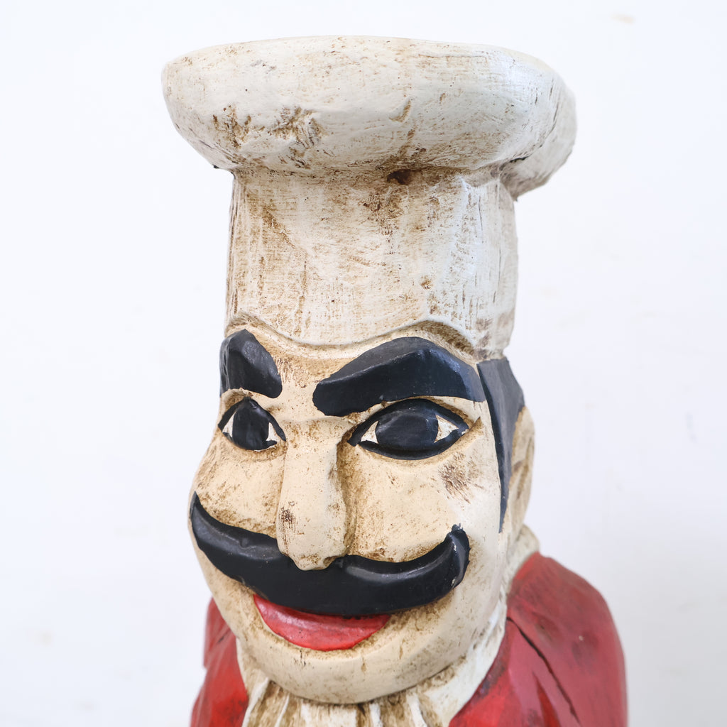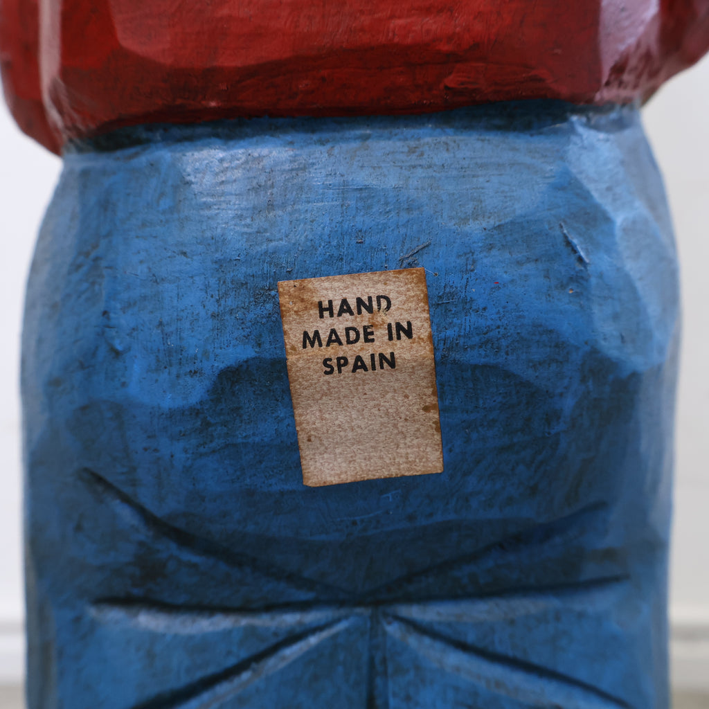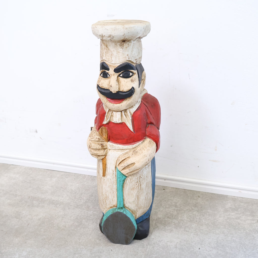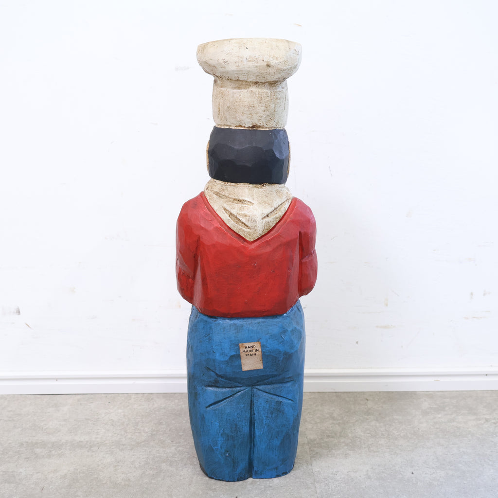木製の人形のワインボトルケースです。スペイン製のハンドメイドで、コックさんの笑顔の表情がリアルに再現されていますね。配色もカラフルで明るい印象があります。