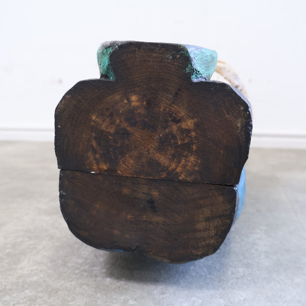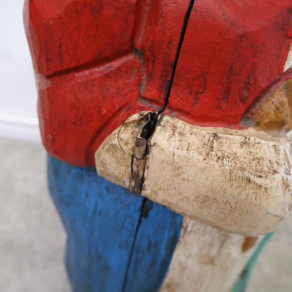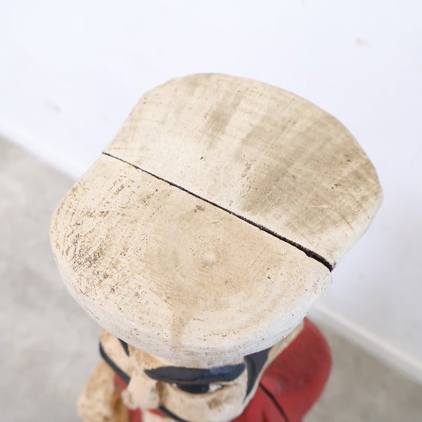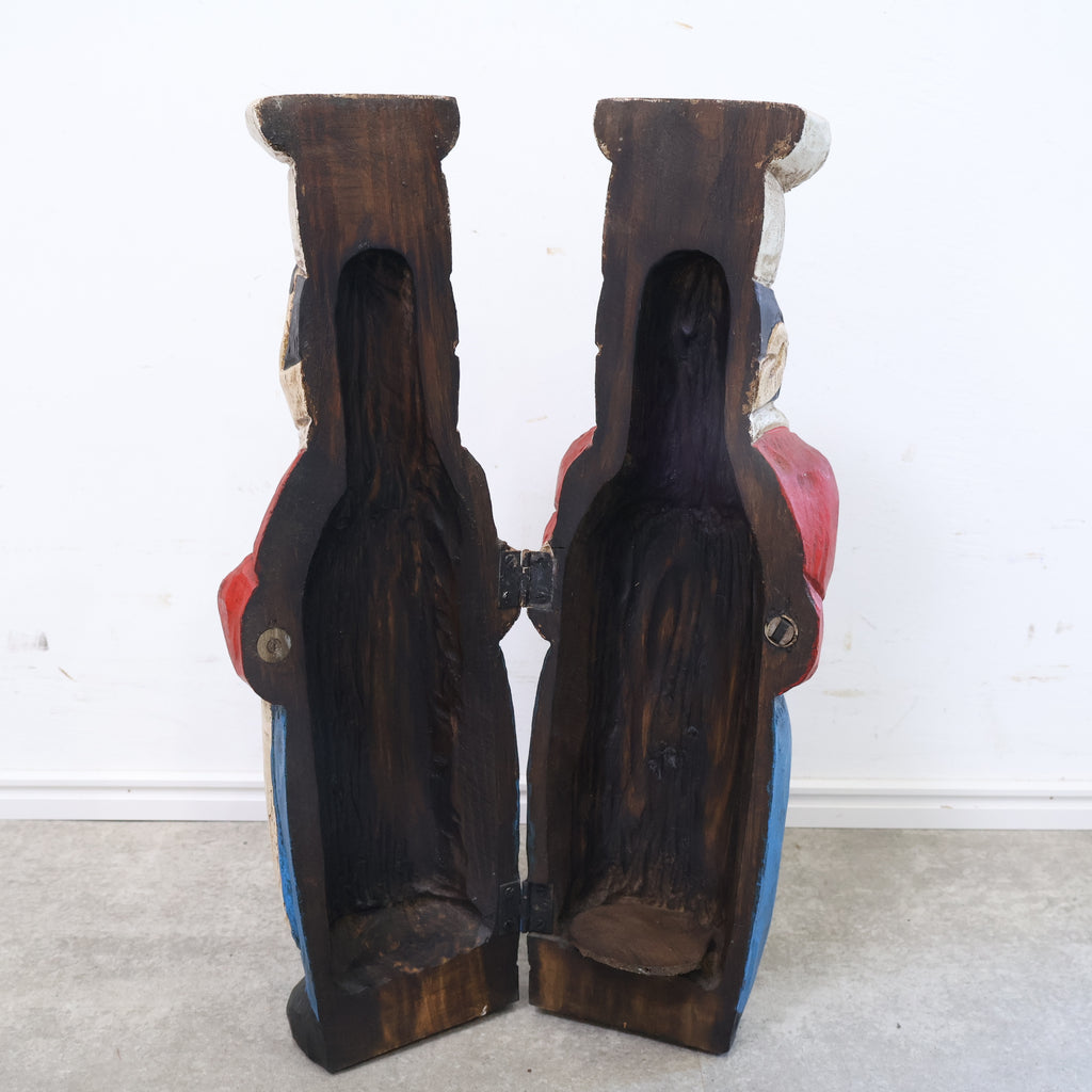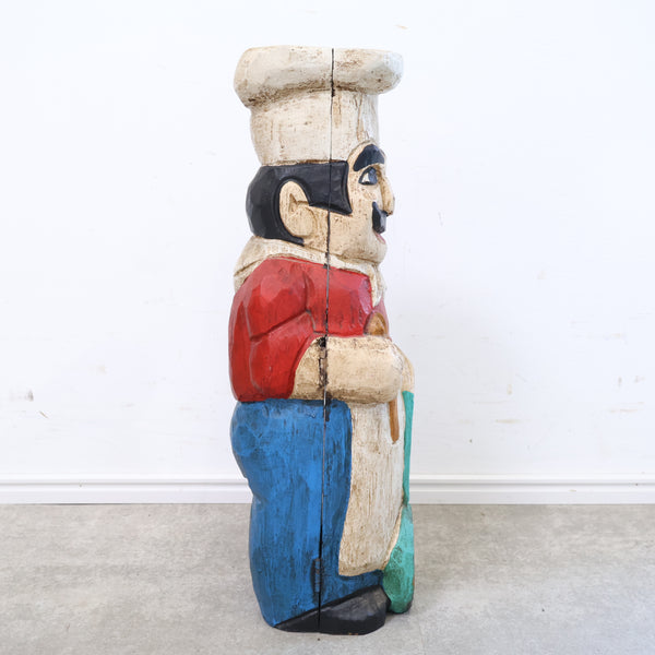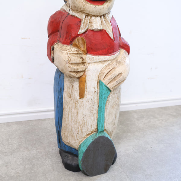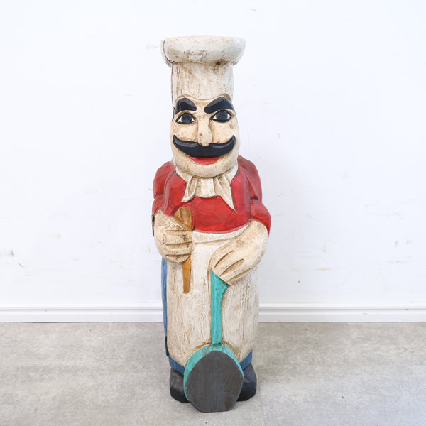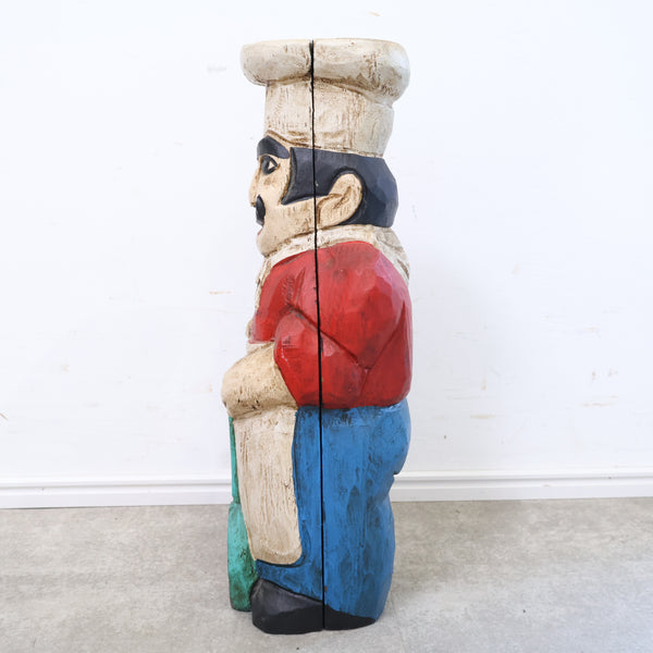 木製の人形のワインボトルケースです。スペイン製のハンドメイドで、コックさんの笑顔の表情がリアルに再現されていますね。配色もカラフルで明るい印象があります。