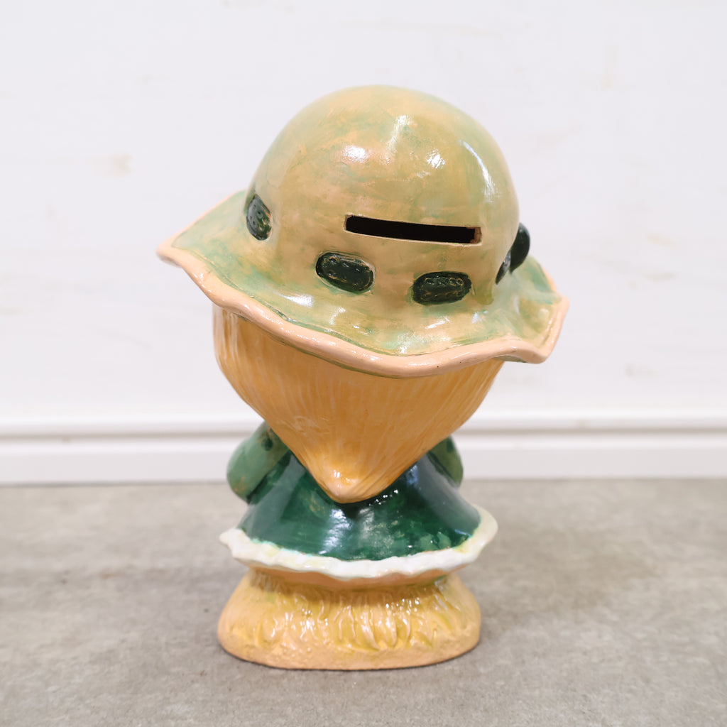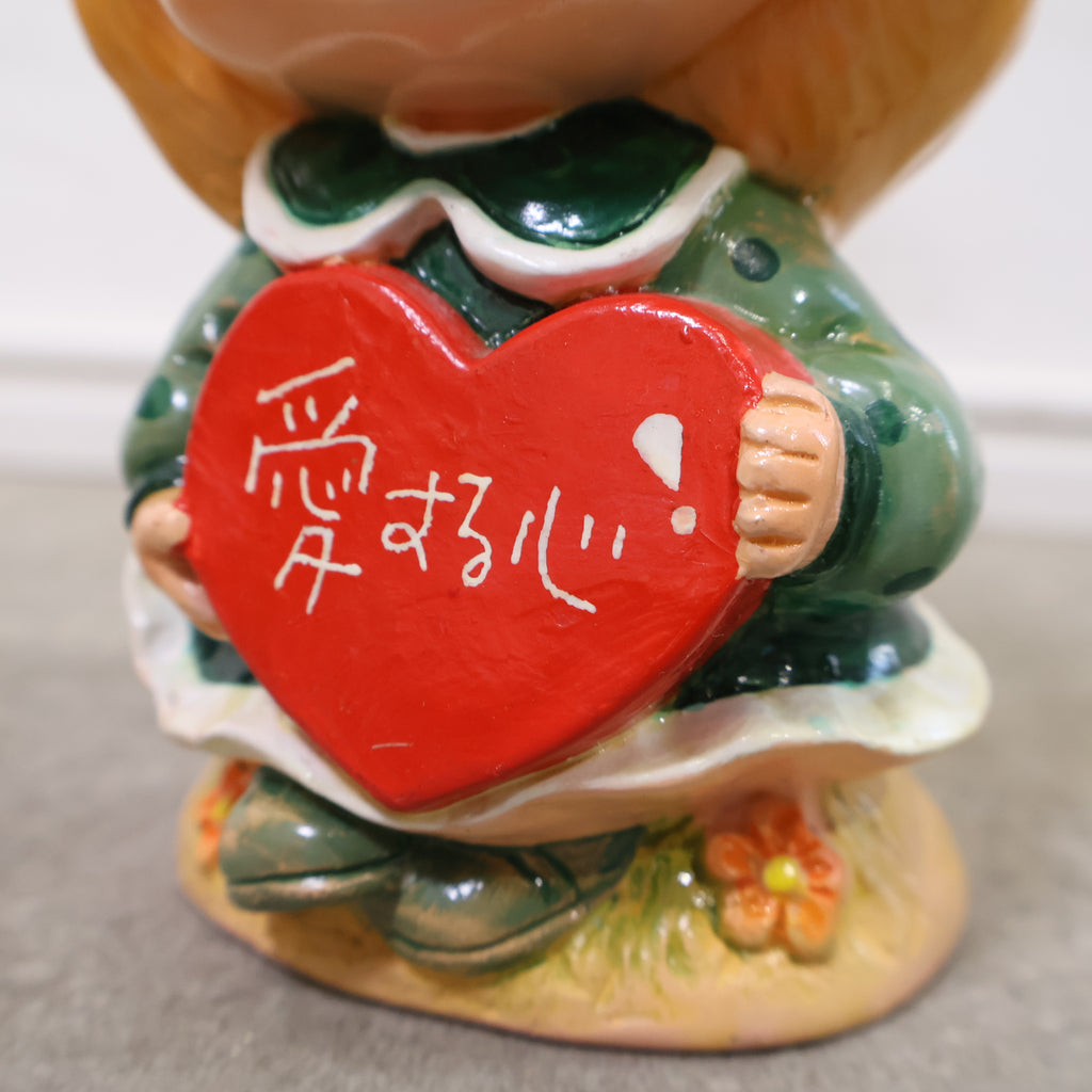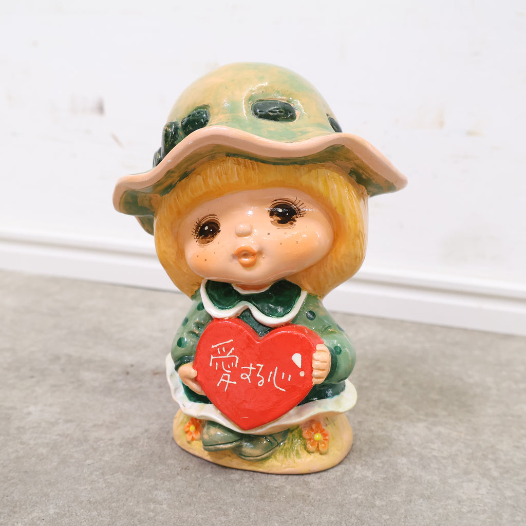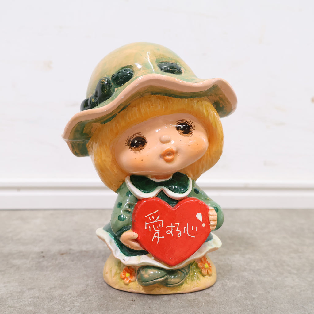 可愛らしい女の子の貯金箱です。大きな帽子が特徴的で、胸元に「愛する心」と書かれたハートを持っていて、愛嬌を感じますね。