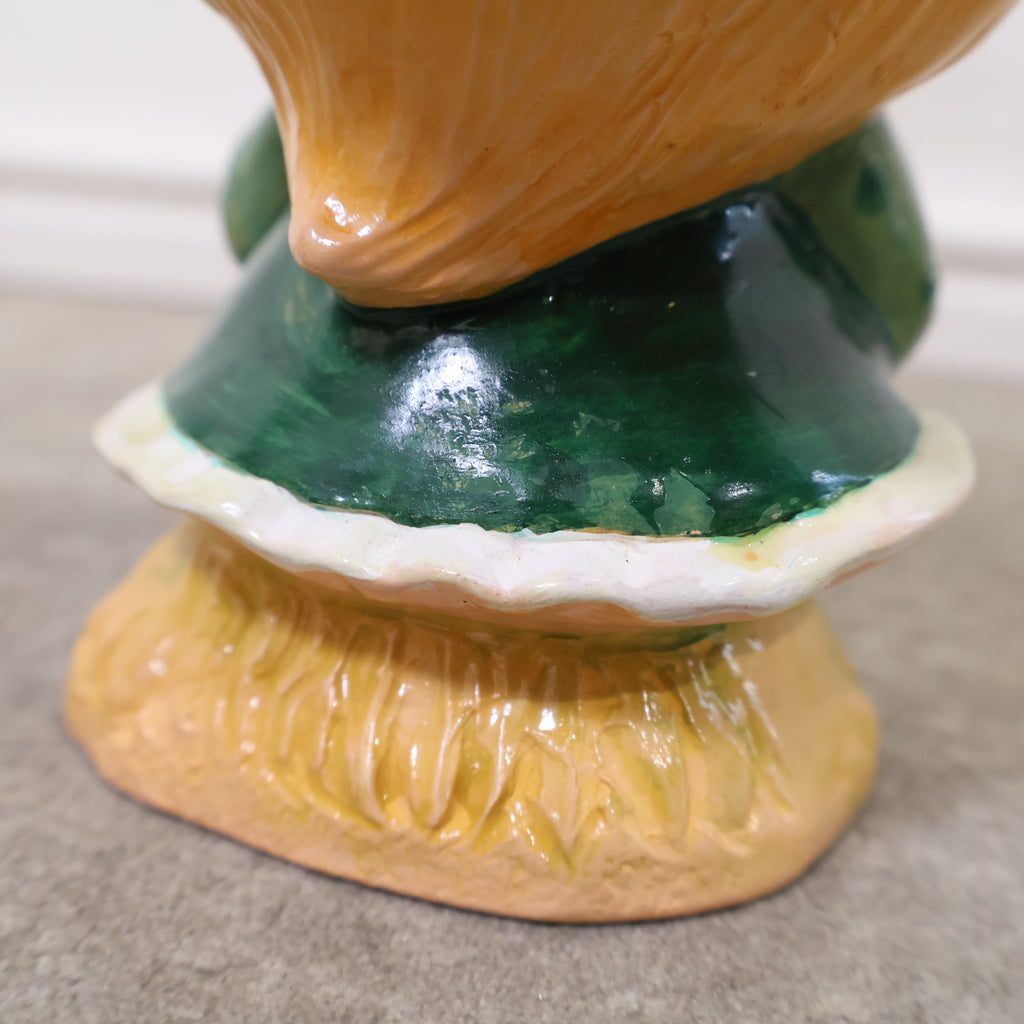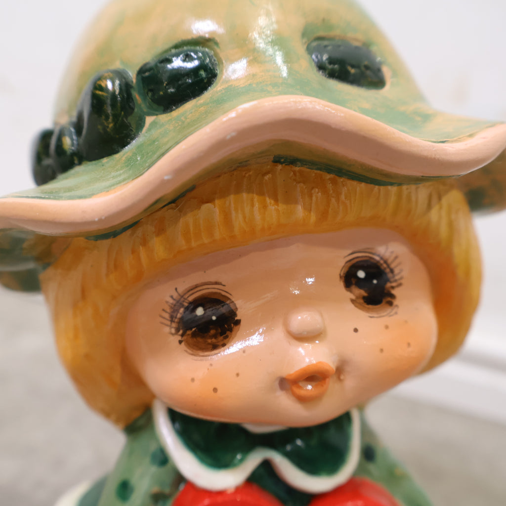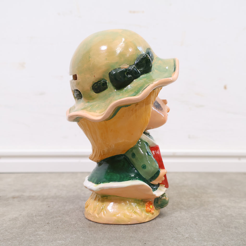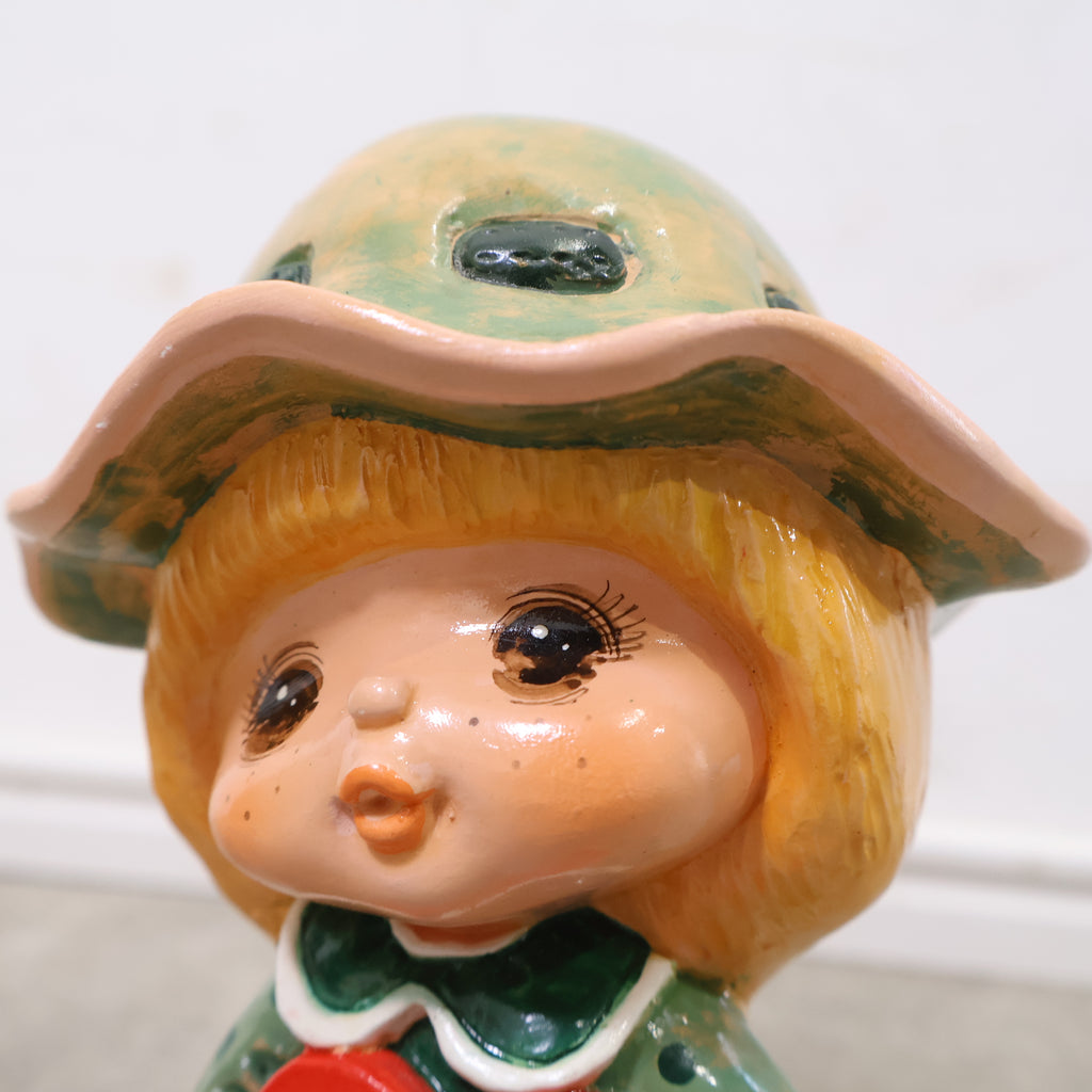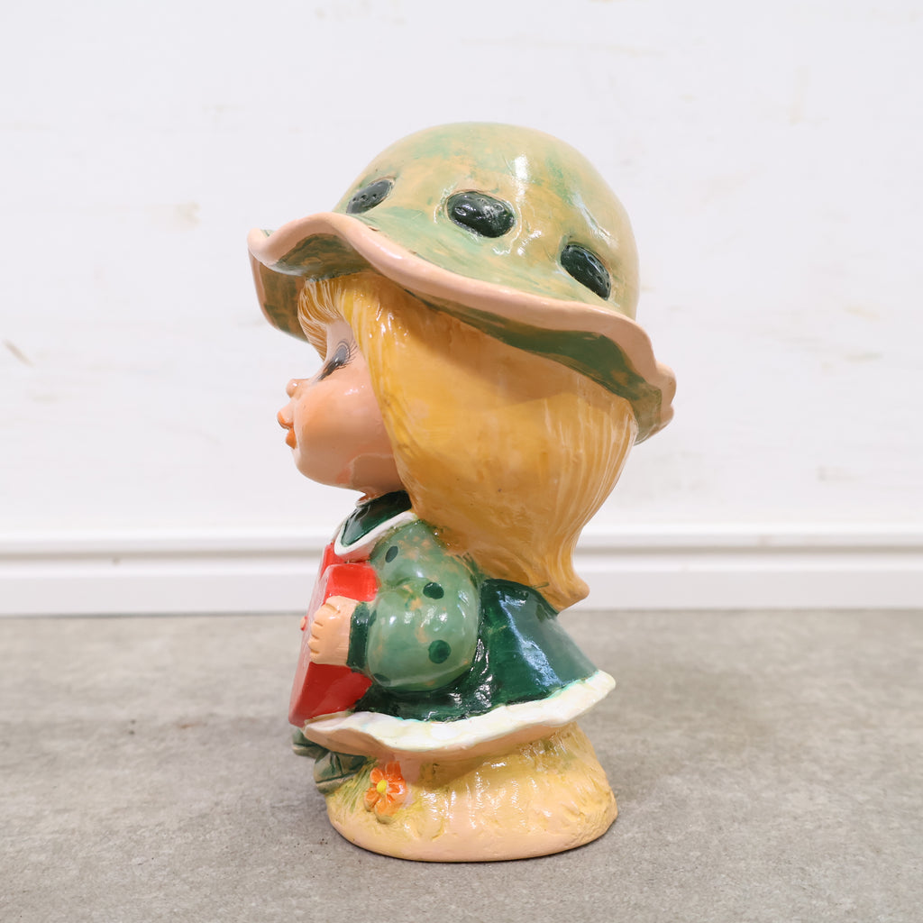 可愛らしい女の子の貯金箱です。大きな帽子が特徴的で、胸元に「愛する心」と書かれたハートを持っていて、愛嬌を感じますね。