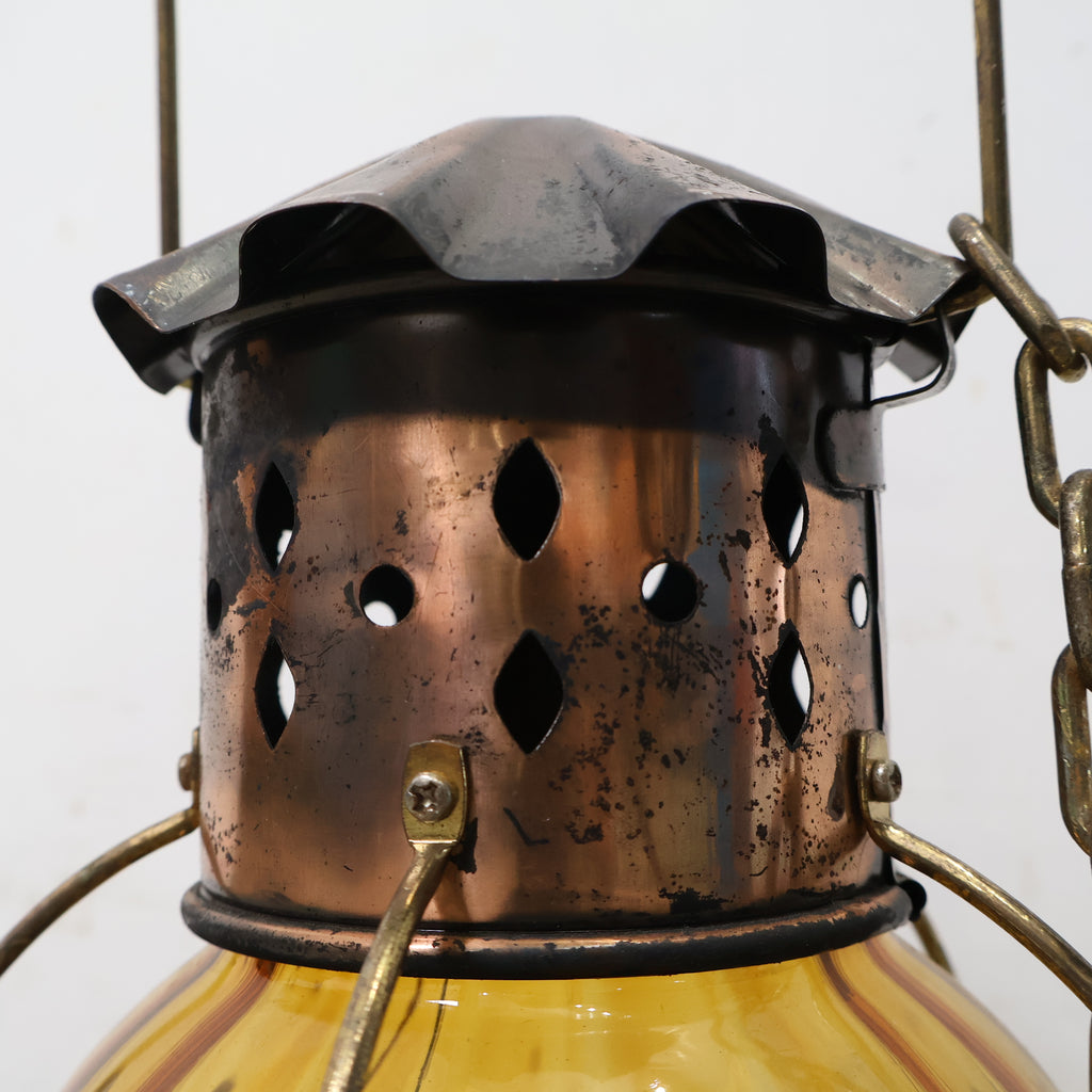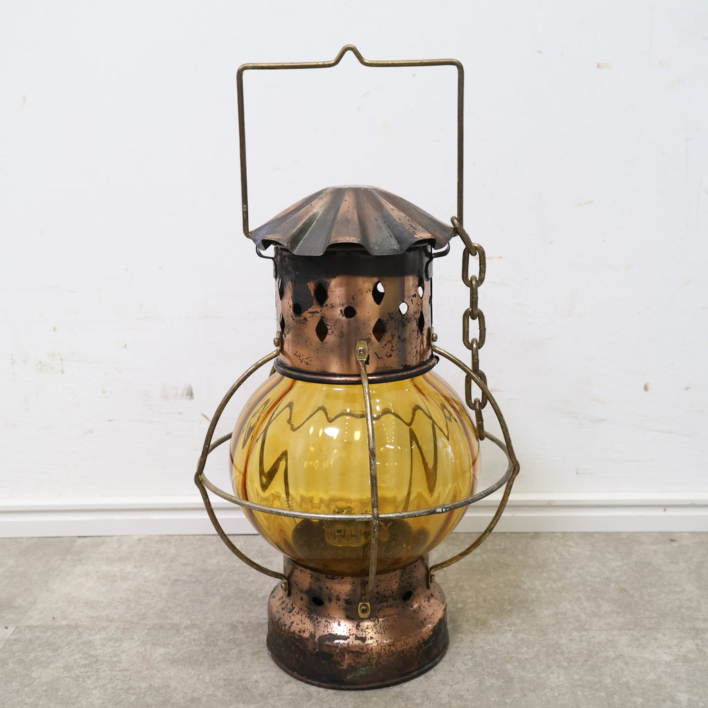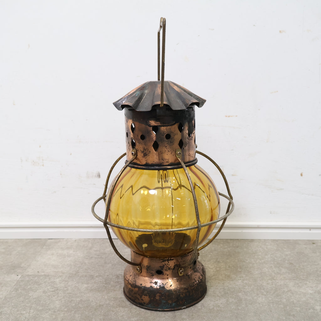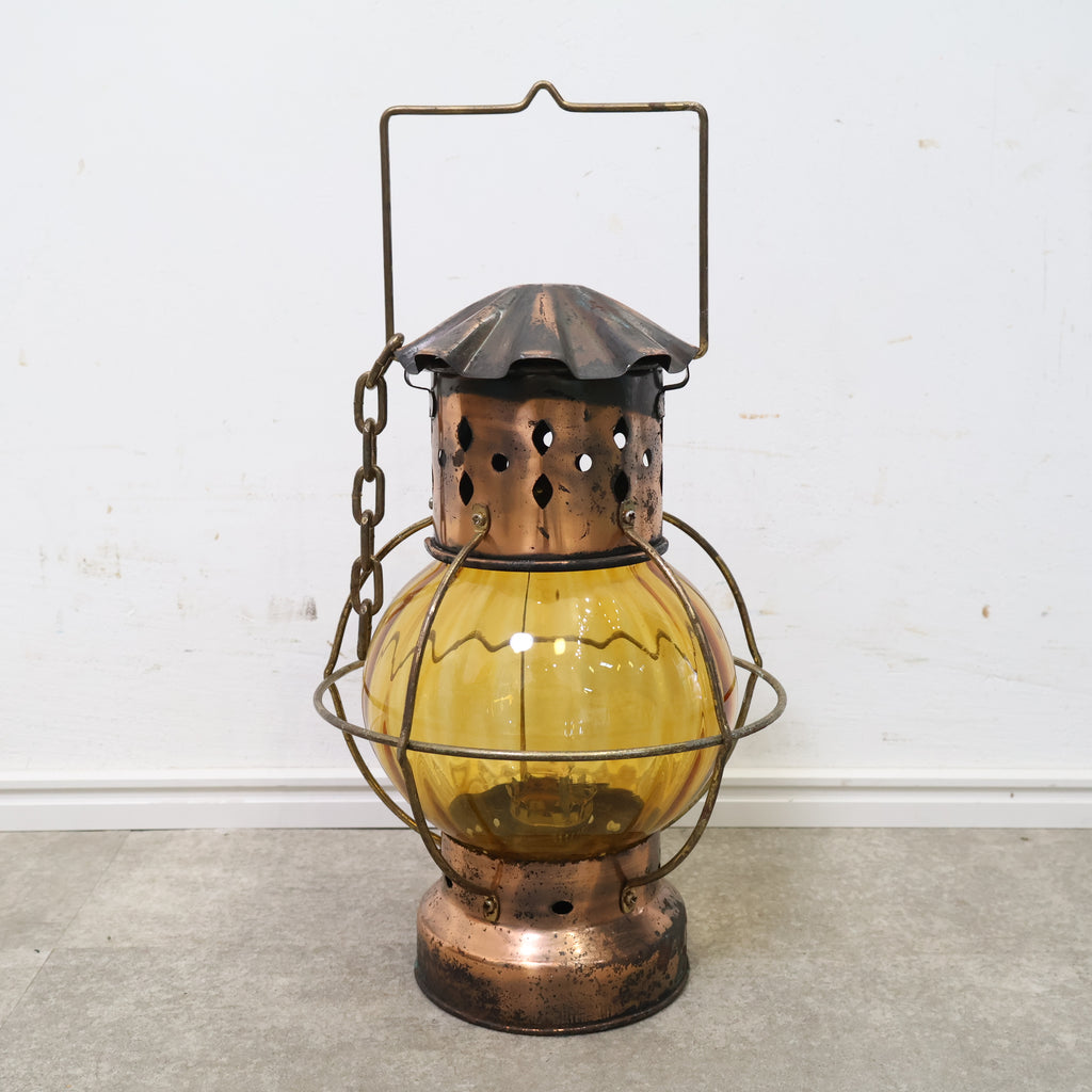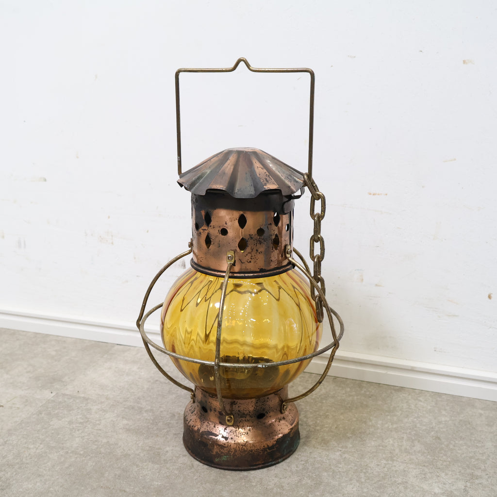 イエローガラスがオシャレなオイルランタンです。アンティーク調な質感と全体の雰囲気がレトロでかわいらしく、年月が経っていてもこの独特な世界観はカッコよくて際立ちますね。