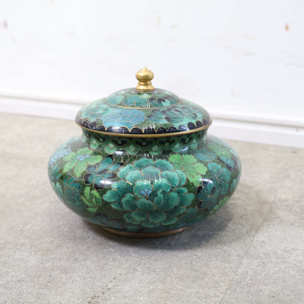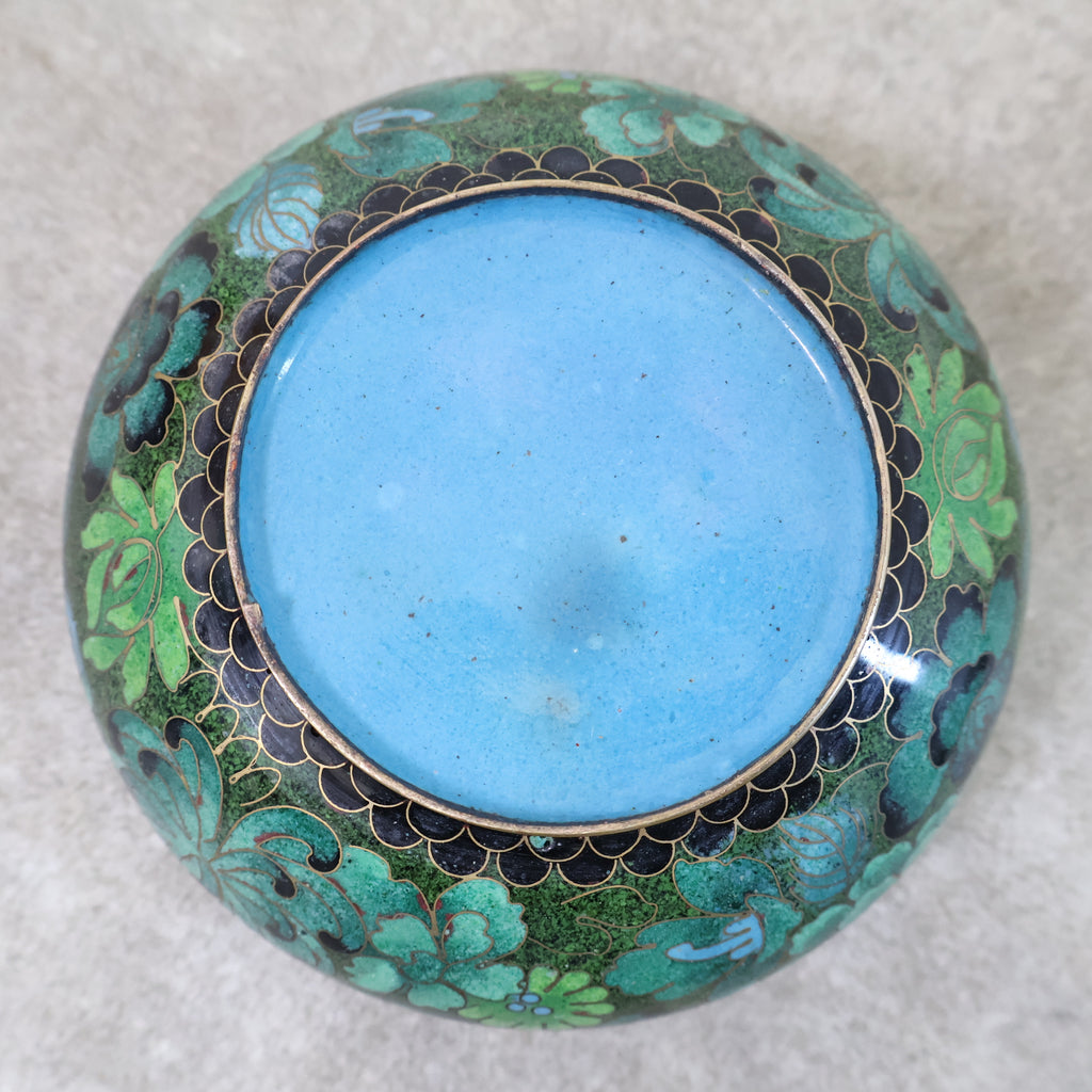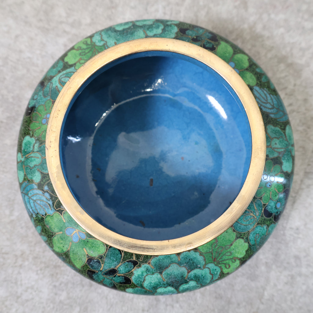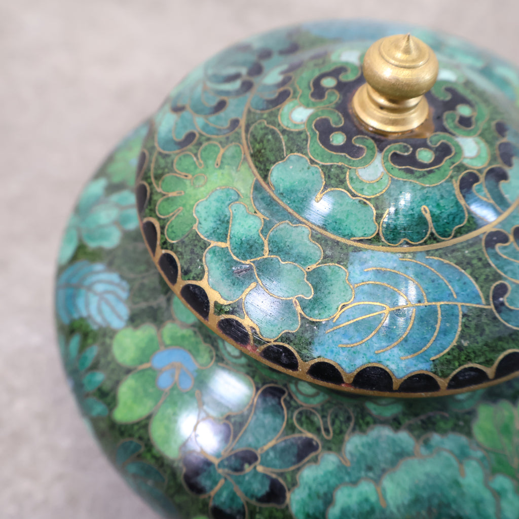 七宝焼の小物入れです。指輪や小ぶりのアクセサリーを入れるのにぴったりの小物入れで、濃淡のある緑や金色でかたどった花模様がとっても華やかですね。蓋を開けると綺麗なエメラルドグリーンが目を惹きます。