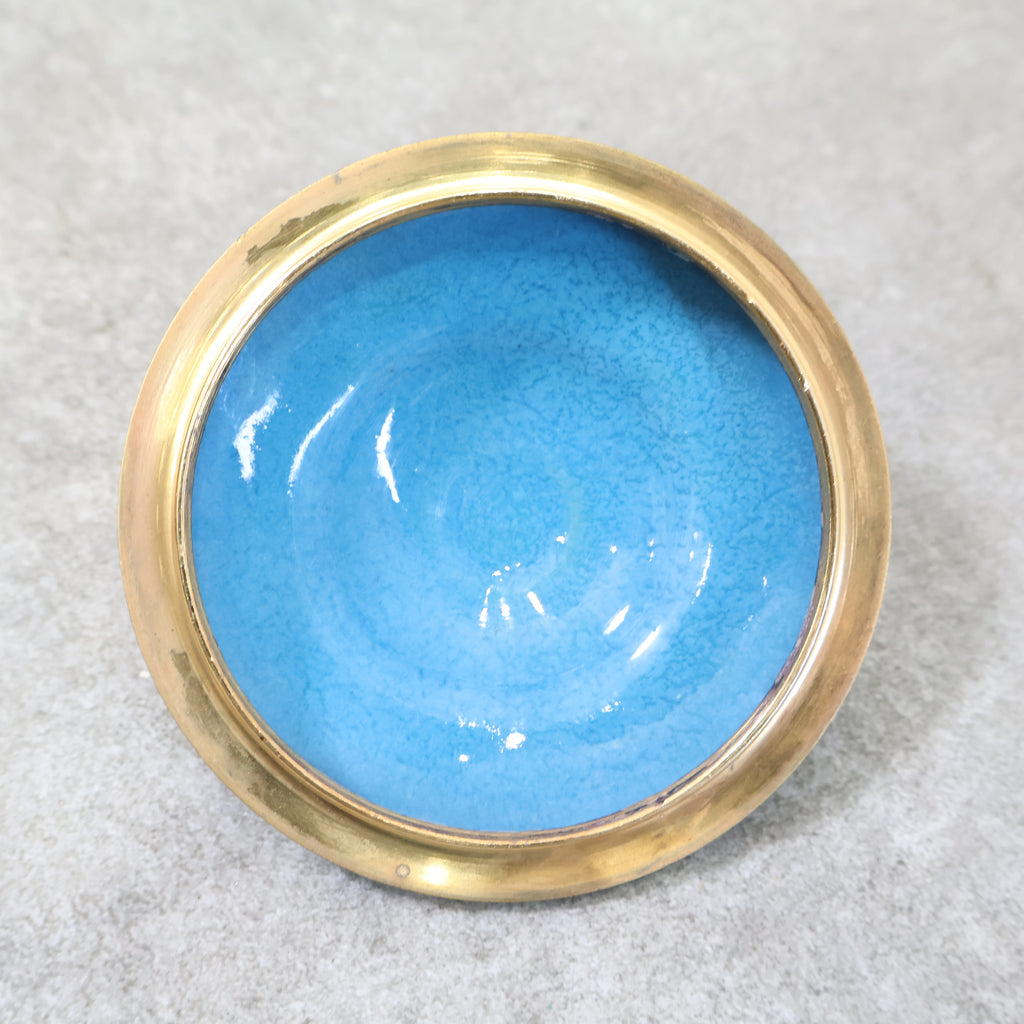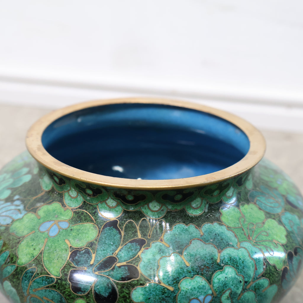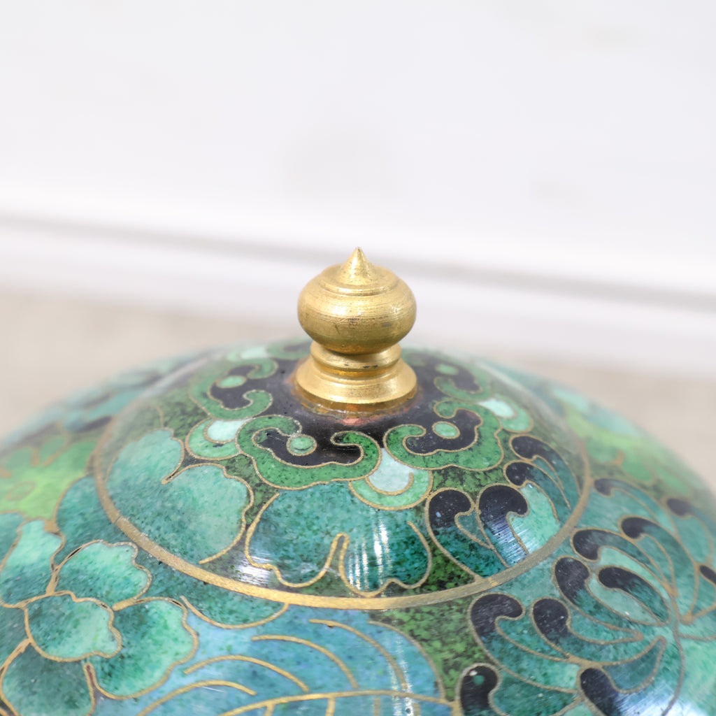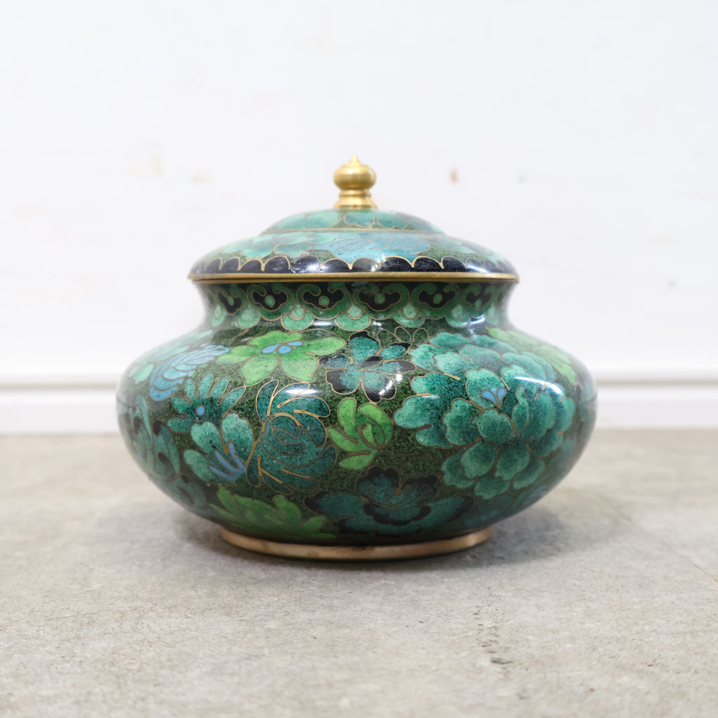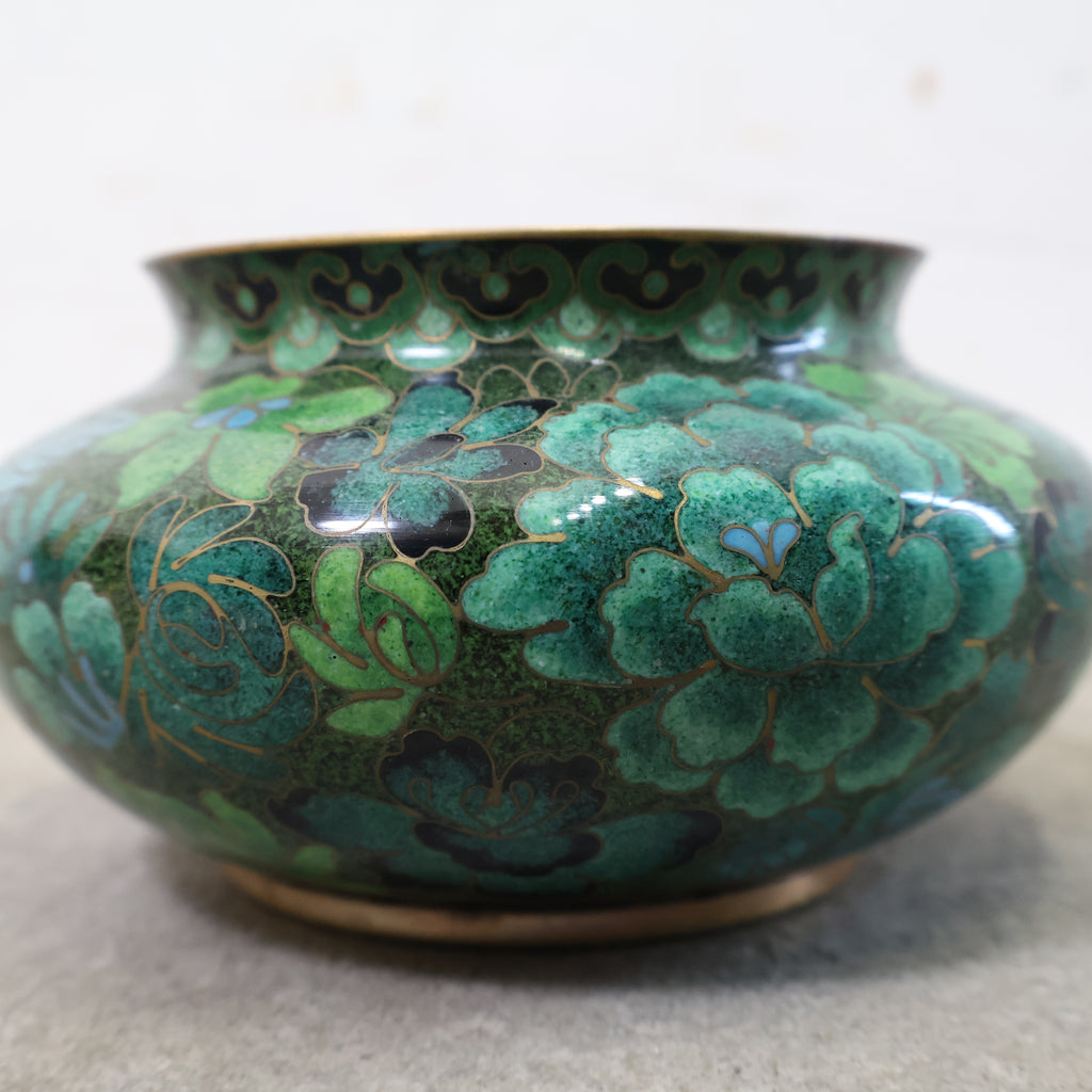 七宝焼の小物入れです。指輪や小ぶりのアクセサリーを入れるのにぴったりの小物入れで、濃淡のある緑や金色でかたどった花模様がとっても華やかですね。蓋を開けると綺麗なエメラルドグリーンが目を惹きます。