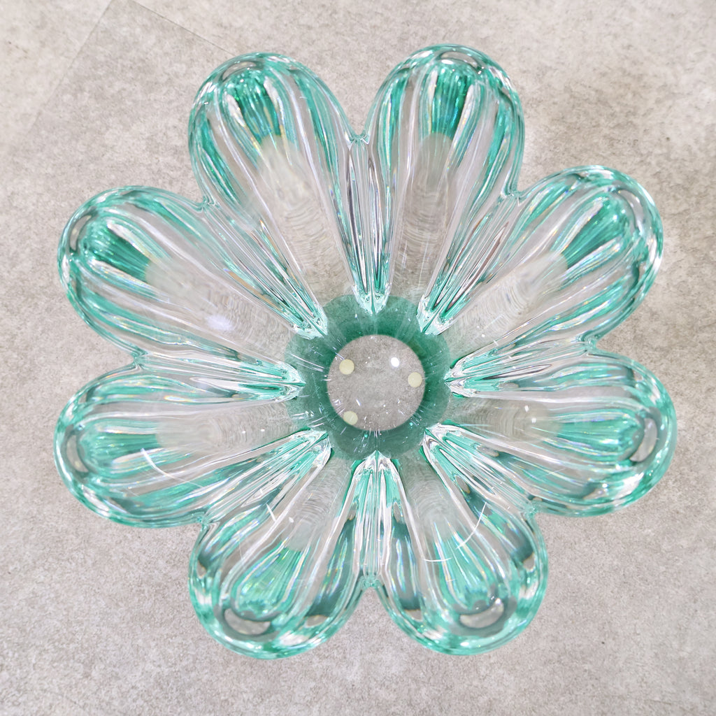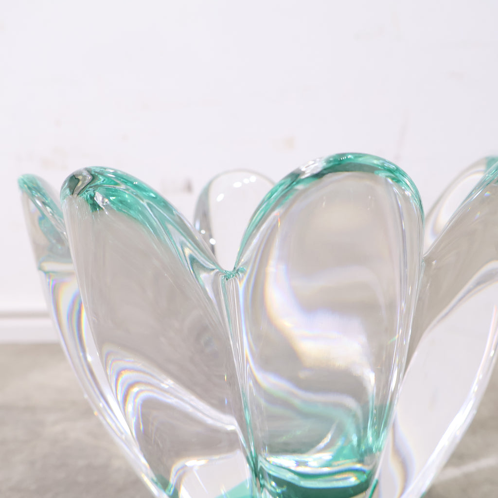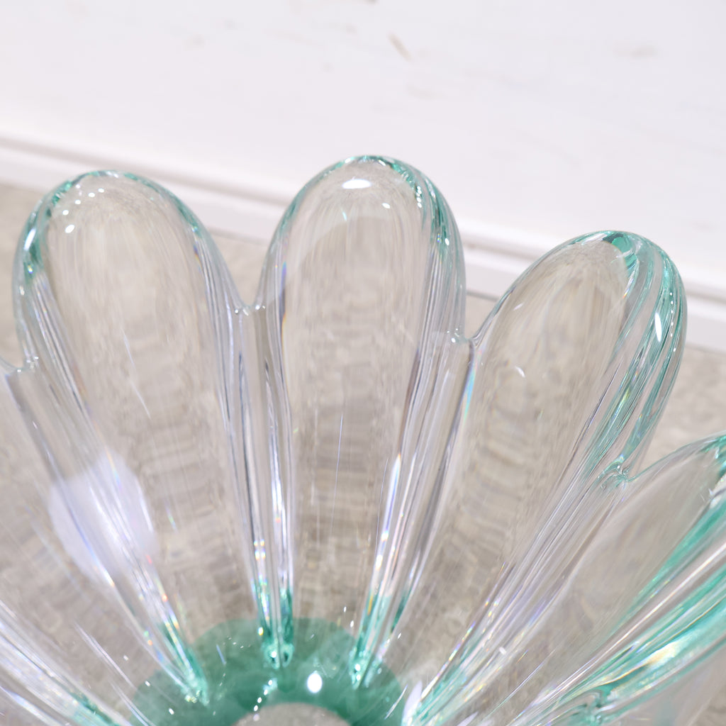 クリアガラスか綺麗なフラワーベースです。花びら1片ずつが大きくデザインされ、レトロクラシカルな雰囲気があり、独特な存在感があります。