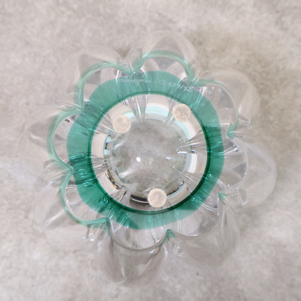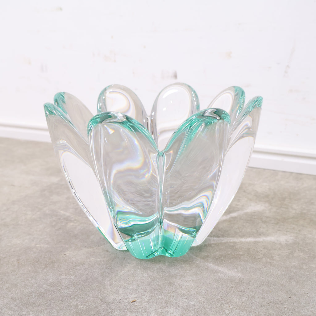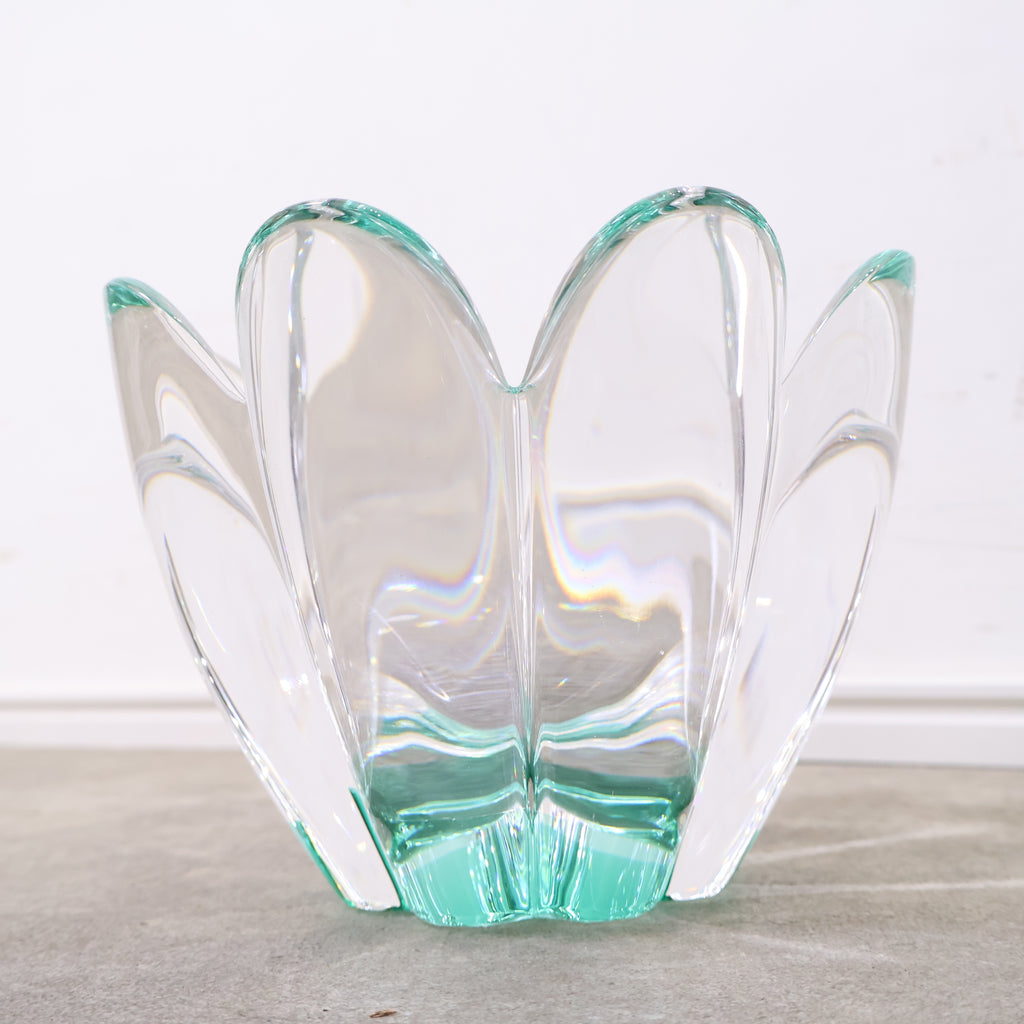 クリアガラスか綺麗なフラワーベースです。花びら1片ずつが大きくデザインされ、レトロクラシカルな雰囲気があり、独特な存在感があります。