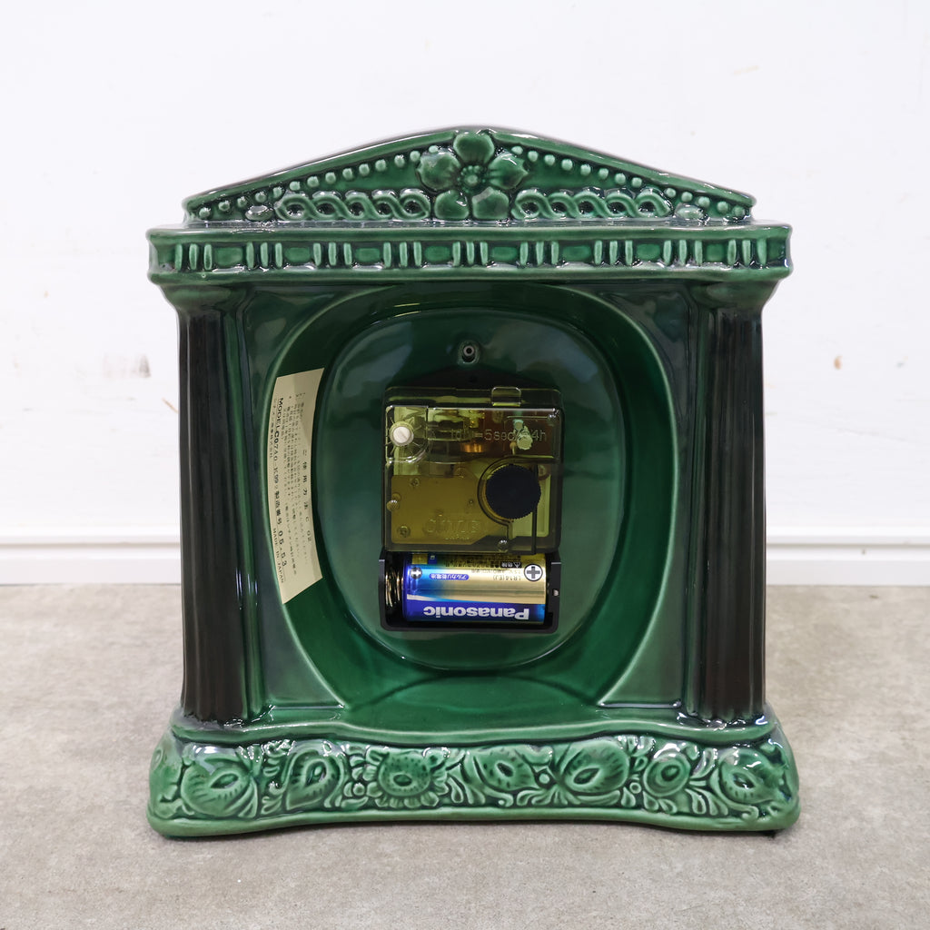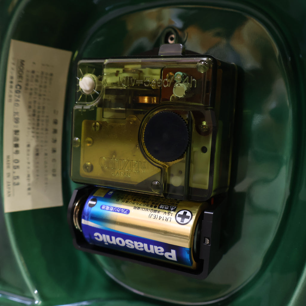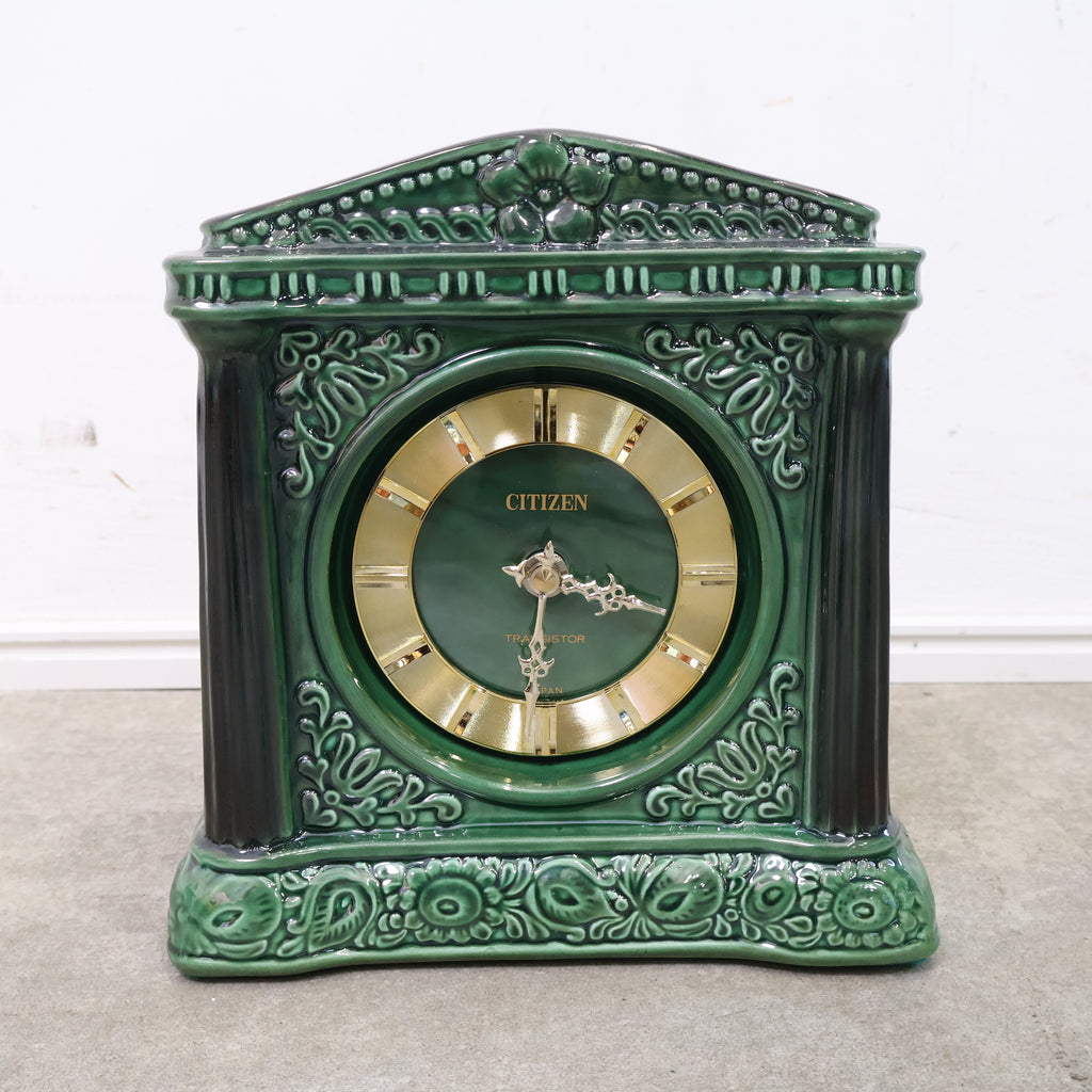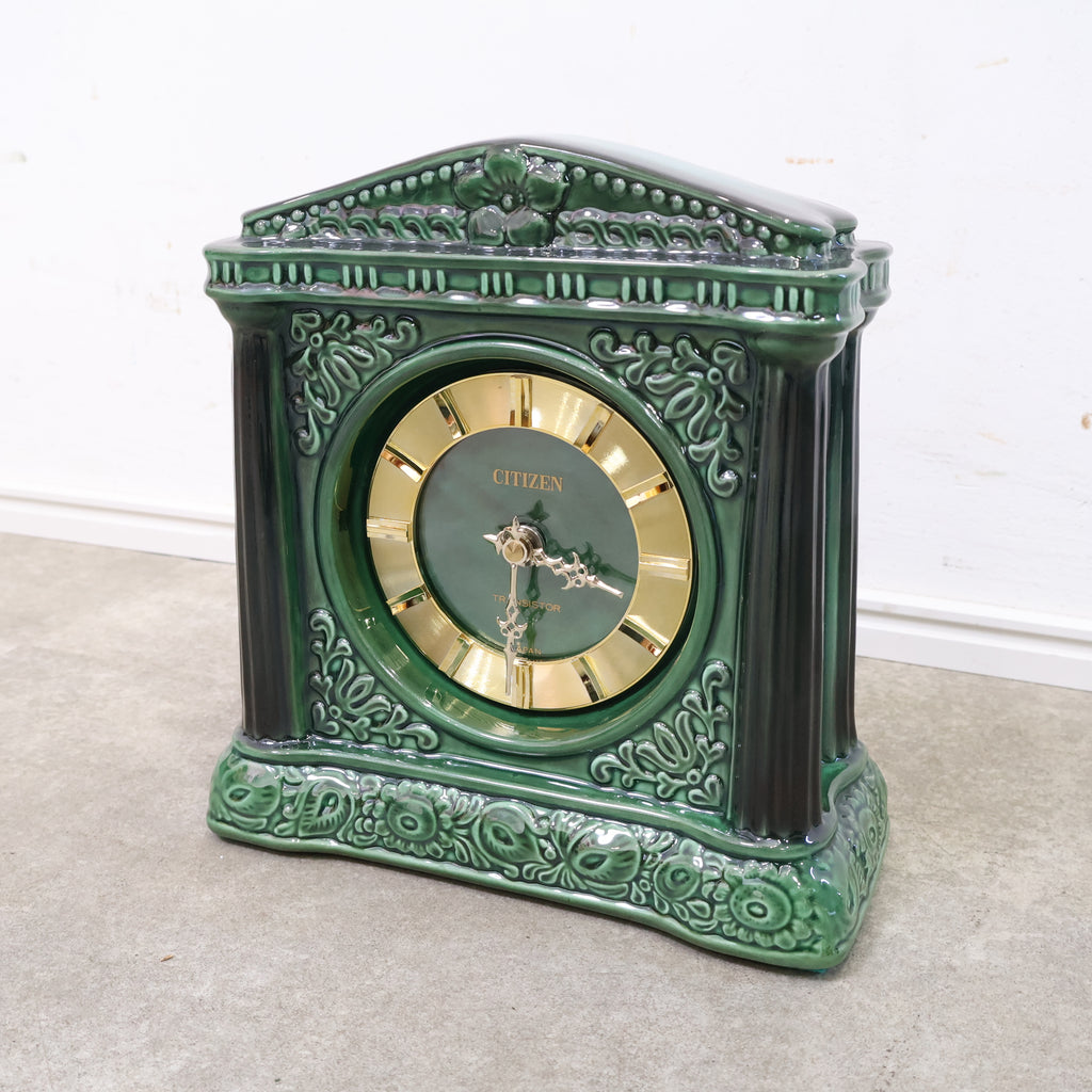 CITIZENシチズンの置時計です。深みのあるグリーンがシックでレトロなデザインで、文字盤のゴールドカラーが華やかな雰囲気ですね。