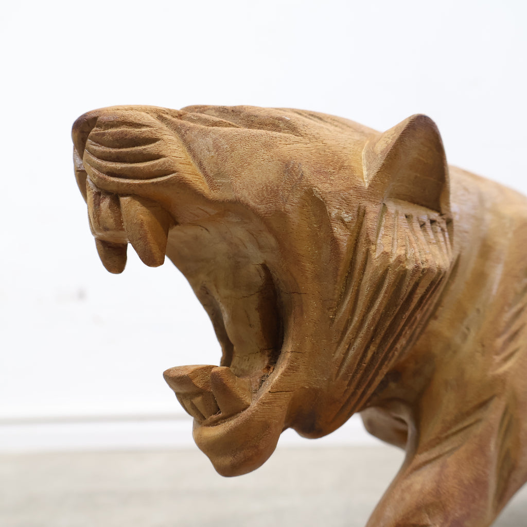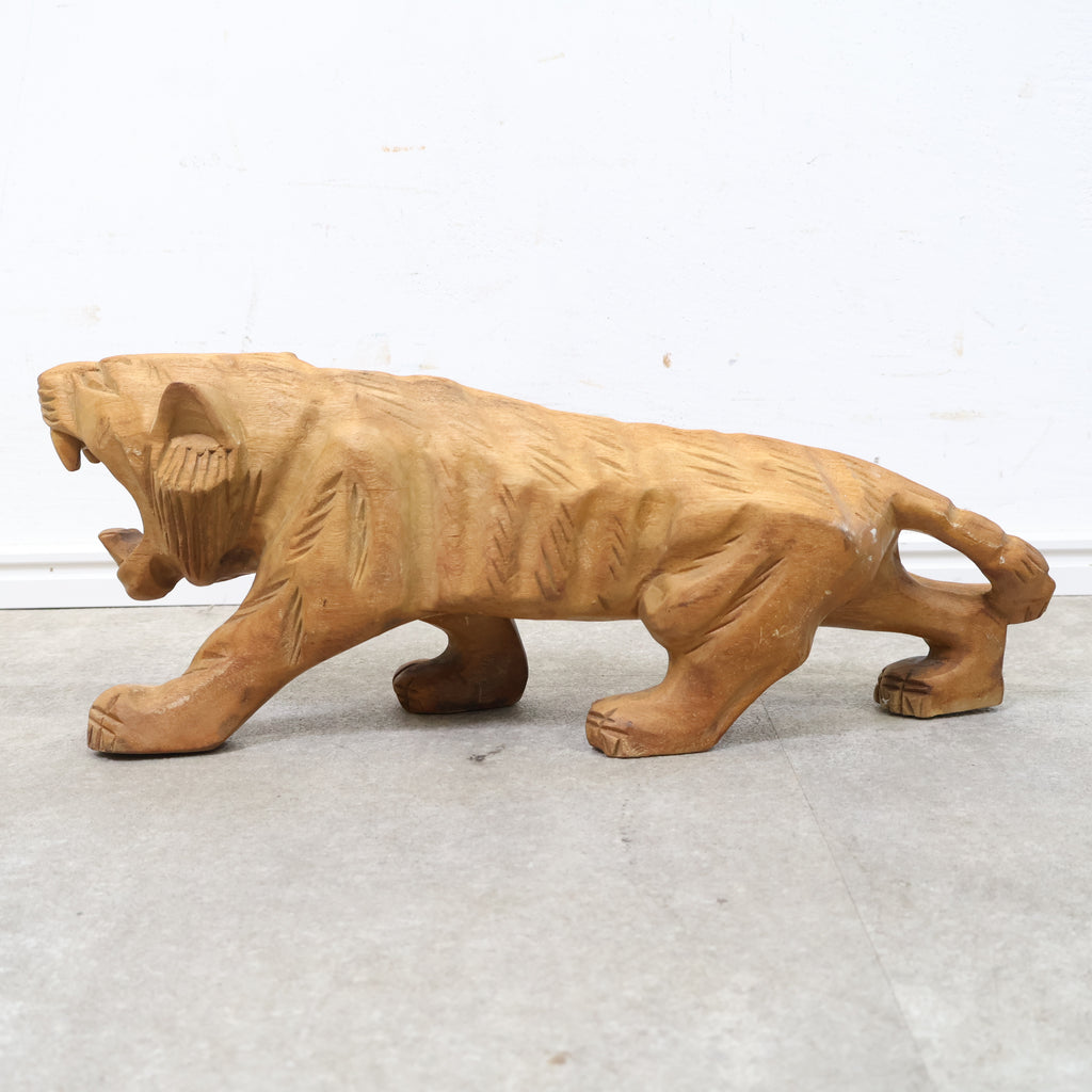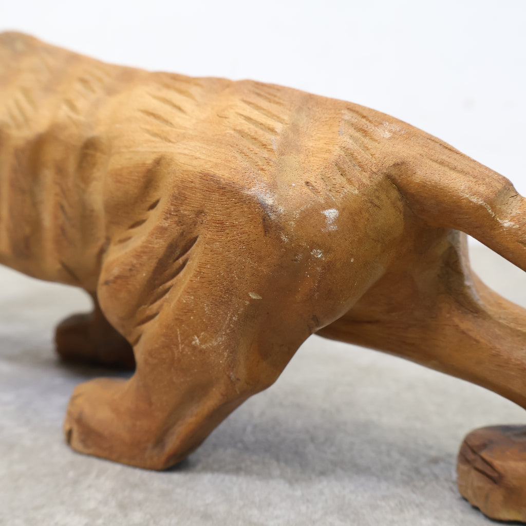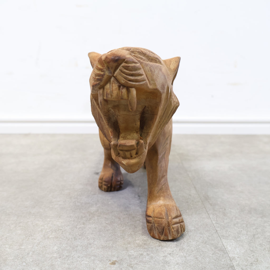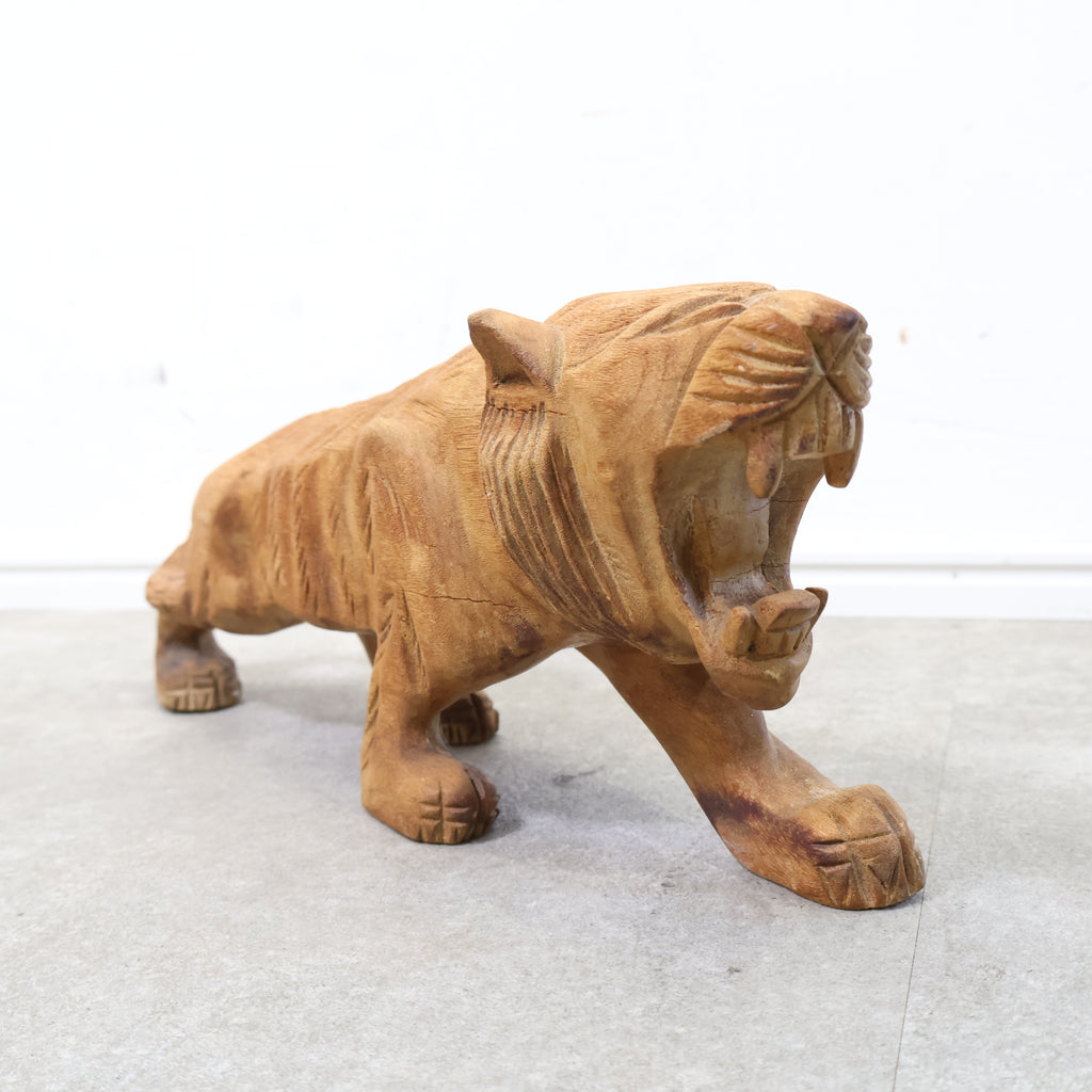 木彫りの虎の置物です。日本では虎は昔から勇敢や強者を象徴すると言われ、また邪気や悪気の侵入を防ぐ力があるといわれています。