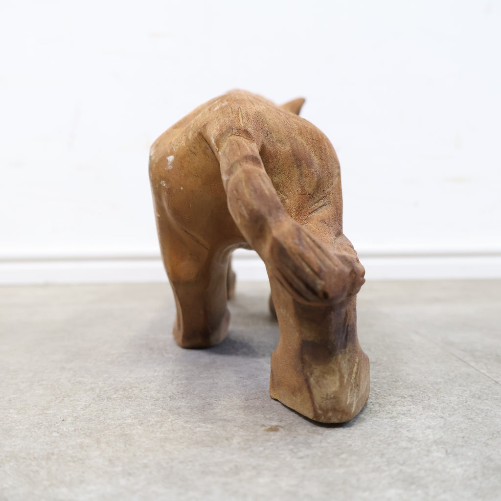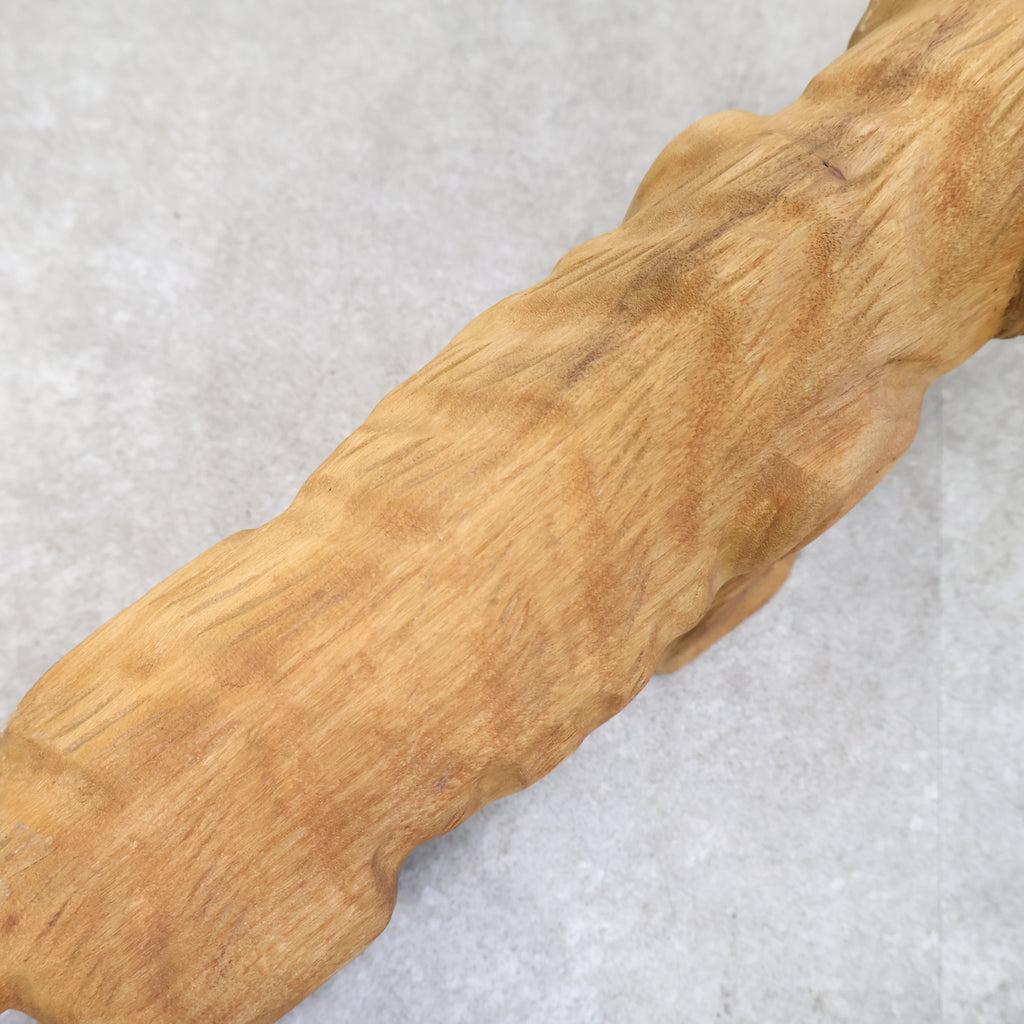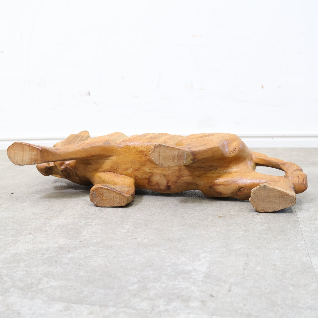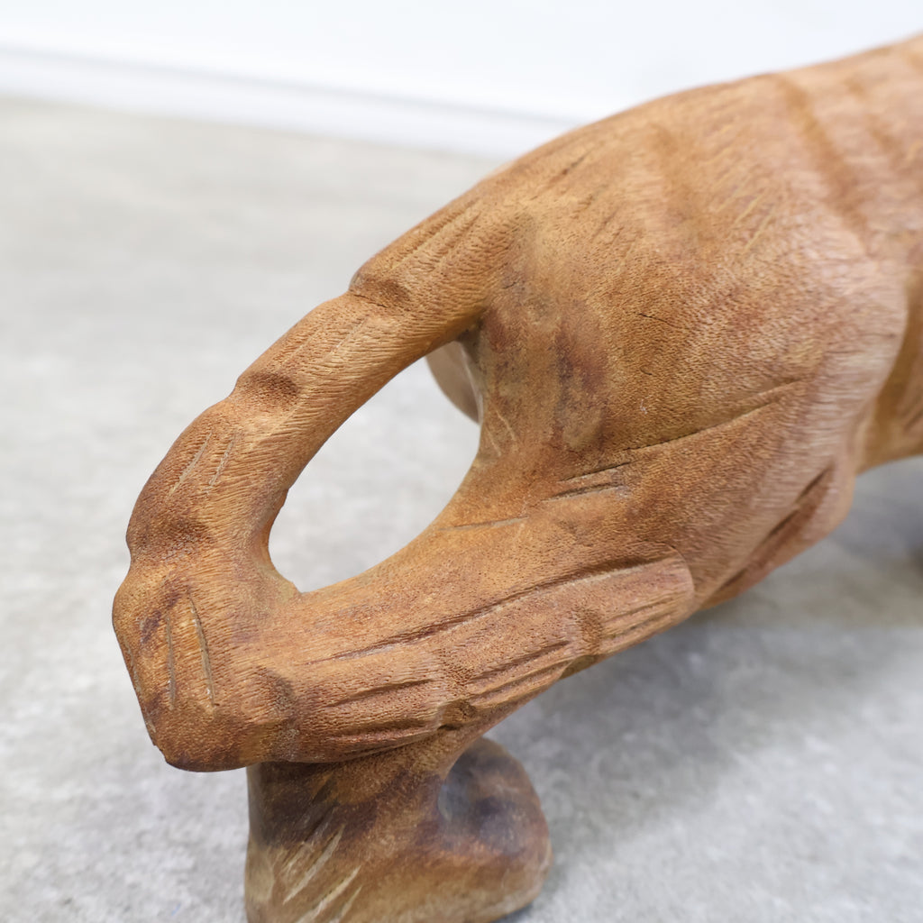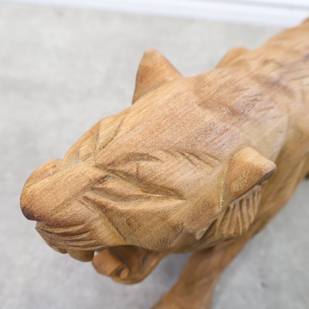 木彫りの虎の置物です。日本では虎は昔から勇敢や強者を象徴すると言われ、また邪気や悪気の侵入を防ぐ力があるといわれています。