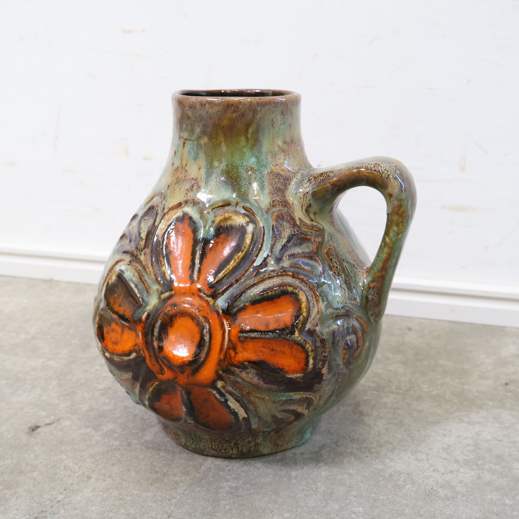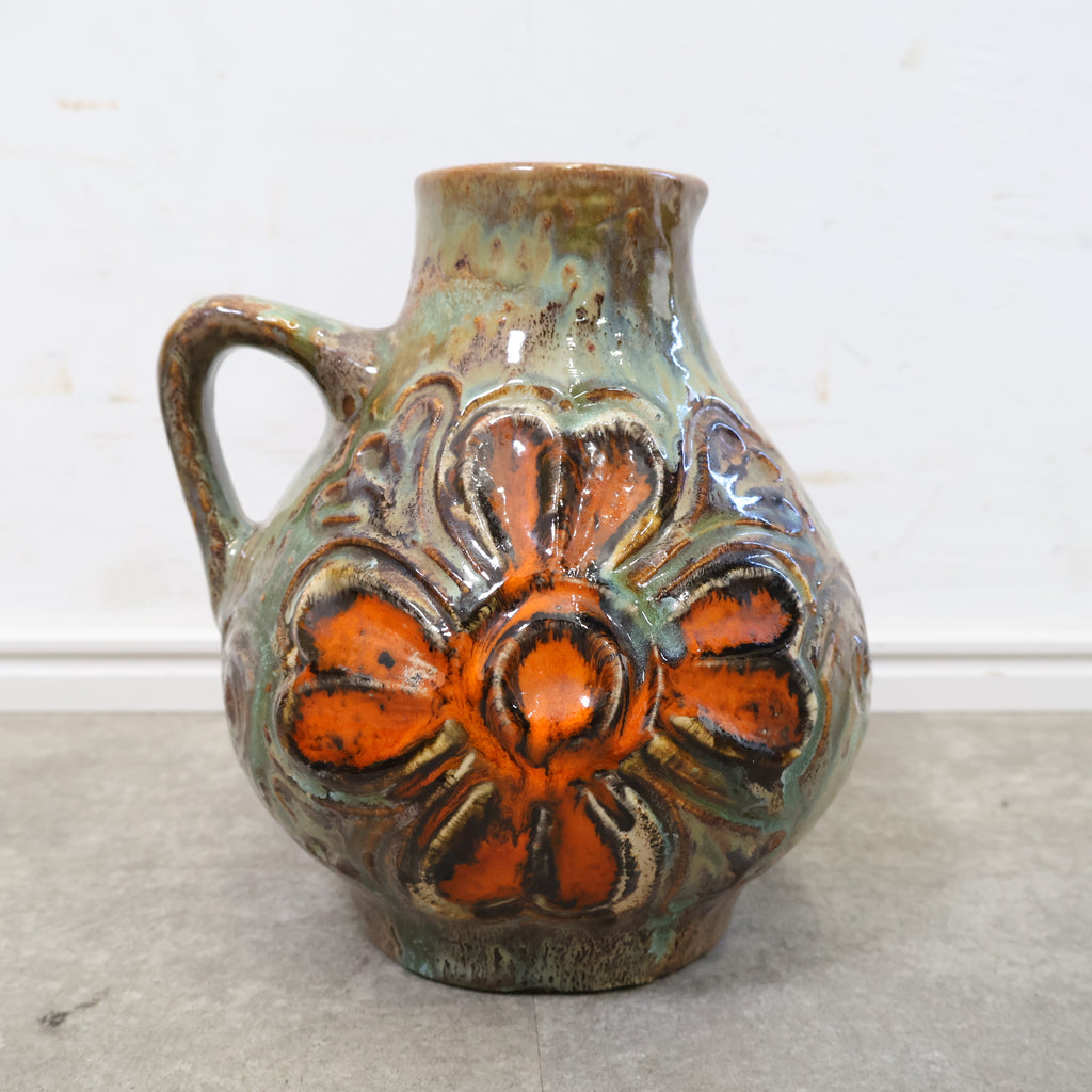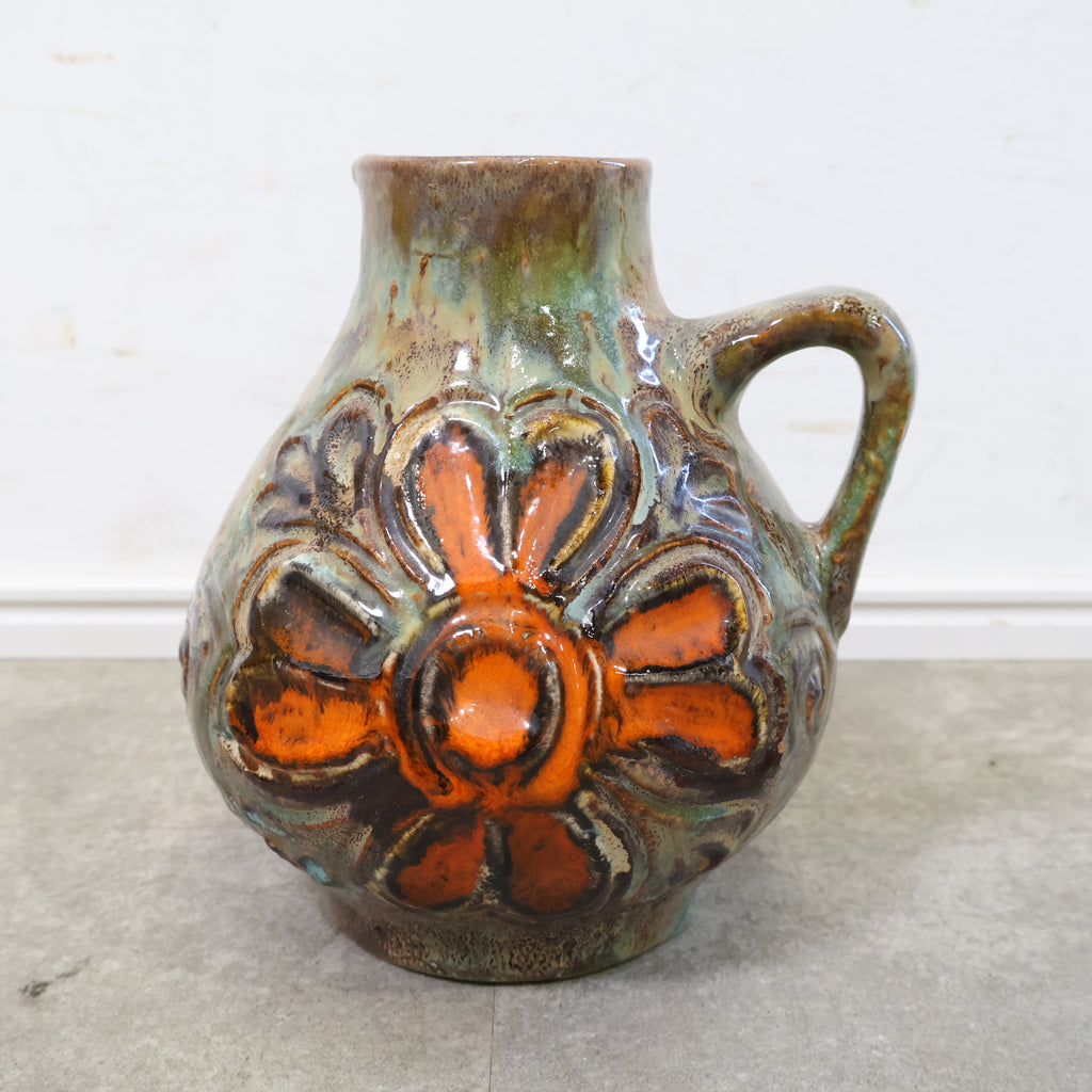 ドイツ製ヴィンテージのフラワーベースです。独創性のある大胆なお花の絵柄とデザインは、見ているだけで引き込まれるようですね。