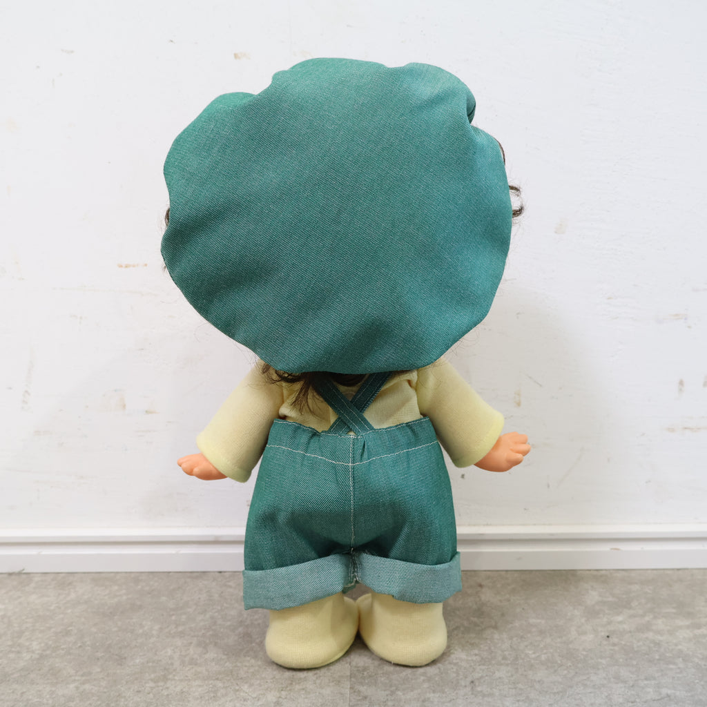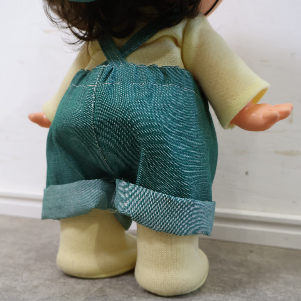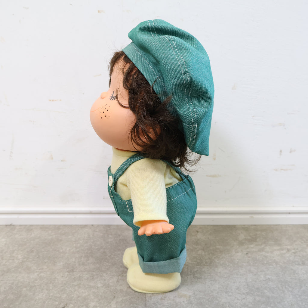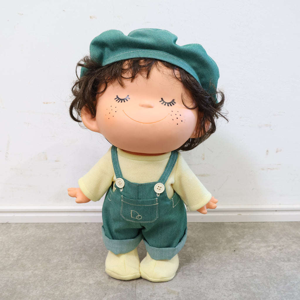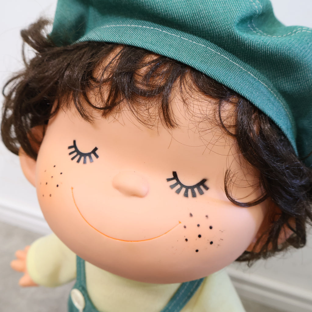 レトロなソフビ人形です。ほっぺのそばかすと優しい雰囲気が特徴的で、不動の人気アイテムです。グリーンのオーバーオールがカジュアルで可愛らしく、見ているだけで癒されますね。