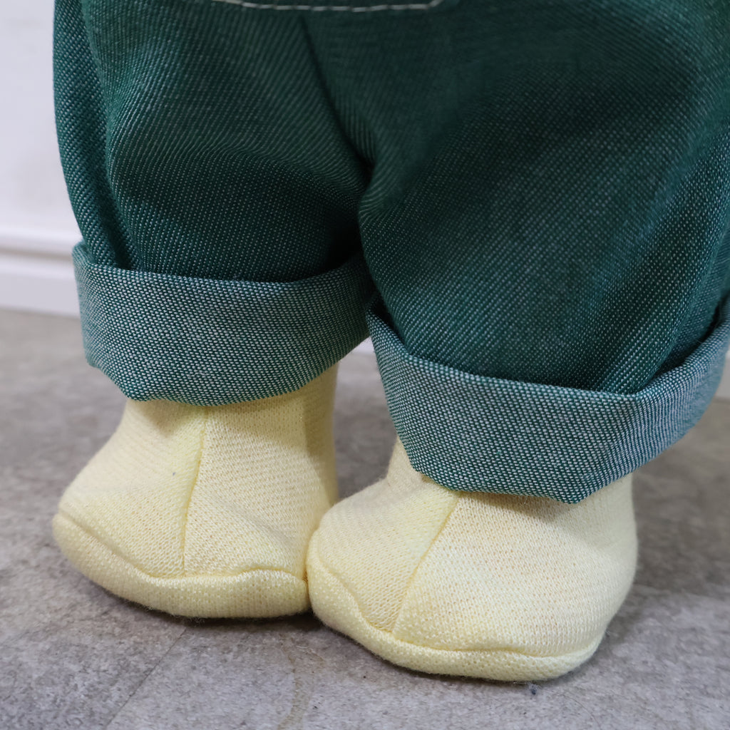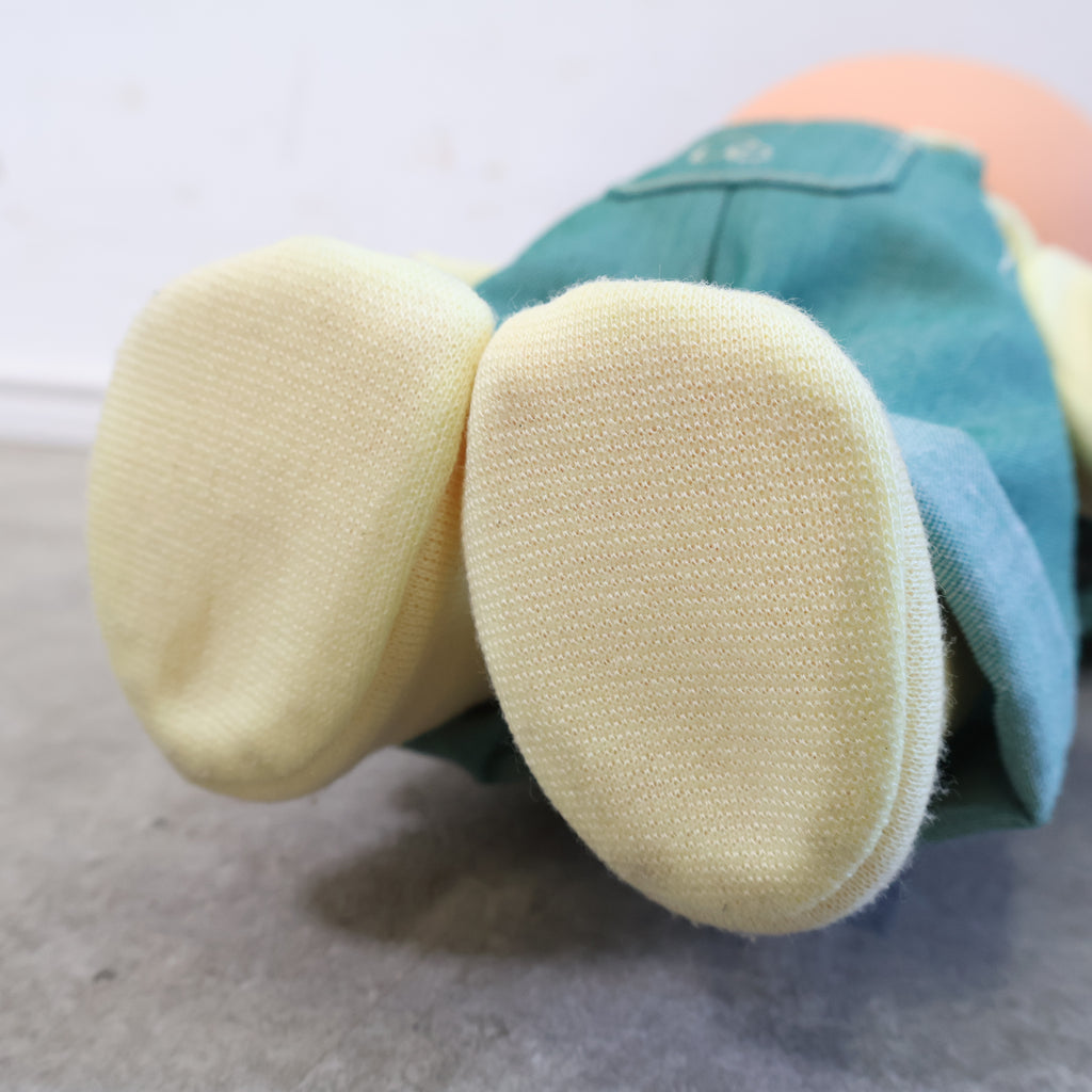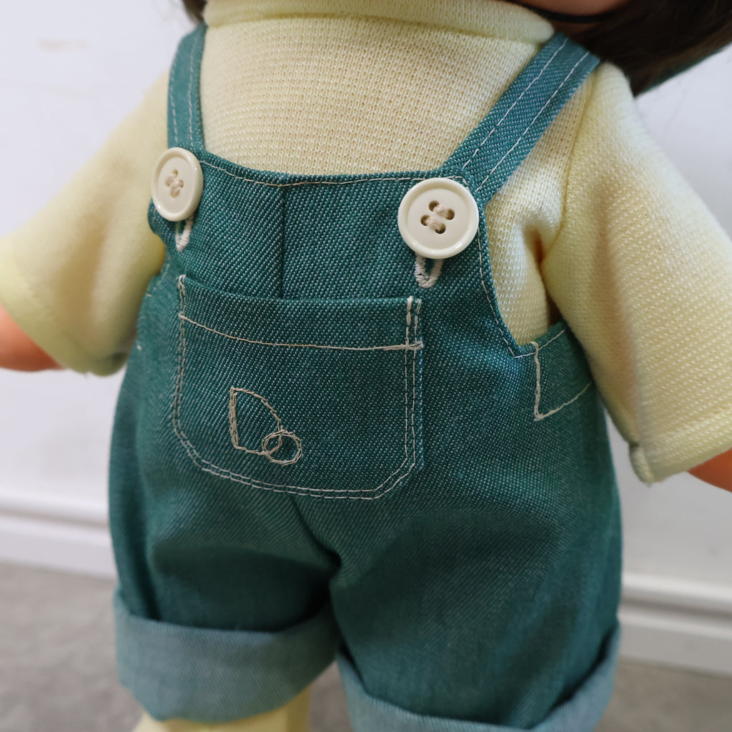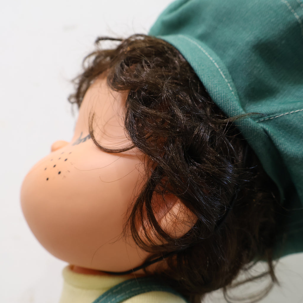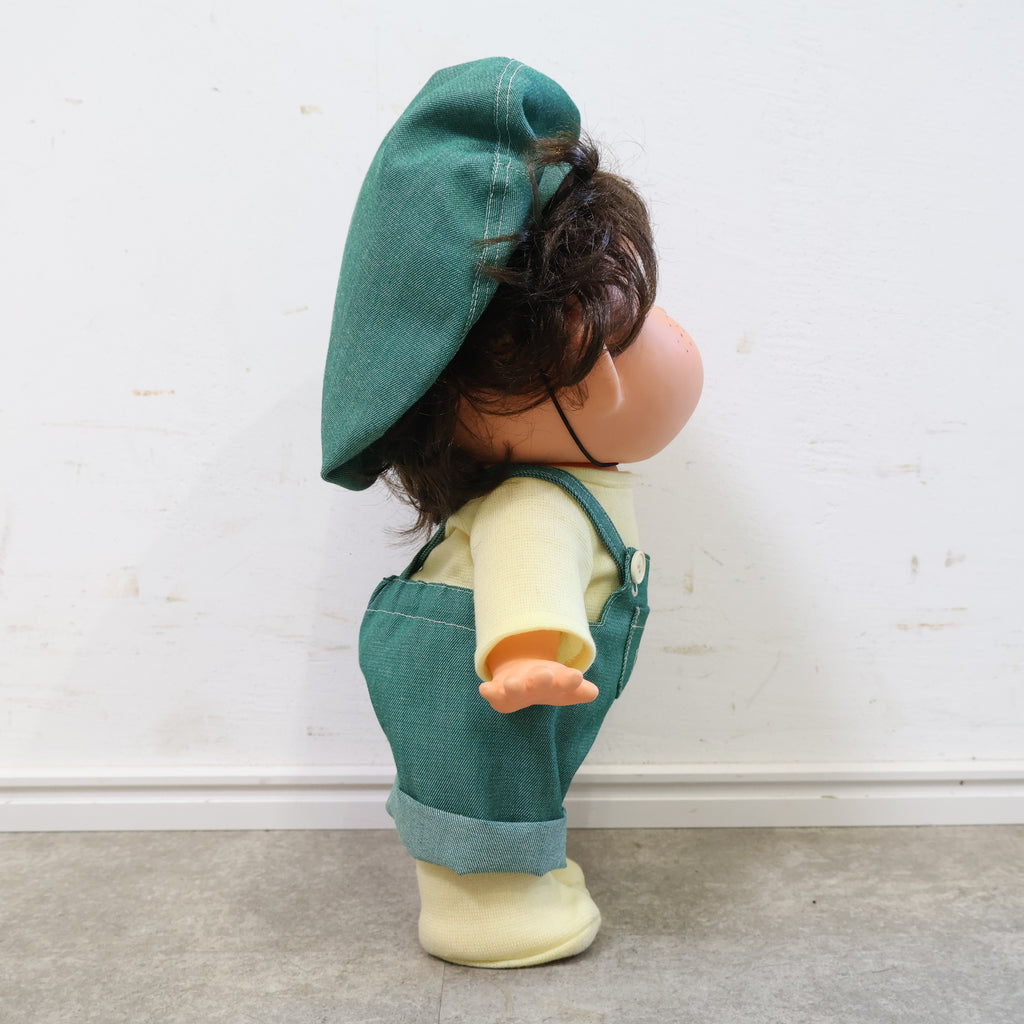 レトロなソフビ人形です。ほっぺのそばかすと優しい雰囲気が特徴的で、不動の人気アイテムです。グリーンのオーバーオールがカジュアルで可愛らしく、見ているだけで癒されますね。