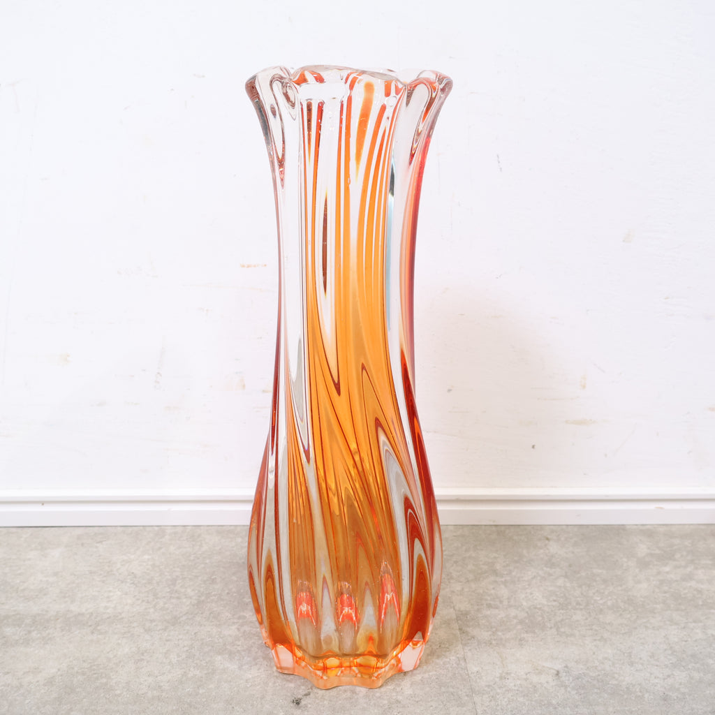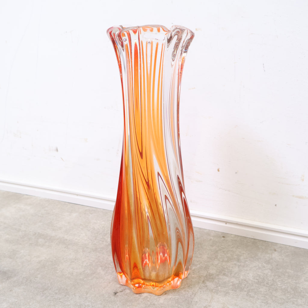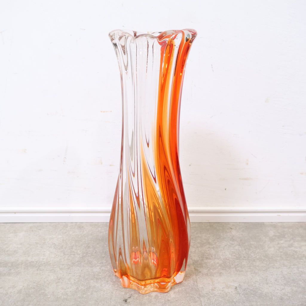 赤(オレンジ)とクリアガラスのコントラストが美しい、ツイストデザインの花瓶です。