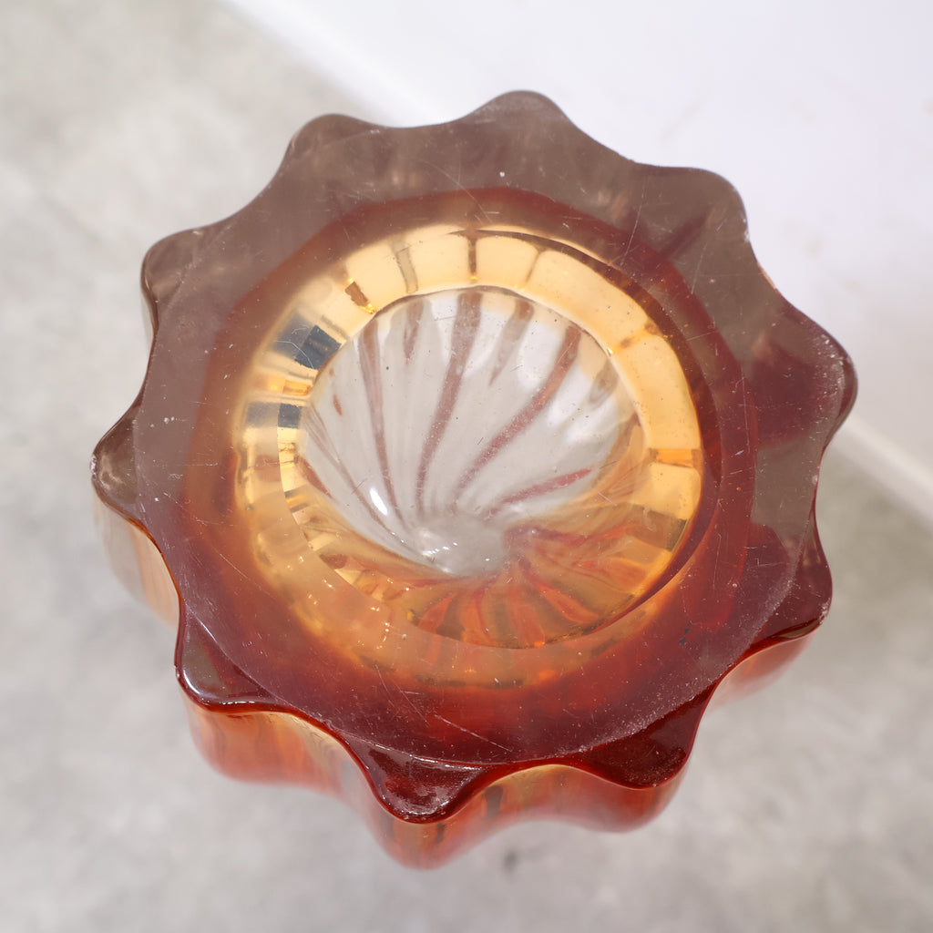 全体に施されたスパイラル状の模様が、見る角度によって表情を変え、手吹きガラスならではの温かみと躍動感を醸し出しています。口元と底のフリル状の処理もアクセントとなっています。 光を通すと、鮮やかな色彩がお部屋を明るく彩ります。