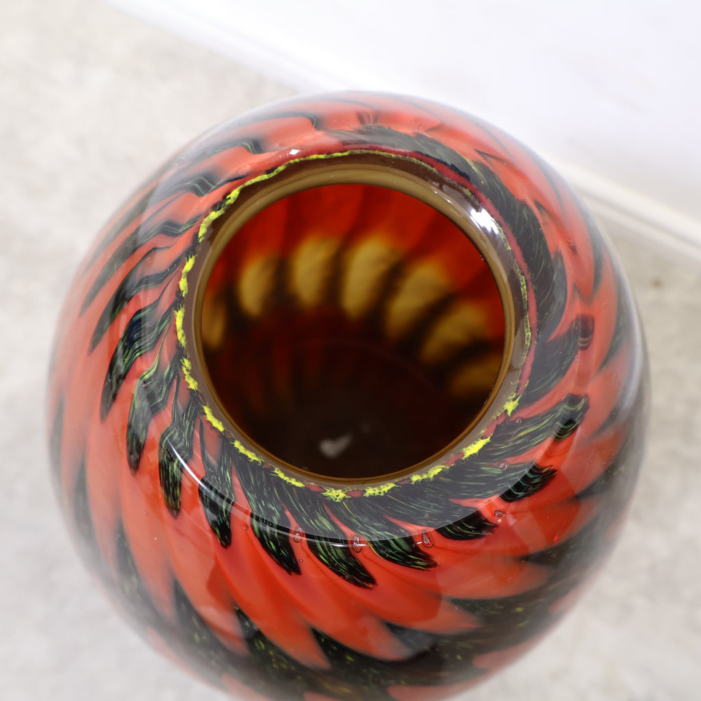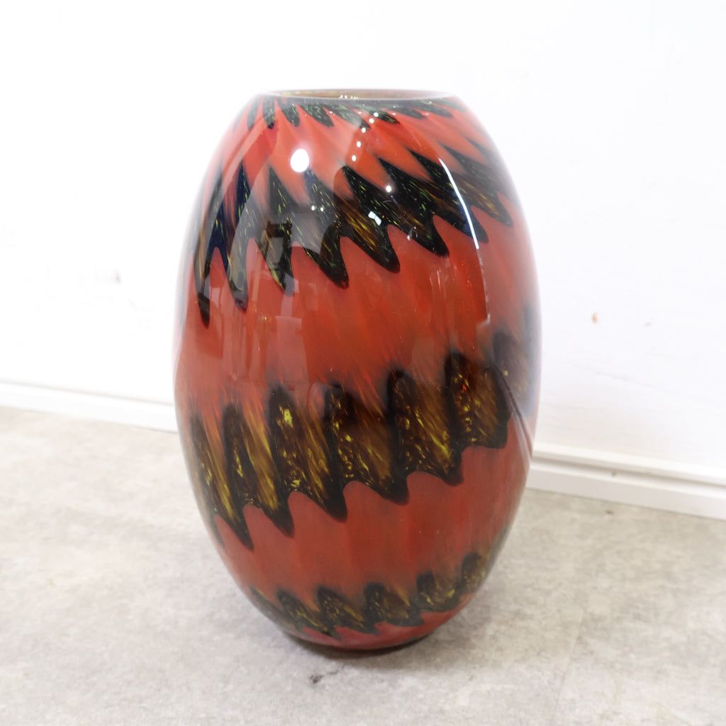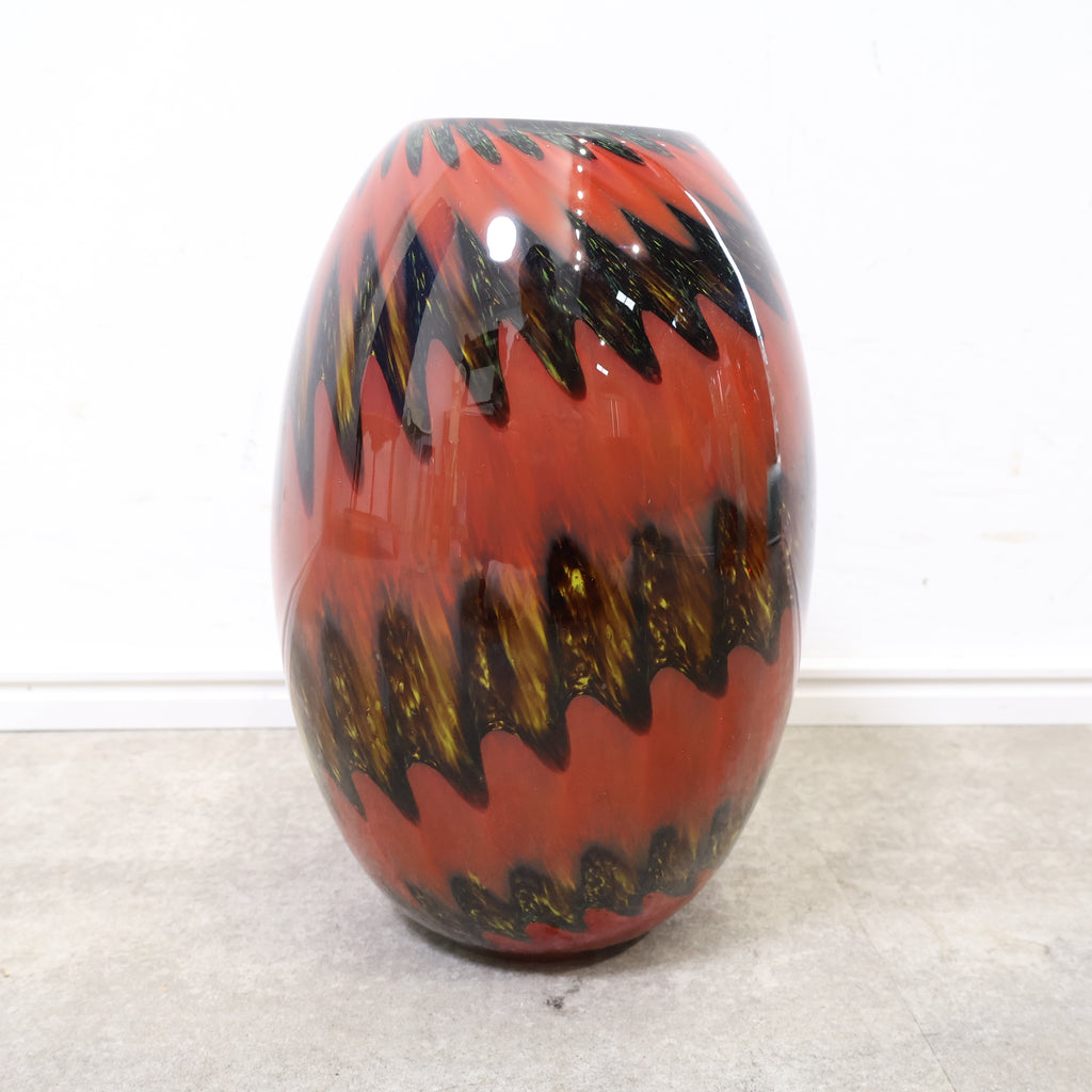 情熱的な赤色をベースに、黒と黄色の斑模様(ジグザグ状)が施された、卵型(オーバル型)のガラス花瓶です。