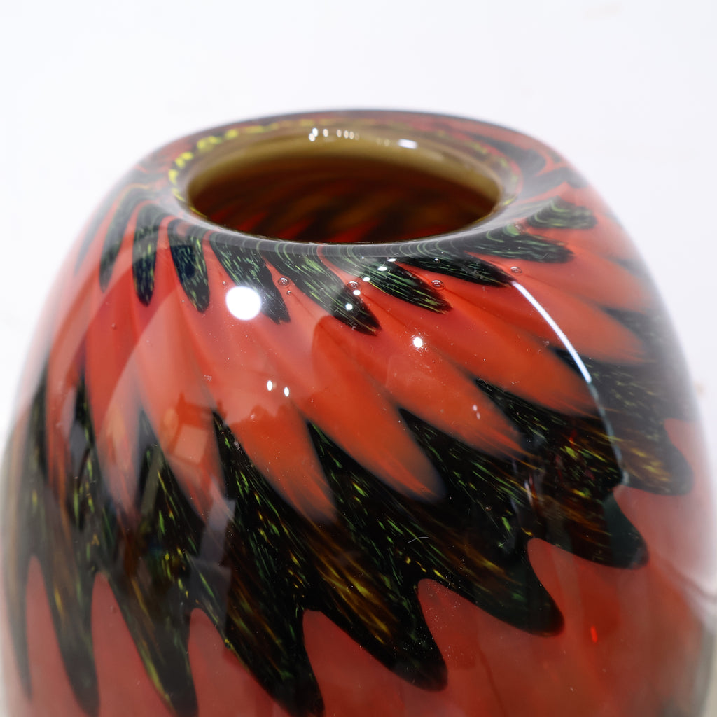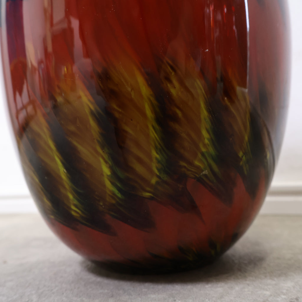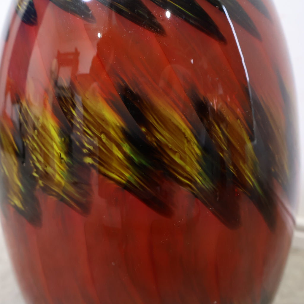 情熱的な赤色をベースに、黒と黄色の斑模様(ジグザグ状)が施された、卵型(オーバル型)のガラス花瓶です。