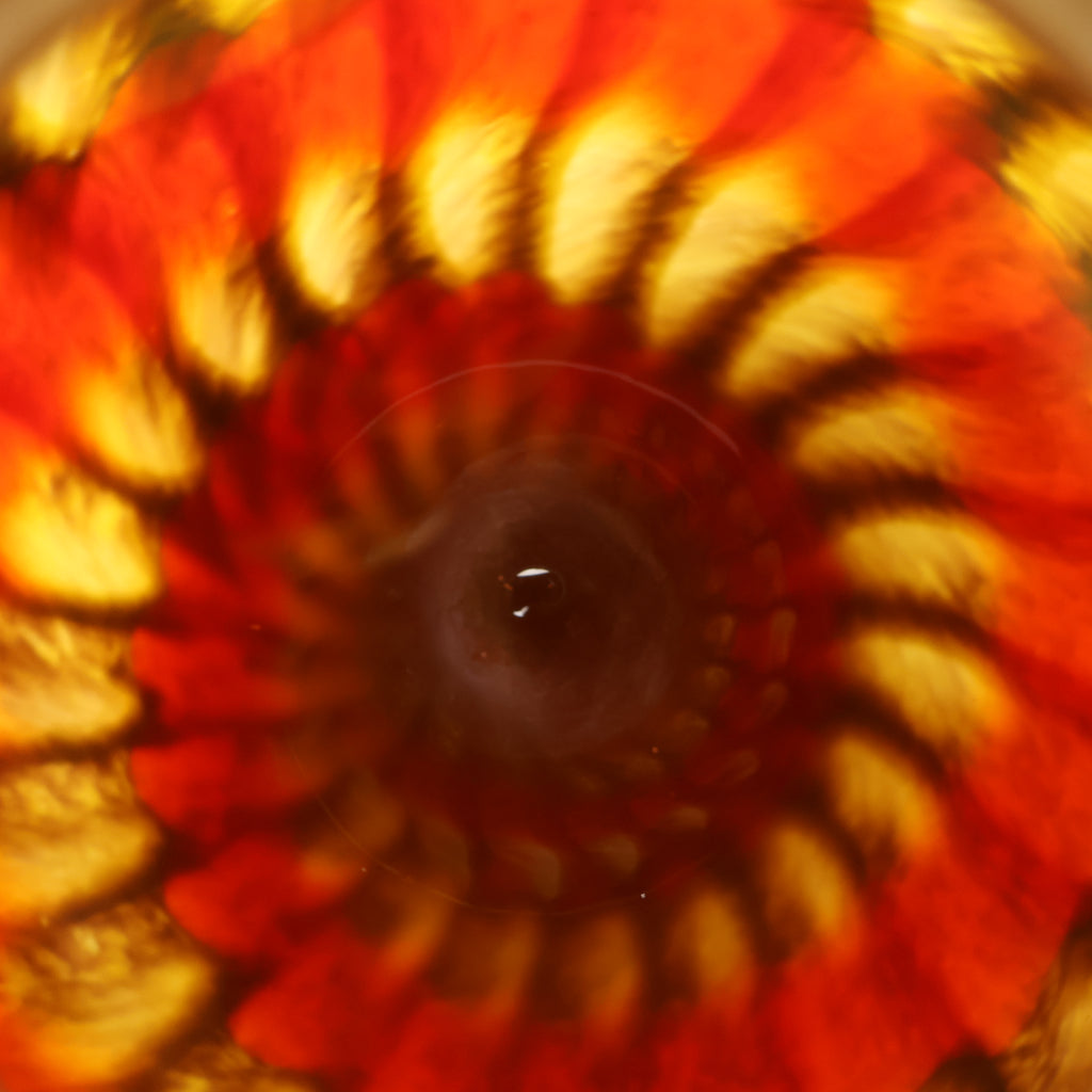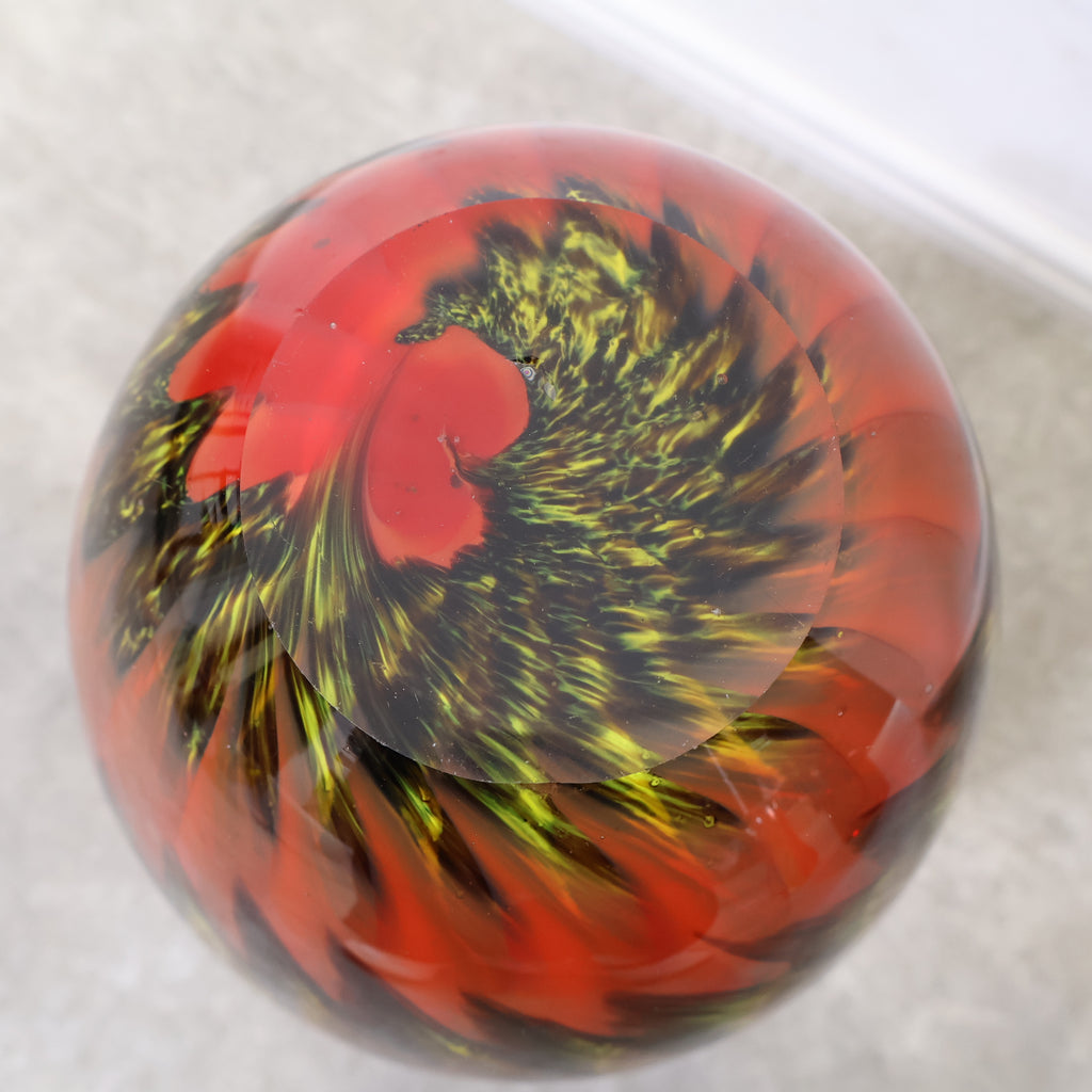 光沢のあるガラスと大胆な色使いが、強いインパクトを与えます。まるで炎や溶岩のような、躍動感のある模様が魅力です。 単体でオブジェとして飾るだけでも、お部屋の雰囲気をモダンでアーティスティックな空間に変えてくれます。