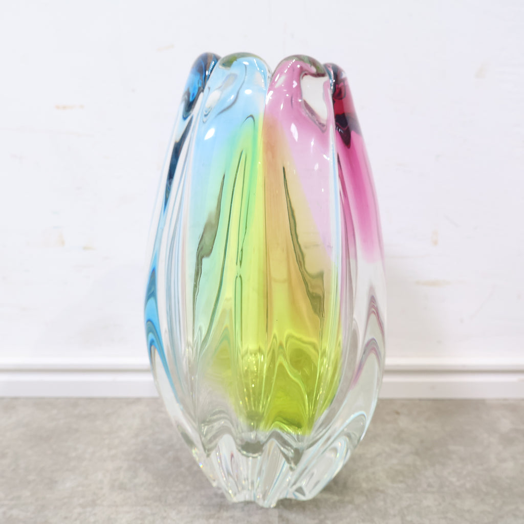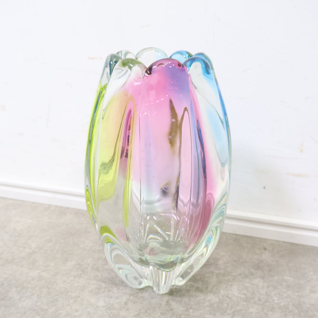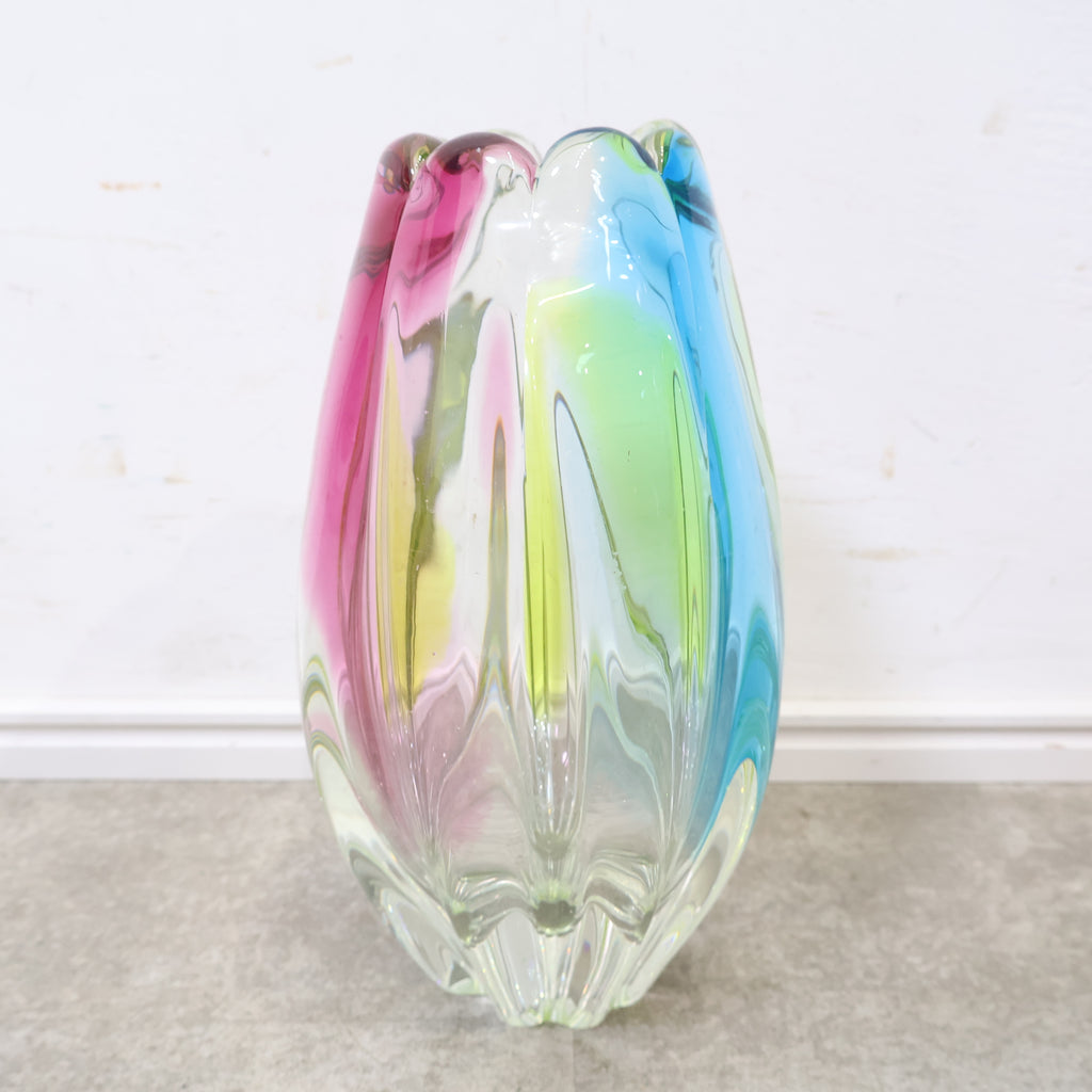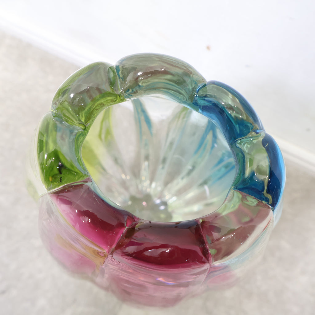 ピンク、ブルー、グリーンなどの多色使いが目を引く、アーティスティックなガラス花瓶です。