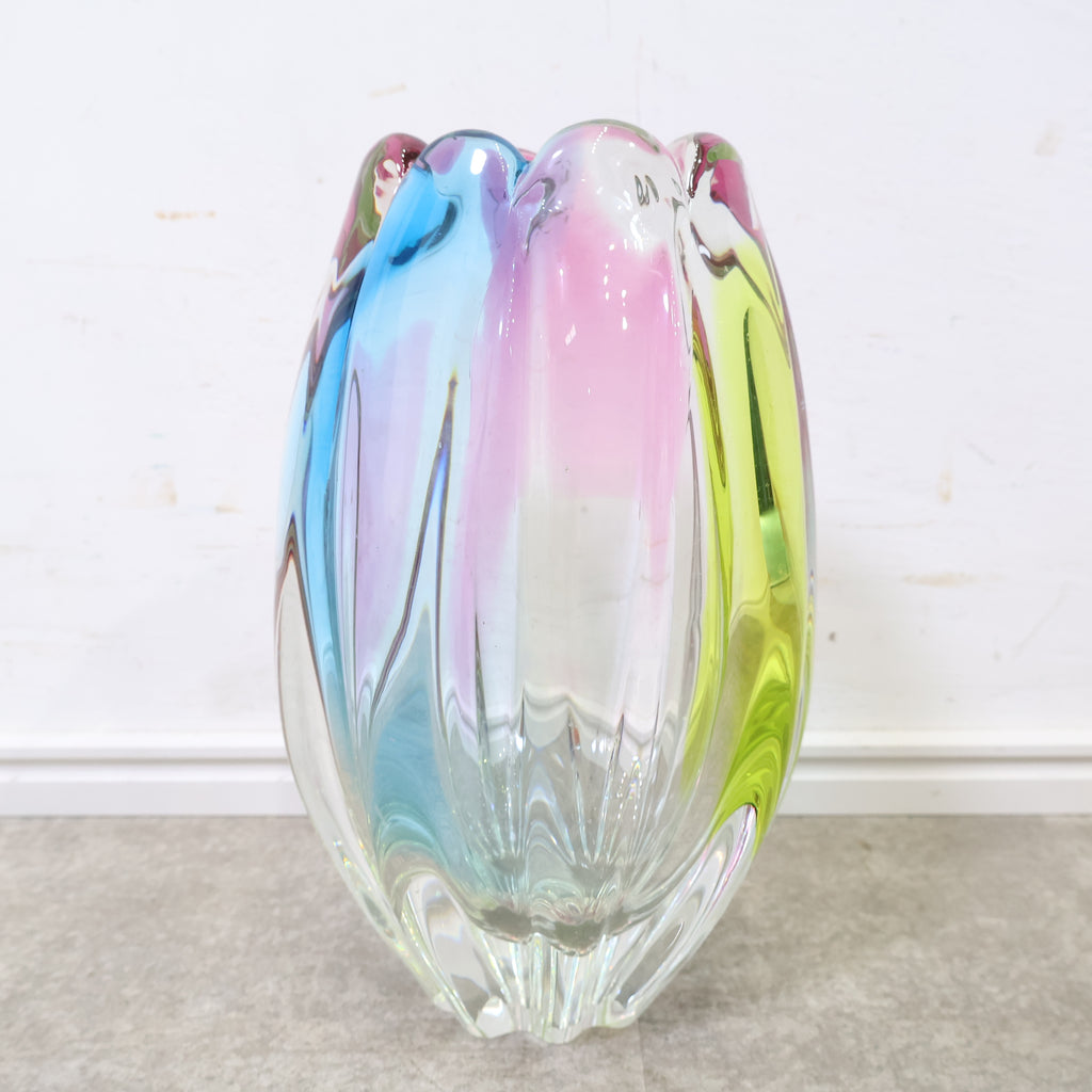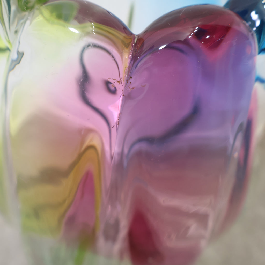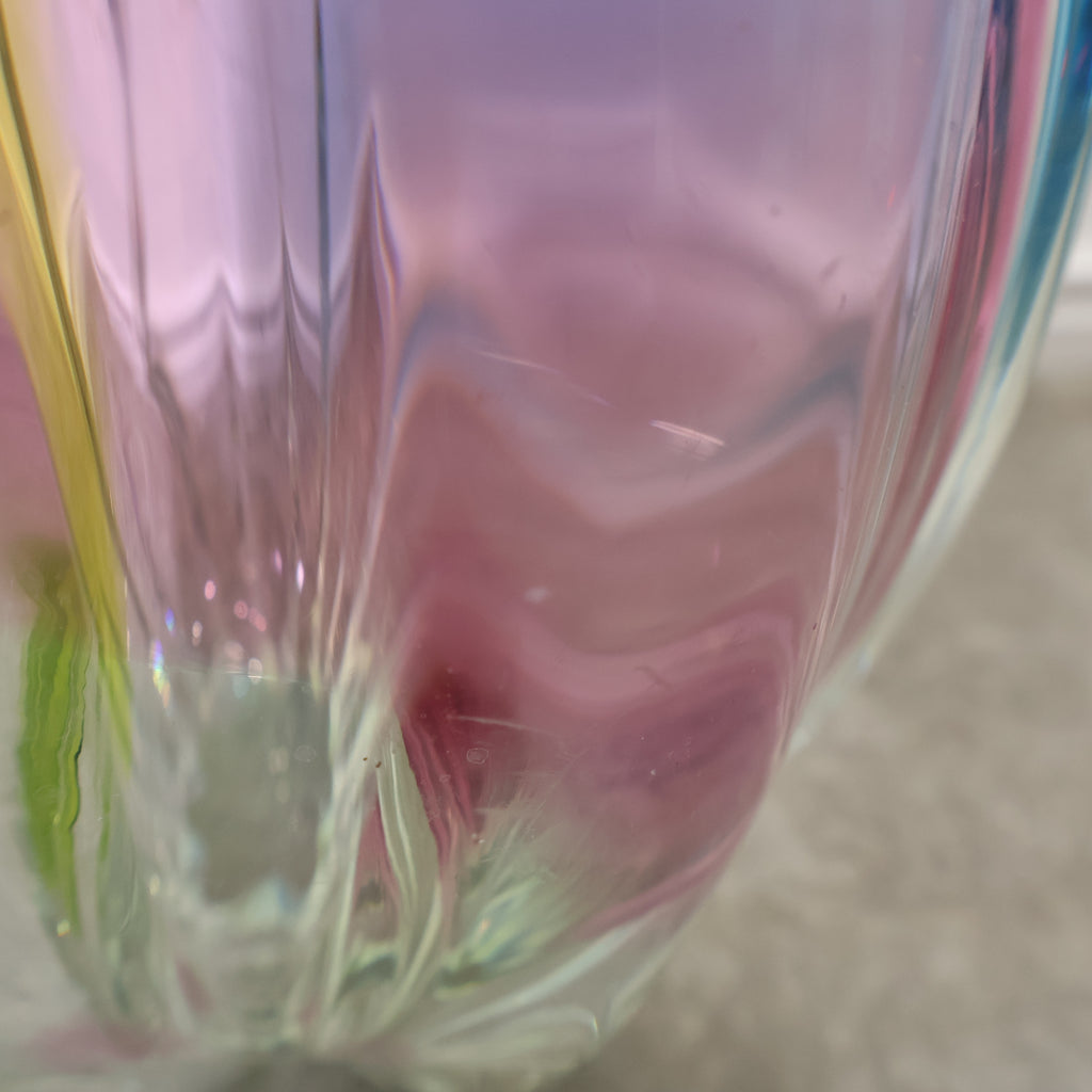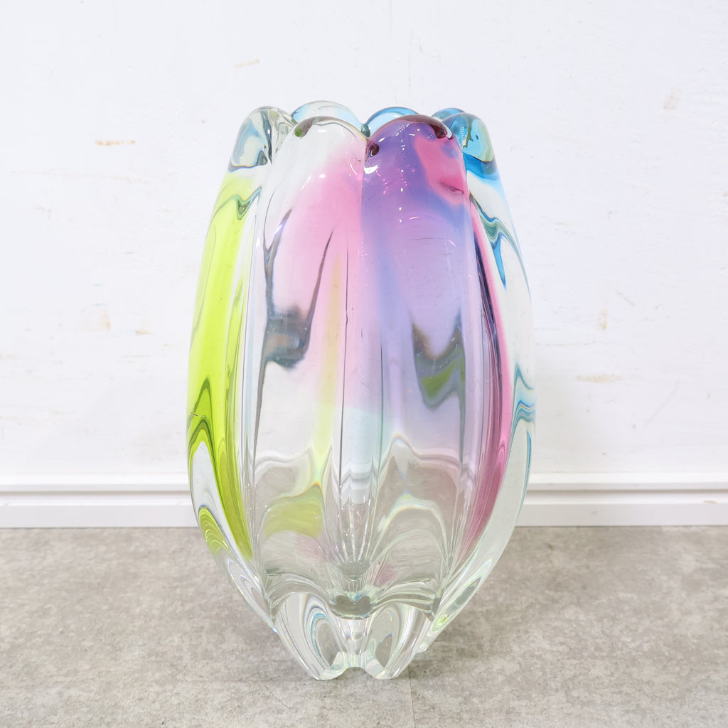 ピンク、ブルー、グリーンなどの多色使いが目を引く、アーティスティックなガラス花瓶です。
