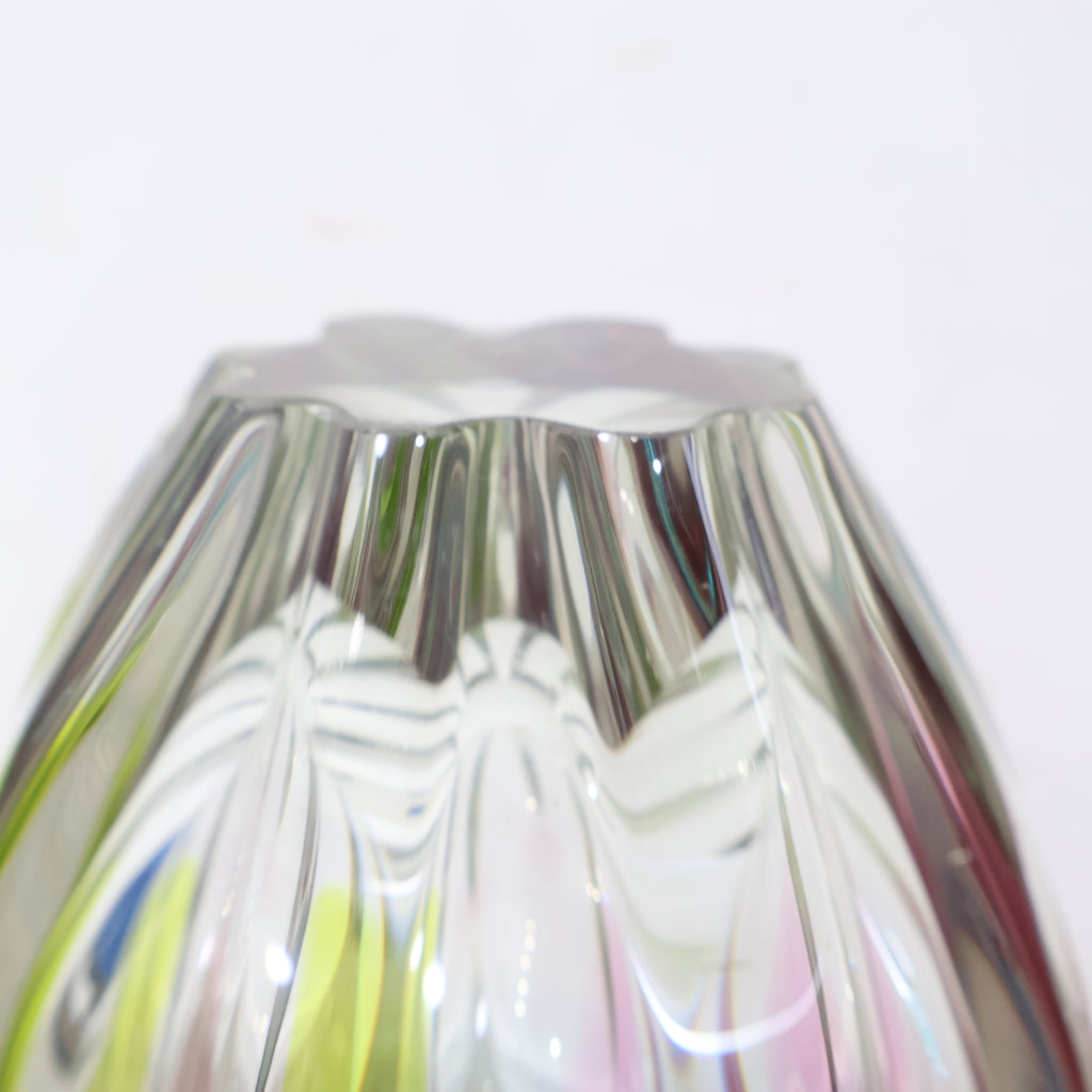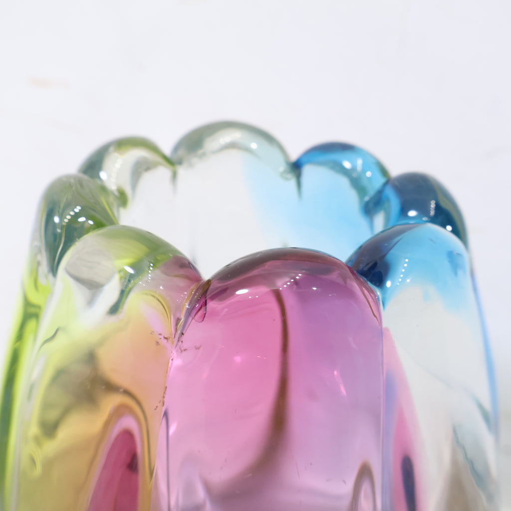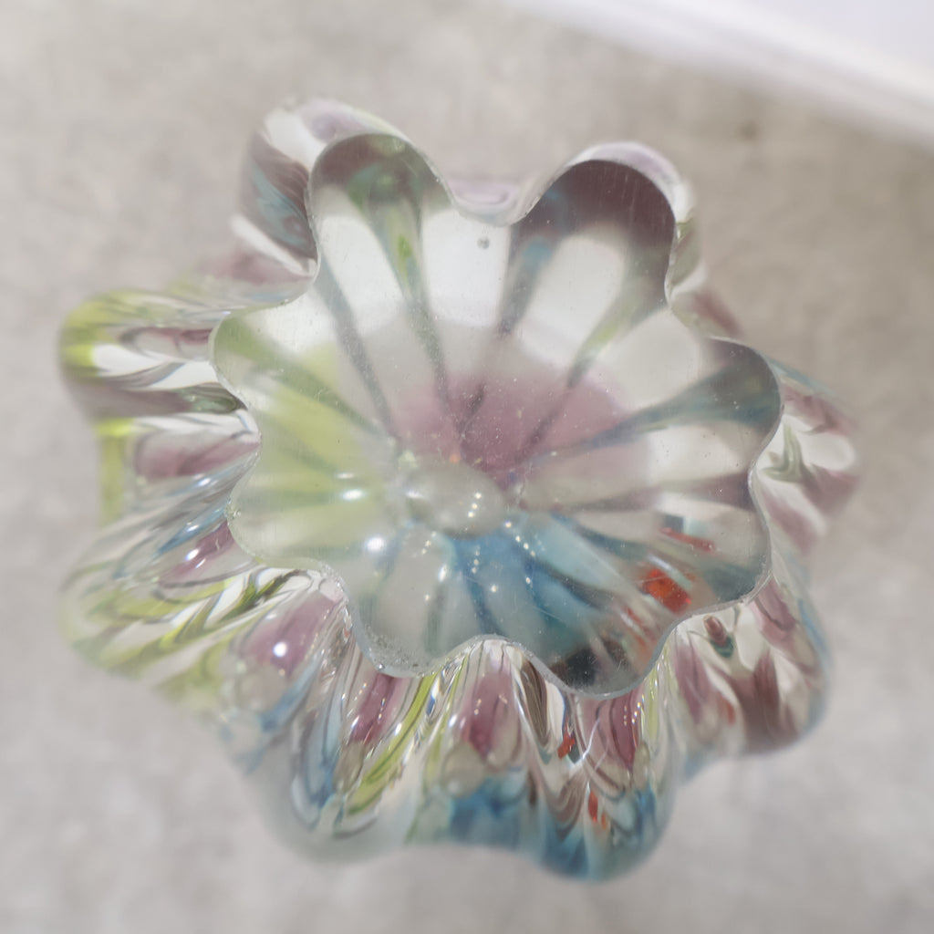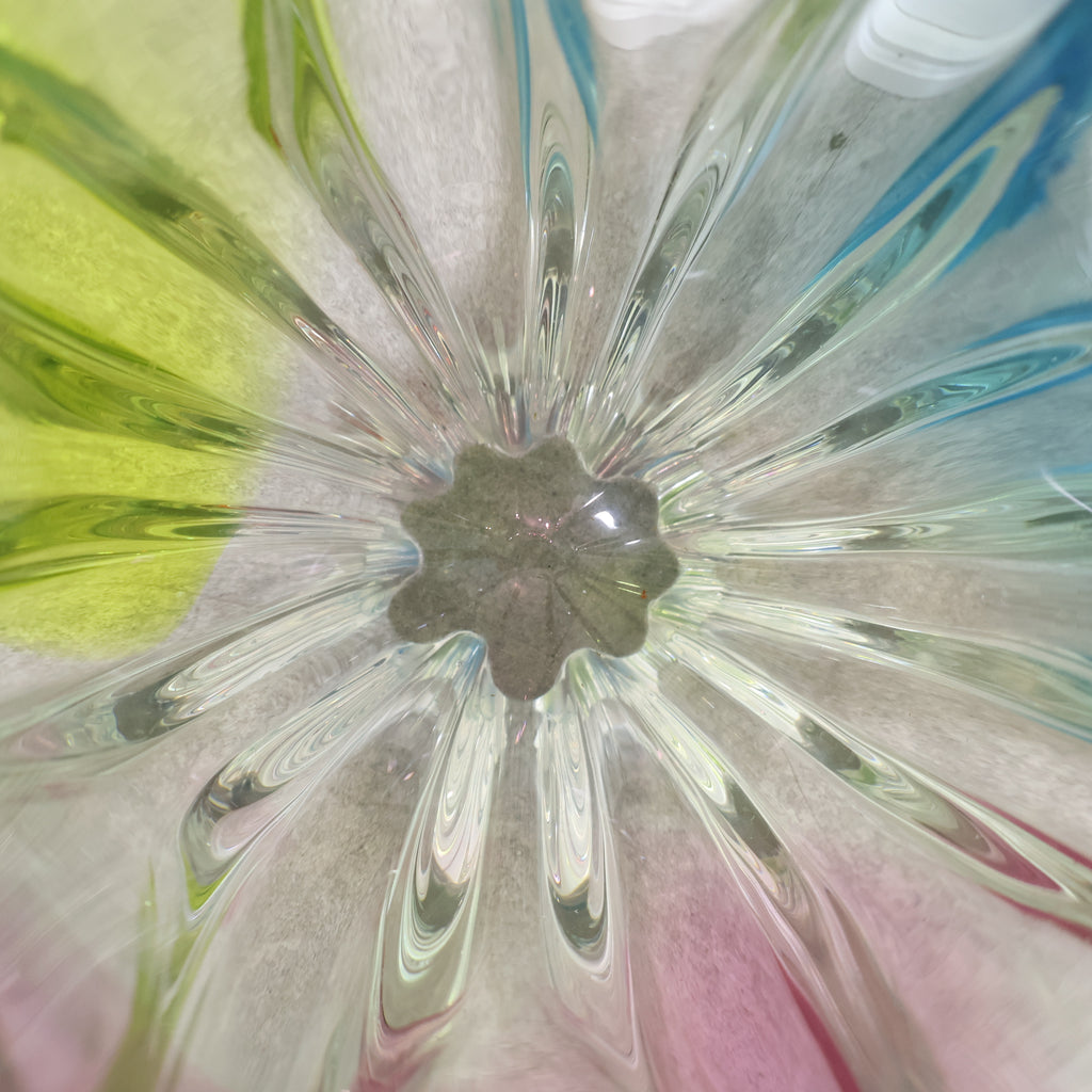 ピンク、ブルー、グリーンなどの多色使いが目を引く、アーティスティックなガラス花瓶です。